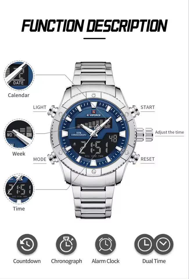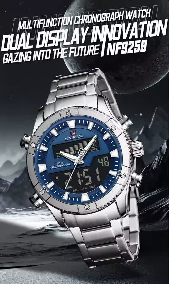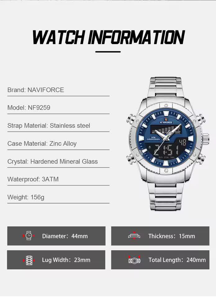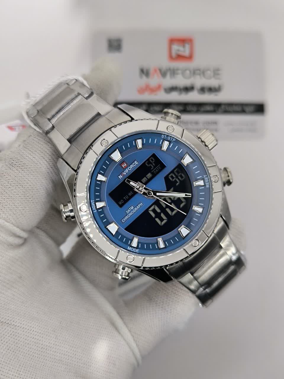 ساعت مچی مردانه عقربه ای و دیجیتال نیوی فورس NAVIFORCE مدل Nf9259 اورجینال با بند استیل توپُر نقره ای و صفحه آبی انتخابی قدرتمند و اسپرت برای آقایان خوش سلیقه است. این مدل با موتور ژاپنی تکنولوژی کوارتز دقت بالا نمایشگر همزمان آنالوگ و دیجیتال تقویم ثانیه شمار و آلارم امکانات کاملی را ارائه می دهد. قاب استیل مقاوم شیشه معدنی ضد خش خاصیت ضد آب و چراغ دید در شب دوام و کارایی ساعت را تضمین می کند. بند استیل ضد زنگ ضد حساسیت با قفل کلیپسی ضامن دار حس امنیت و راحتی را در استفاده روزمره فراهم می سازد. این ساعت به صورت اورجینال همراه با جعبه و کارت گارانتی و گارانتی نیوی فورس ایران از فروشگاه اینترنتی روبی مد عرضه می شود.