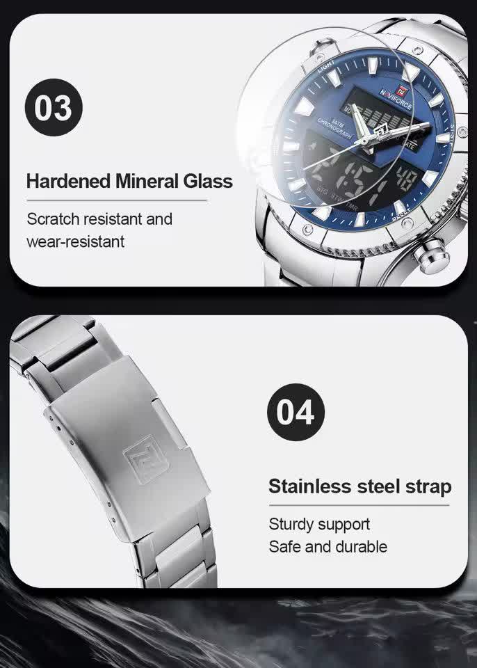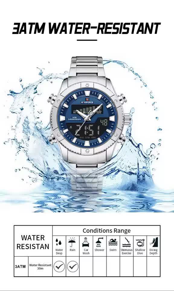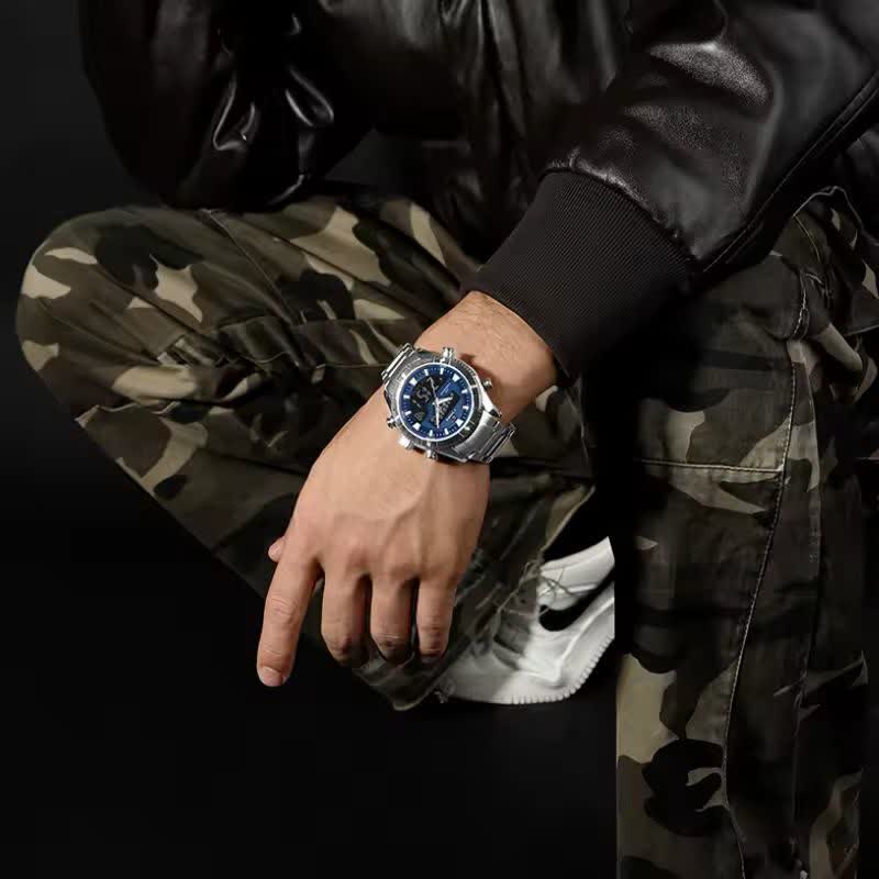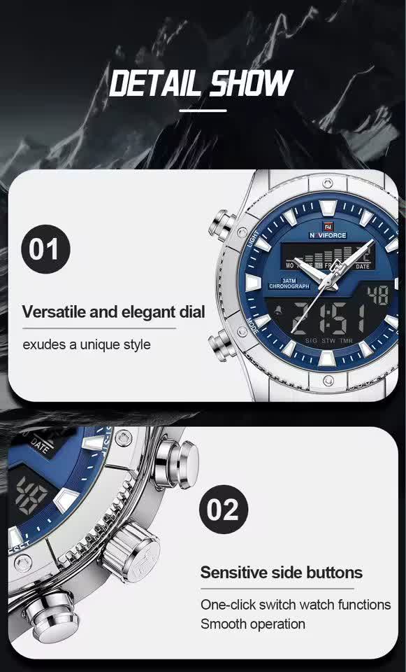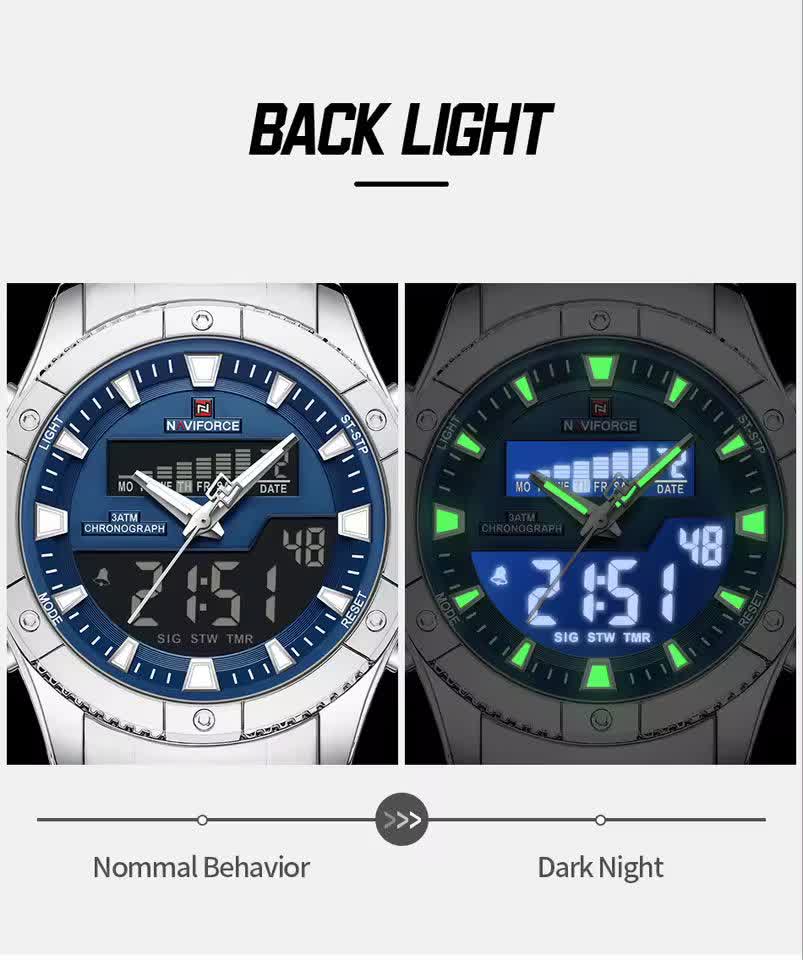 ساعت مچی مردانه عقربه ای و دیجیتال نیوی فورس NAVIFORCE مدل Nf9259 اورجینال با بند استیل توپُر نقره ای و صفحه آبی انتخابی قدرتمند و اسپرت برای آقایان خوش سلیقه است. این مدل با موتور ژاپنی تکنولوژی کوارتز دقت بالا نمایشگر همزمان آنالوگ و دیجیتال تقویم ثانیه شمار و آلارم امکانات کاملی را ارائه می دهد. قاب استیل مقاوم شیشه معدنی ضد خش خاصیت ضد آب و چراغ دید در شب دوام و کارایی ساعت را تضمین می کند. بند استیل ضد زنگ ضد حساسیت با قفل کلیپسی ضامن دار حس امنیت و راحتی را در استفاده روزمره فراهم می سازد. این ساعت به صورت اورجینال همراه با جعبه و کارت گارانتی و گارانتی نیوی فورس ایران از فروشگاه اینترنتی روبی مد عرضه می شود.