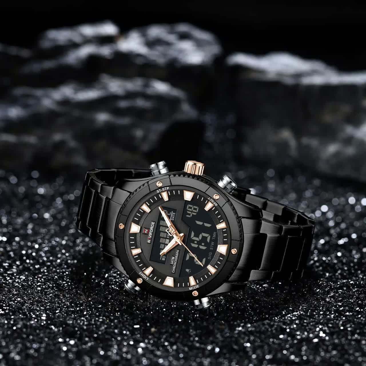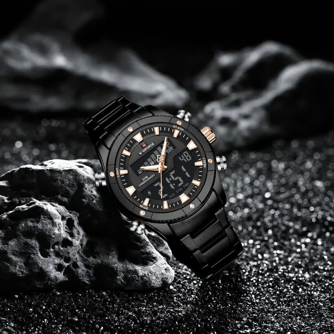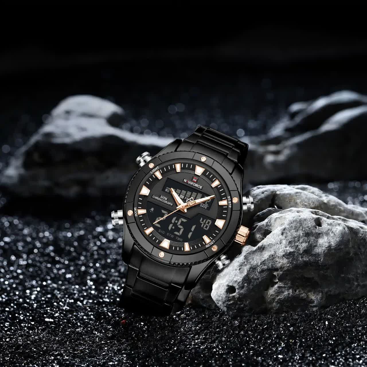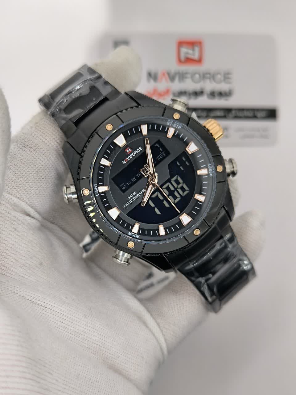 ساعت مچی مردانه عقربه ای و دیجیتال نیوی فورس NAVIFORCE مدل Nf9259 مشکی با طراحی قدرتمند و تمام مشکی گزینه ای خاص برای استایل های رسمی و اسپرت است. این مدل به موتور ژاپنی با تکنولوژی کوارتز دقت بالا نمایشگر همزمان آنالوگ و دیجیتال تقویم ثانیه شمار و آلارم مجهز شده است. قاب استیل مقاوم بند استیل توپُر ضد زنگ و ضد حساسیت با قفل کلیپسی ضامن دار در کنار شیشه معدنی ضد خش و خاصیت ضد آب دوام بالایی را فراهم می کند. چراغ دید در شب خوانایی ساعت را در نور کم افزایش می دهد و فرم صفحه دایره ای آن جلوه ای شیک دارد. این ساعت به صورت اورجینال همراه با جعبه و کارت گارانتی و گارانتی نیوی فورس ایران از فروشگاه اینترنتی روبی مد عرضه می شود.