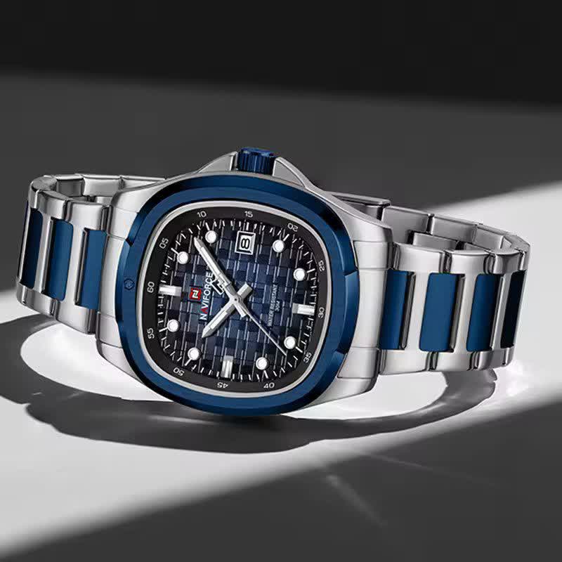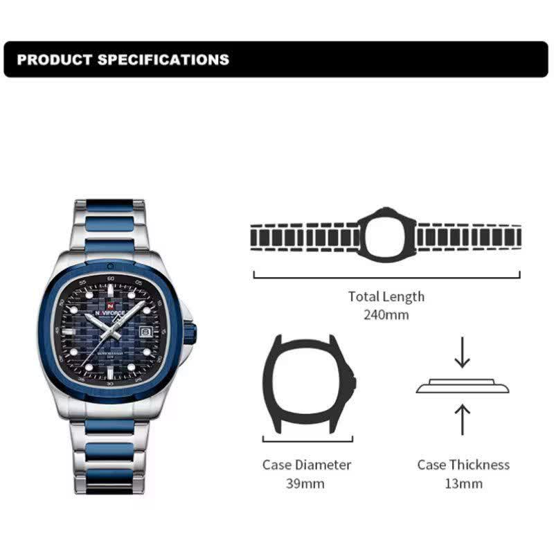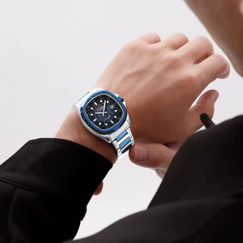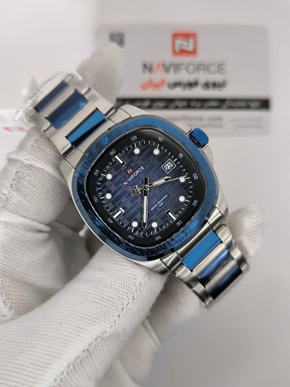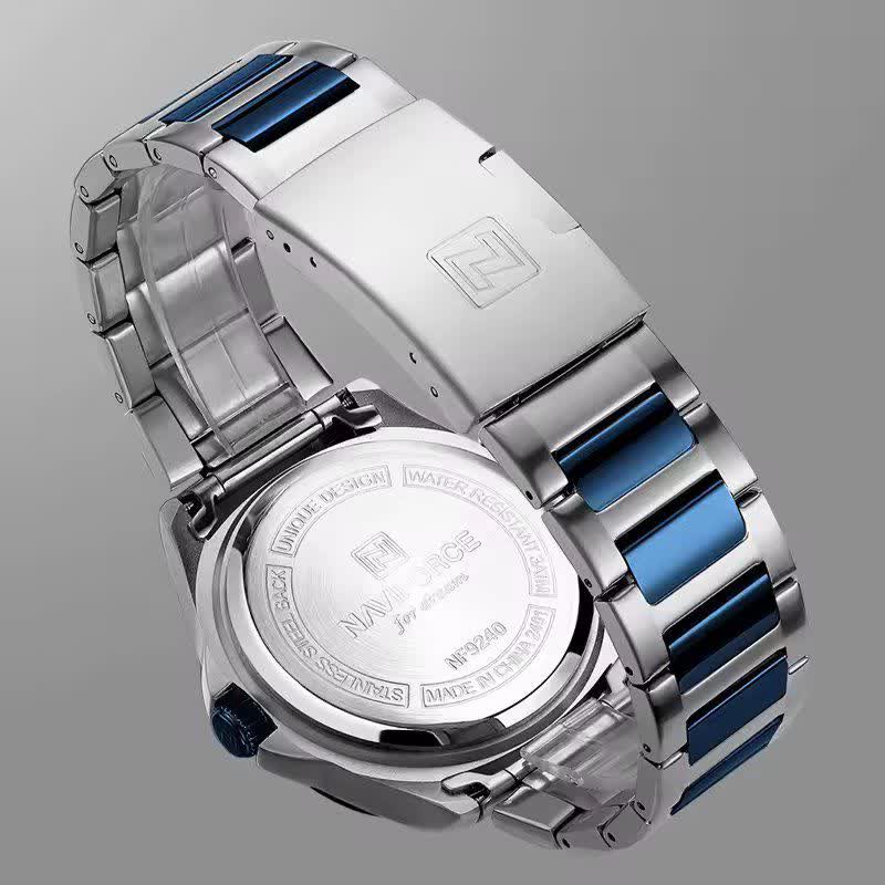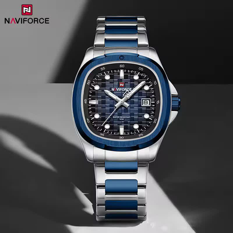 ساعت مچی عقربه ای مردانه نیوی فورس NAVIFORCE مدل NF9240 آبی انتخابی شیک و قدرتمند برای آقایانی است که به جزئیات اهمیت میدهند. این مدل با بند استیل توپُر رگه آبی و صفحه آبی با فرم مربع طرح پتک جلوهای خاص و مدرن دارد و به موتور ژاپن دقیق مجهز است. قاب استیل مقاوم شیشه معدنی ضد خش عقربه شب نما تقویم دار بودن و ضد آب بودن از ویژگیهای کاربردی آن هستند. بند استیل رنگ ثابت ضد حساسیت پوستی به همراه قفل کلیپسی ضامن دار راحتی و امنیت استفاده را تضمین میکند. این ساعت ارجینال با جعبه کارت گارانتی و گارانتی نیوی فورس ایران از فروشگاه اینترنتی روبی مد عرضه میشود چون خاص بودن اتفاقی نیست.