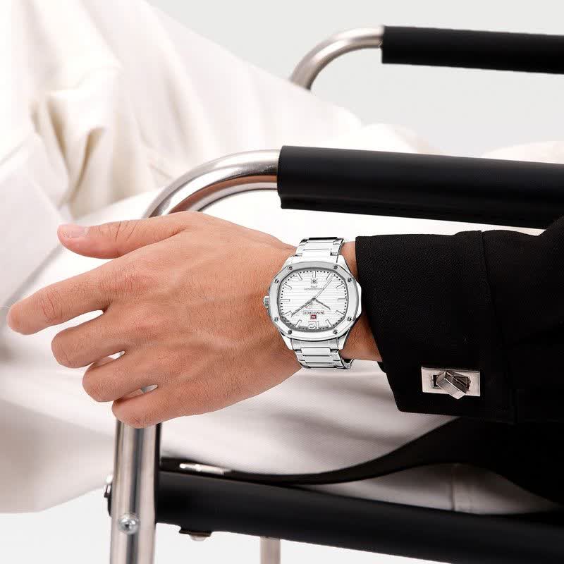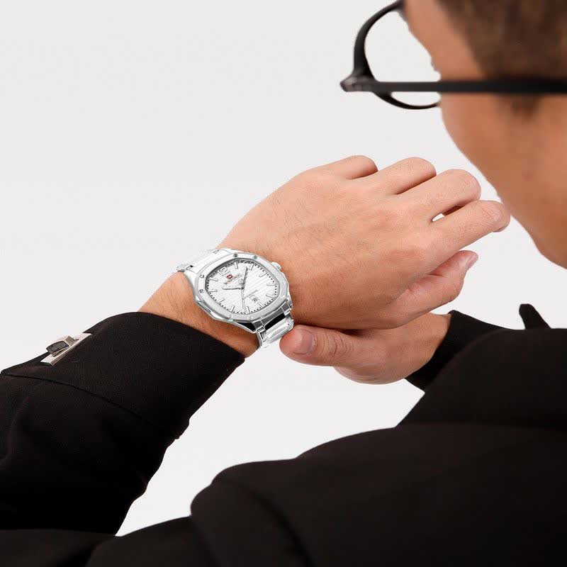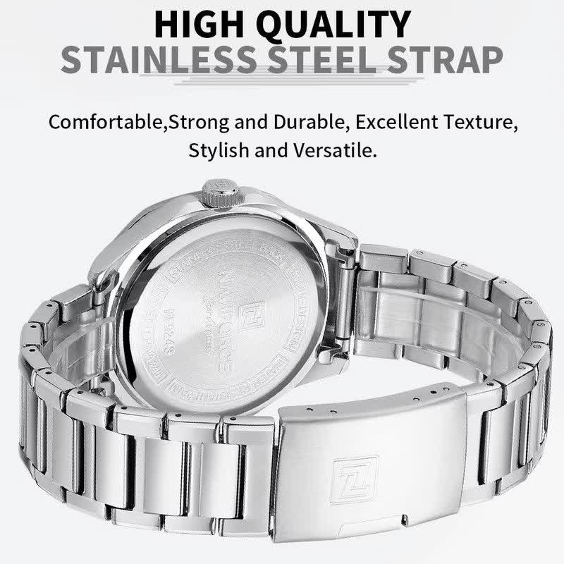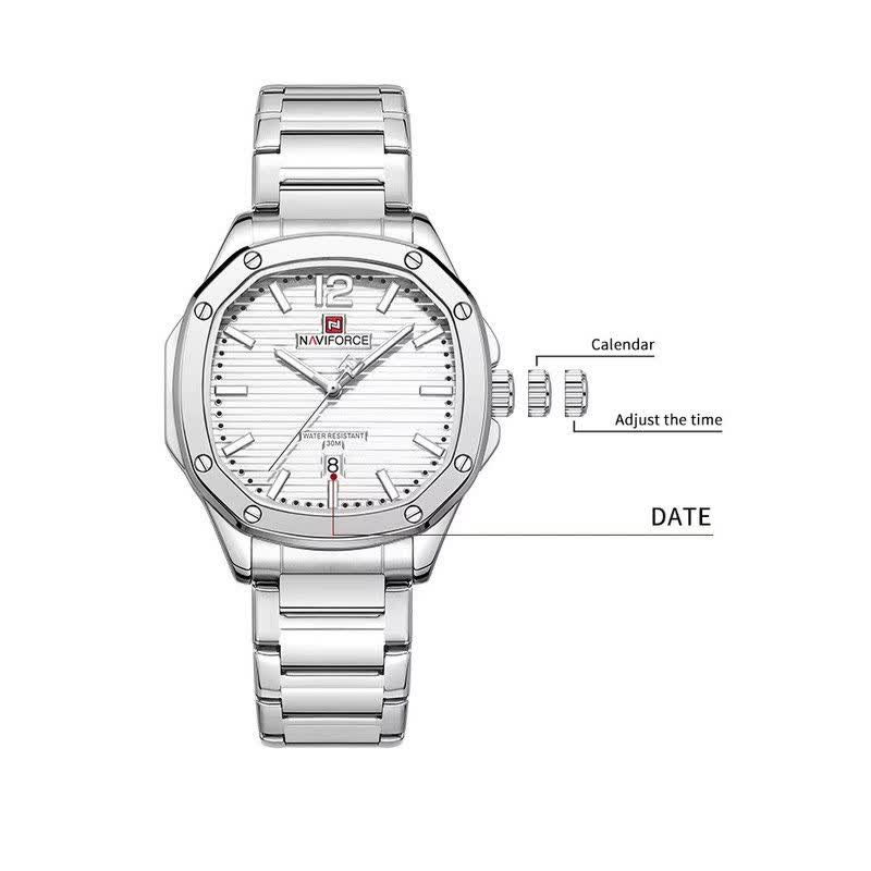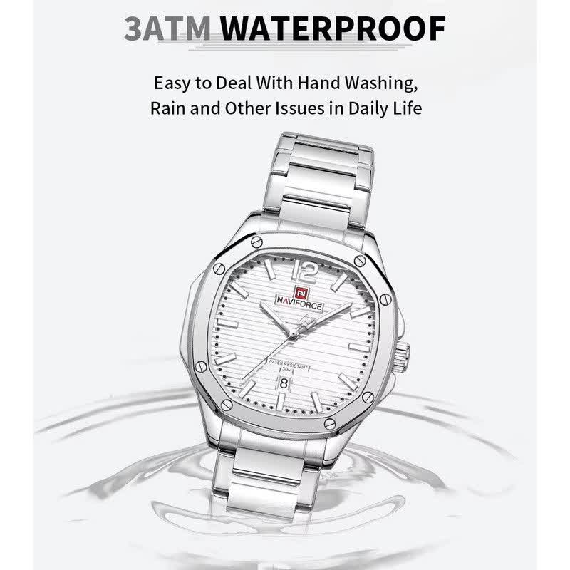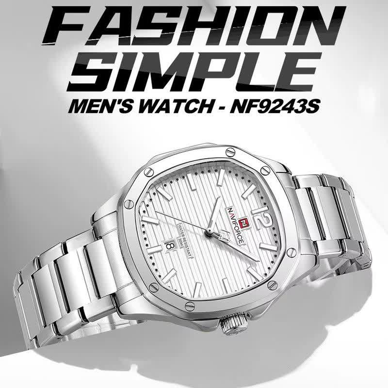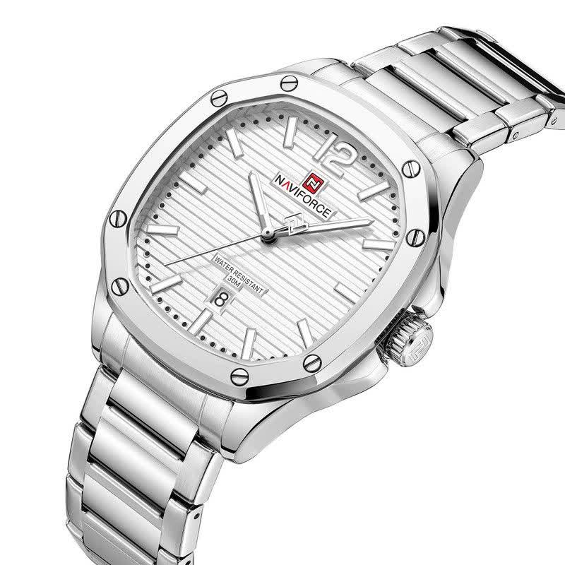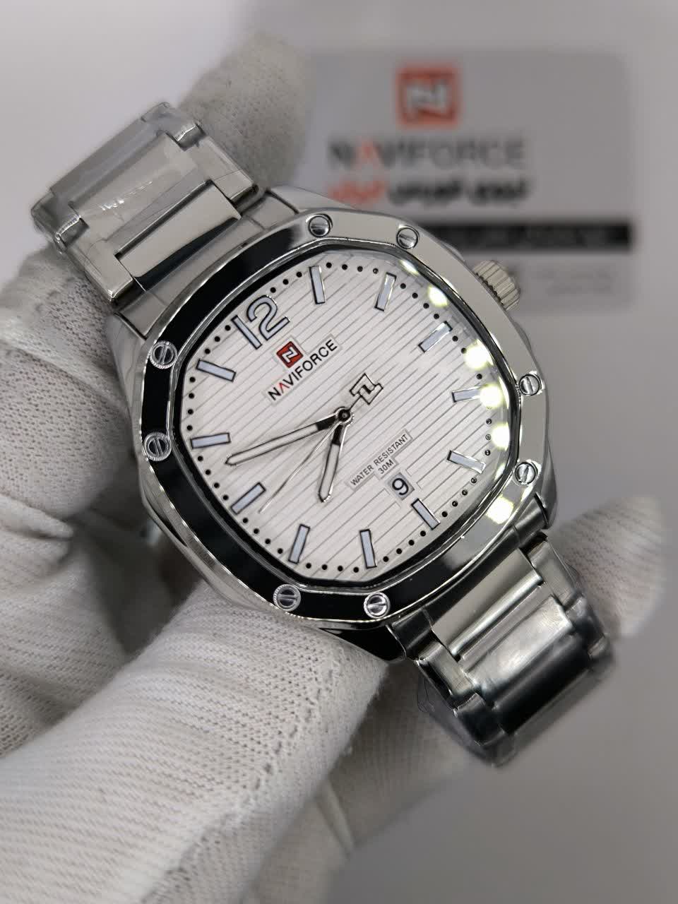 ساعت مچی مردانه نیوی فورس NAVIFORCE مدل NF9243S با موتور ژاپنی انتخابی خاص و چشم نواز برای آقایان خوش سلیقه است. این مدل با بند استیل توپُر رنگ ثابت و صفحه سفید با فرم مربع طرح پتک طراحی مدرن و قدرتمندی دارد و از قاب استیل مقاوم ساخته شده است. تقویم عقربه شب نما شیشه معدنی ضد خش و خاصیت ضد آب کارایی و دوام این ساعت را تضمین میکند. بند استیل ضد حساسیت پوستی به همراه قفل کلیپسی ضامن دار راحتی و امنیت را در استفاده روزمره فراهم میسازد. این محصول ارجینال با جعبه کارت گارانتی و گارانتی نیوی فورس ایران از فروشگاه اینترنتی روبی مد تقدیم نگاه زیبای شما میشود.
