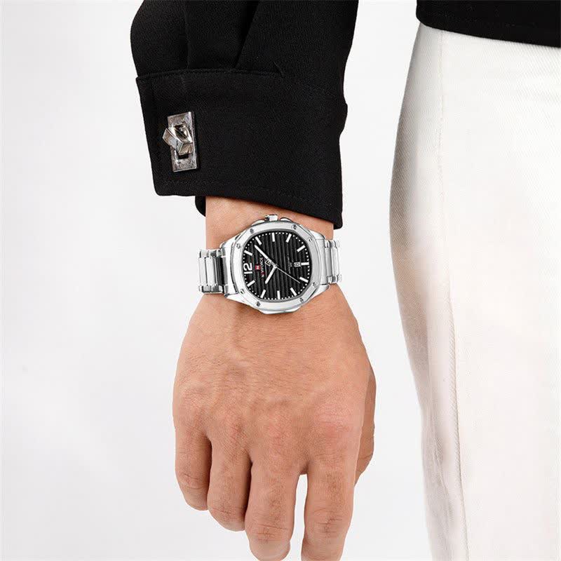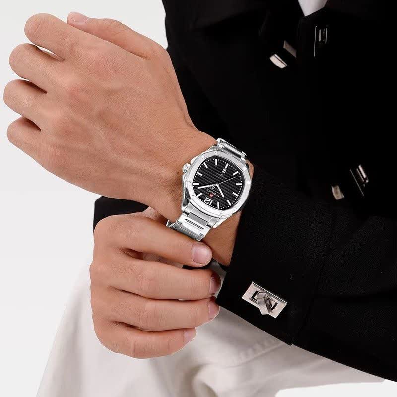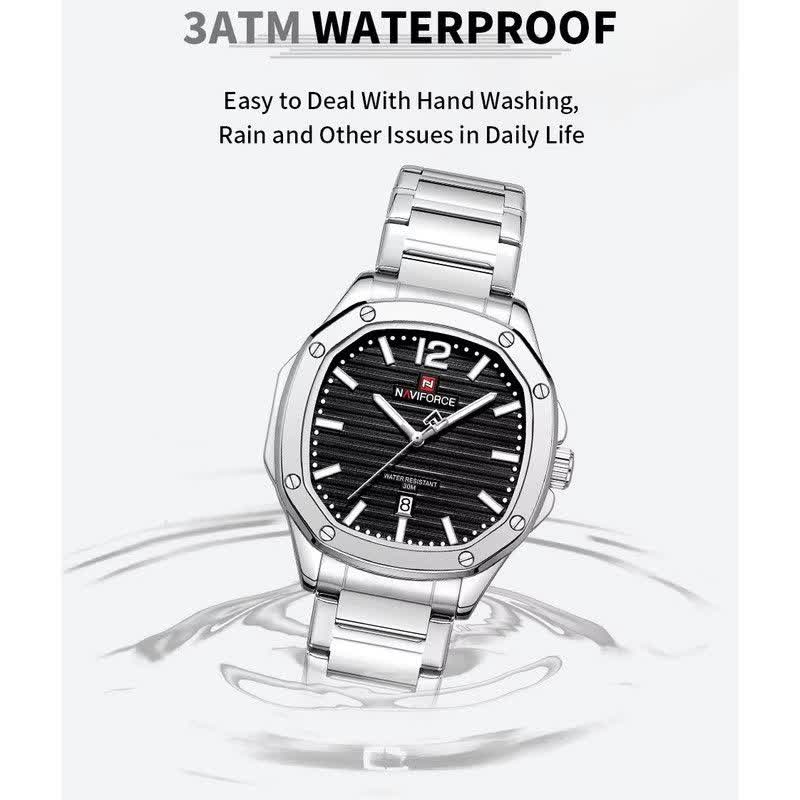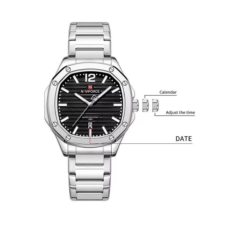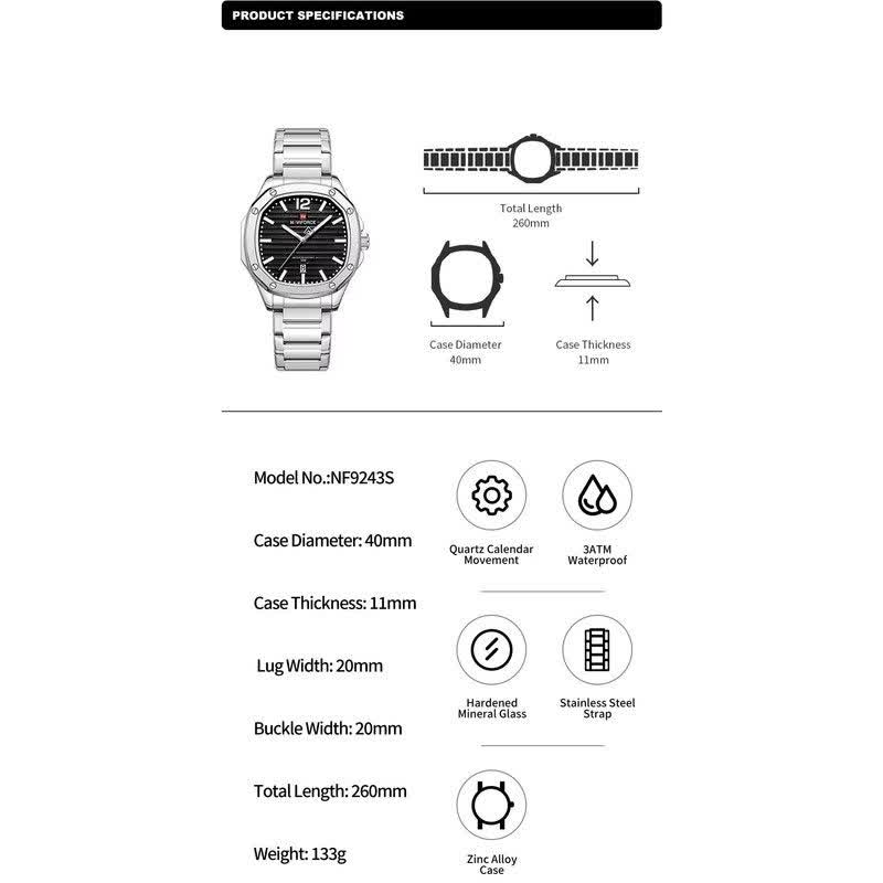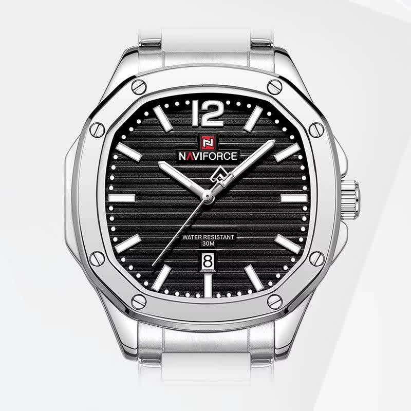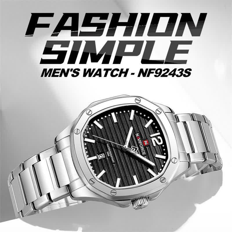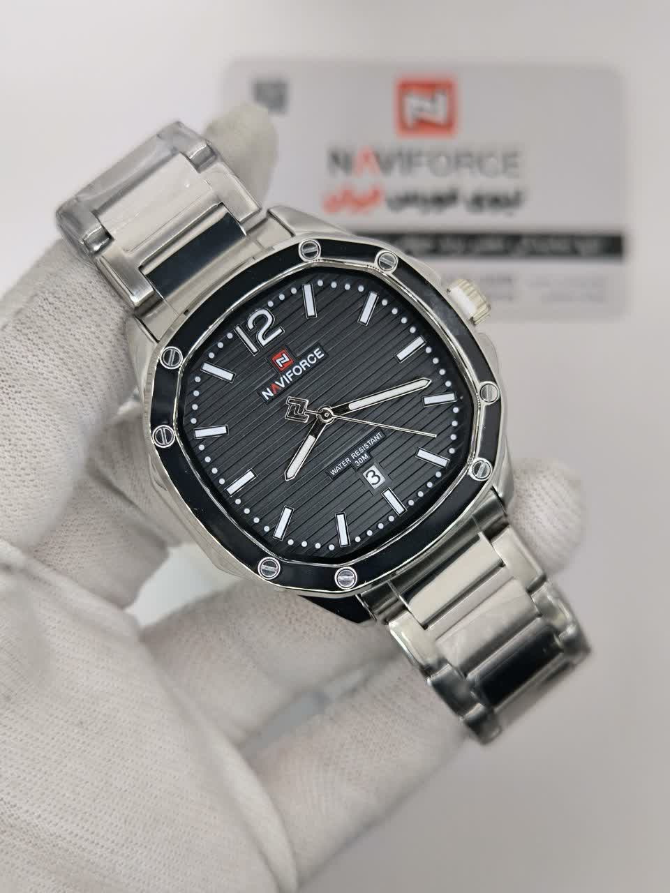 ساعت مچی مردانه نیوی فورس NAVIFORCE مدل NF9243S با موتور ژاپنی انتخابی خاص و چشم نواز برای آقایان خوش سلیقه است. این مدل با بند استیل توپُر رنگ ثابت و صفحه مشکي با فرم مربع طرح پتک طراحی مدرن و قدرتمندی دارد و از قاب استیل مقاوم ساخته شده است. تقویم عقربه شب نما شیشه معدنی ضد خش و خاصیت ضد آب کارایی و دوام این ساعت را تضمین میکند. بند استیل ضد حساسیت پوستی به همراه قفل کلیپسی ضامن دار راحتی و امنیت را در استفاده روزمره فراهم میسازد. این محصول ارجینال با جعبه کارت گارانتی و گارانتی نیوی فورس ایران از فروشگاه اینترنتی روبی مد تقدیم نگاه زیبای شما میشود.