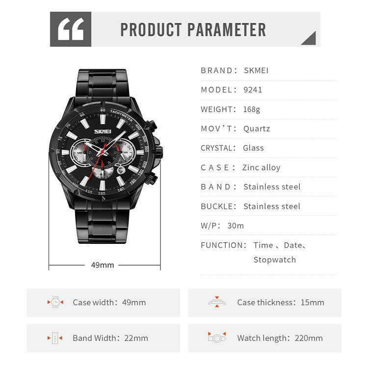 ساعت مچی مردانه کرنوگراف اسکمی SKMEI مدل 9241 اورجینال انتخابی شیک و کاربردی برای آقایانی است که دقت و استایل را همزمان میخواهند. این مدل با بند و صفحه مشکی طراحی شده و به صورت ارجینال ضمانتی از برند اسکمی توسط فروشگاه اینترنتی روبی مد عرضه میشود. دارای کرنوگراف سه موتور فعال تقویم روزشمار و عقربه و صفحه شبتاب برای دید بهتر در تاریکی است. قاب و بند استیل رنگ ثابت ضد زنگ ضد حساسیت با قفل کلیپسی ضامندار در کنار صفحه ضد خط و خش و مقاومت در برابر آب دوام و راحتی را تضمین میکند. این ساعت با فرم صفحه دایرهای و جعبه هدیه همراه همان انتخابی است که دنبالش هستی.
