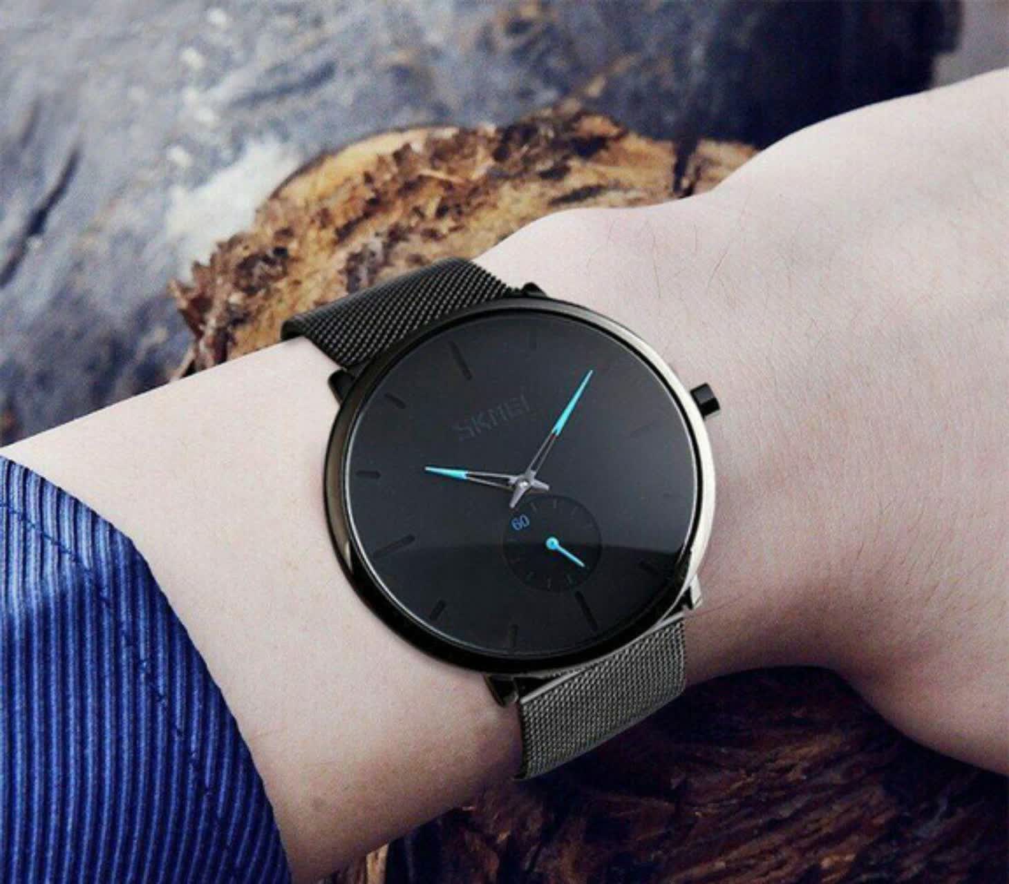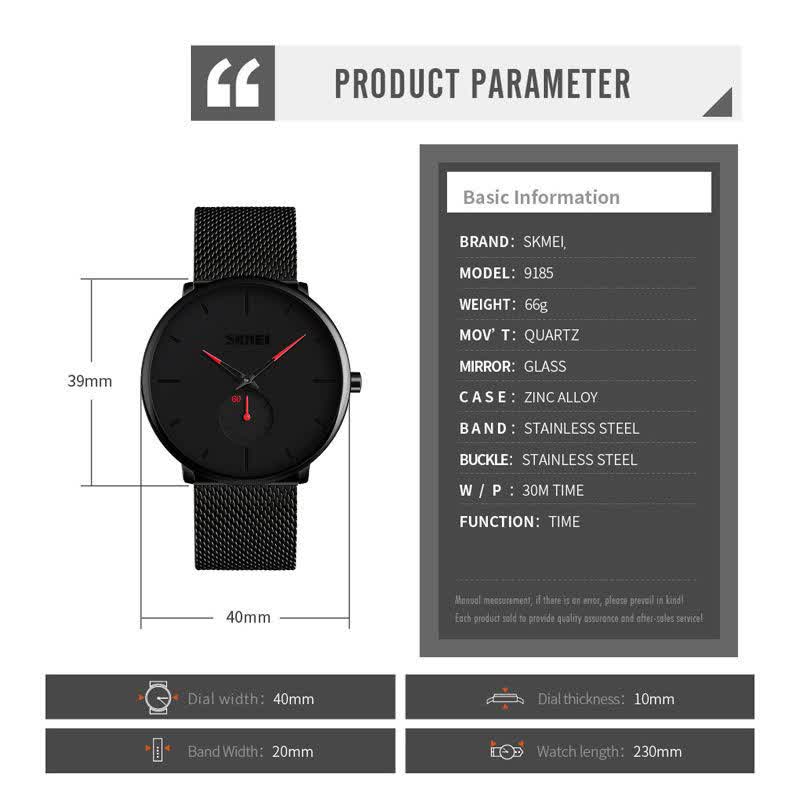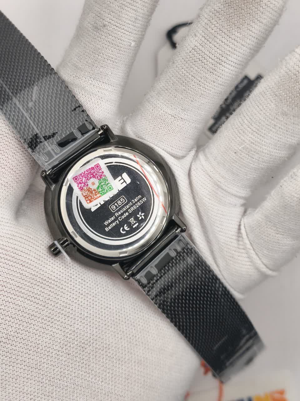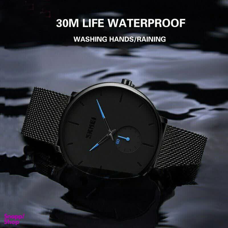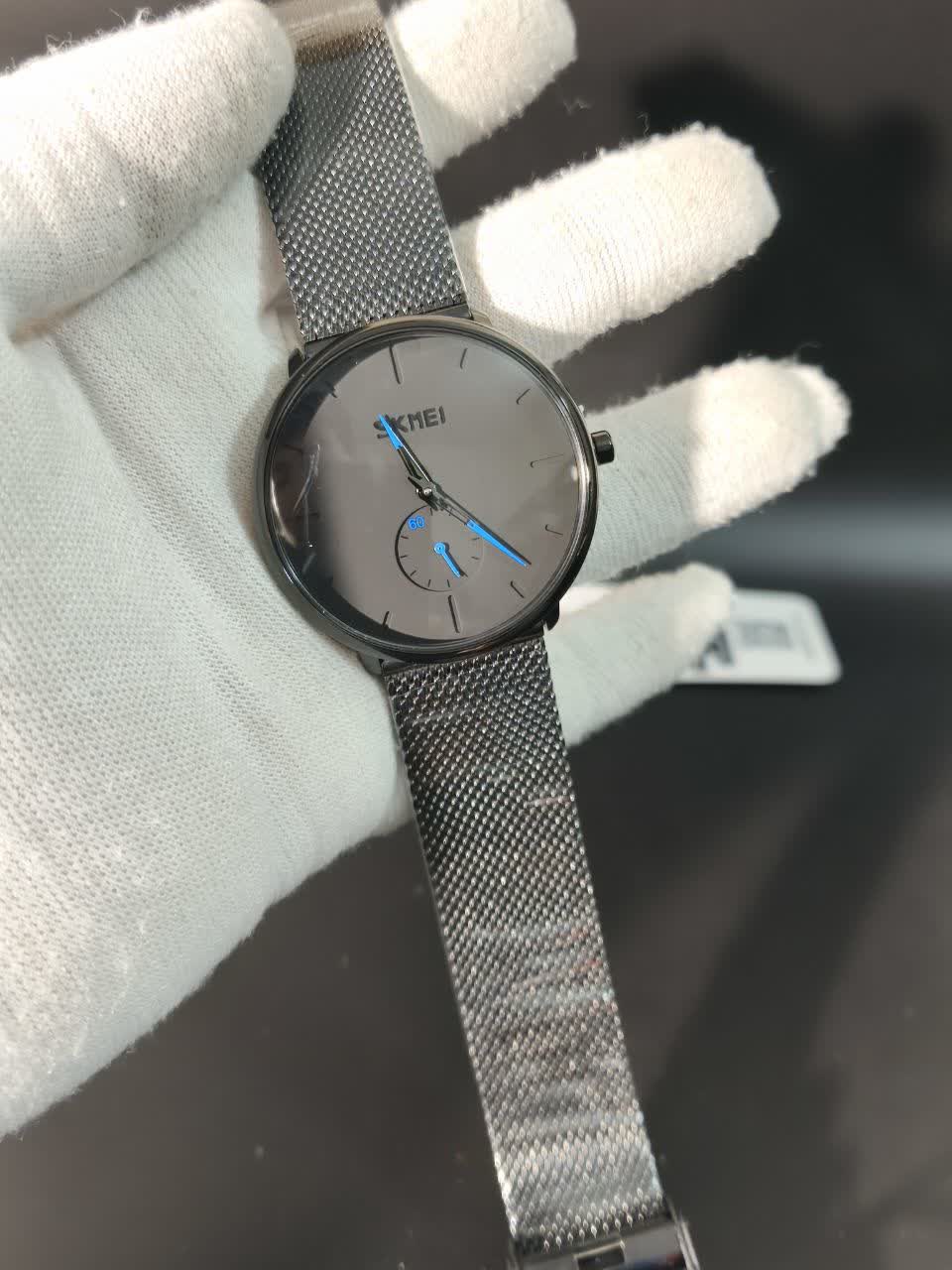 ساعت مچی مردانه اسکمی SKMEI مدل 9185 با بند حصیری انتخابی خاص و شیک برای استایلهای تیره و رسمی است. این مدل با بند مشکی صفحه مشکی و عقربه آبي جلوهای متفاوت دارد و به صورت ارجینال ضمانتی از برند اسکمی توسط فروشگاه اینترنتی روبی مد ارائه میشود. موتور کوارتز دقیق عقربهای به همراه زیر ثانیه مجزا دقت بالایی را تضمین میکند و عقربه و صفحه شبتاب خوانایی عالی در شب دارند. قاب استیل مقاوم بند استیل حصیری زنجیری بافت رنگ ثابت ضد زنگ و ضد حساسیت در کنار صفحه ضد خط و خش و مقاومت در برابر آب کیفیت ساخت بالایی را نشان میدهد. فرم صفحه دایرهای و جعبه هدیه همراه این ساعت را به یک ست عالی برای لباسهای مشکی تبدیل کرده است.
