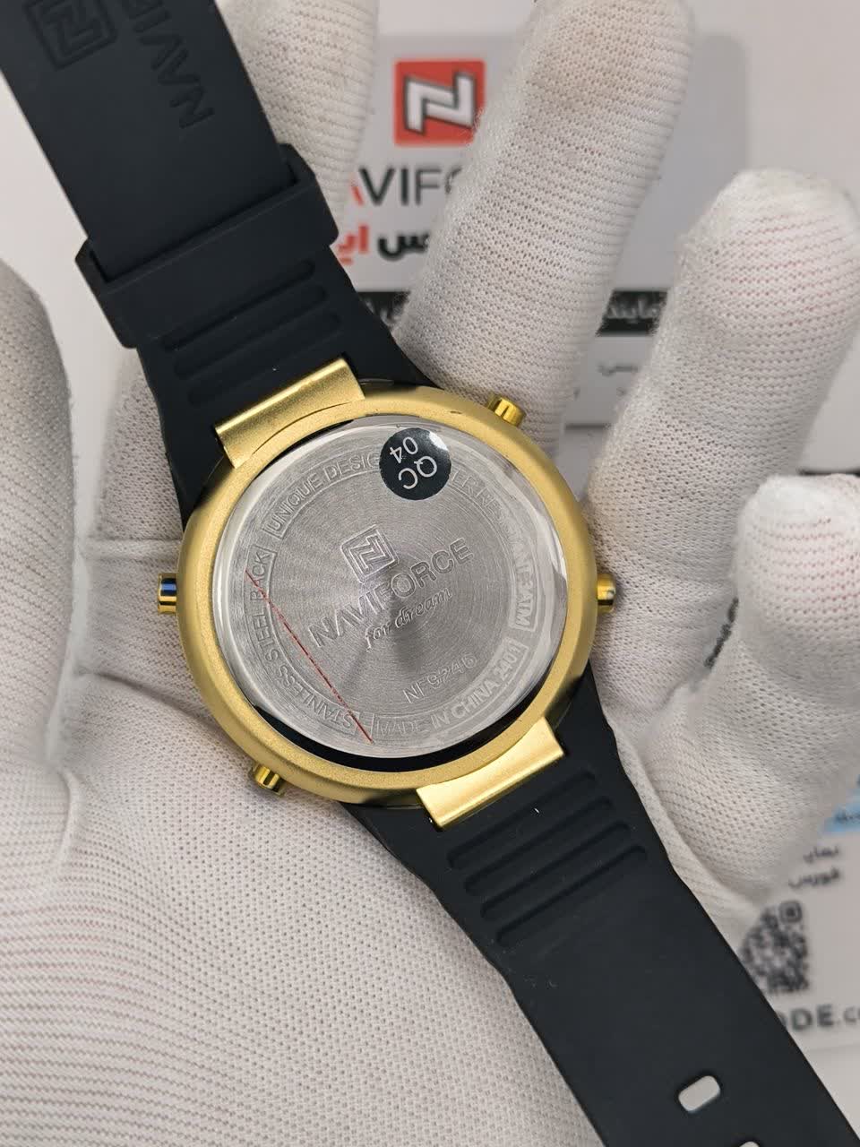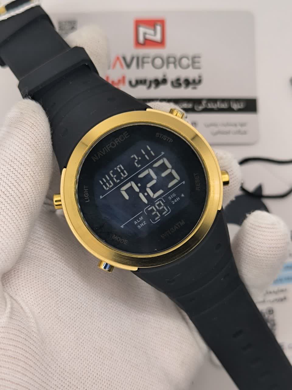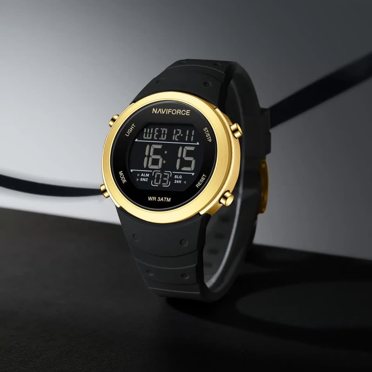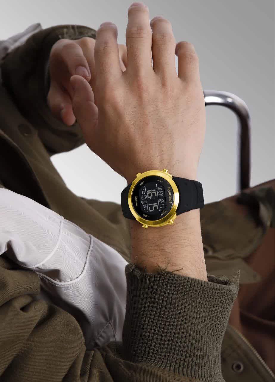 ساعت مچی مردانه دیجیتال نیوی فورس NAVIFORCE مدل Nf9246 اورجینال با بند مشکی و صفحه مشکی طراحی شیک و اسپرتی را برای آقایان خوش سلیقه ارائه می دهد. این مدل با صفحه نمایش دیجیتال، کرنومتر، تایمر، تقویم و ثانیه شمار به همراه چراغ دید در شب امکانات کامل و کاربردی را در اختیار شما قرار می دهد. شیشه معدنی ضد خش و خاصیت ضد آب در کنار بند رابر ضد حساسیت با قفل کمربندی سوزنی دوام و راحتی بالایی ایجاد کرده است. فرم صفحه دایره ای آن مناسب هر سبک و استایل بوده و انتخابی عالی برای استفاده روزمره محسوب می شود. این محصول به صورت ارجینال همراه با کارت گارانتی و جعبه اصلی با گارانتی نیوی فورس ایران از فروشگاه اینترنتی روبی مد عرضه می شود.
