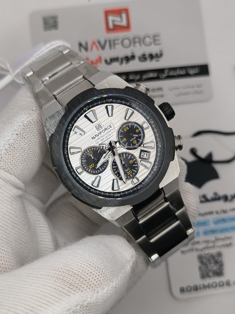 ساعت مچی کرنوگراف مردانه نیوی فورس NAVIFORCE مدل Nf8081 با صفحه سفید و بند استیل جلوه ای شیک و رسمی برای آقایان خوش سلیقه دارد. این مدل سه موتوره کرنوگراف با موتور ژاپن کوارتز و قابلیت تقویم عملکردی دقیق و حرفه ای ارائه می دهد. قاب استیل مقاوم در کنار شیشه معدنی ضد خش و خاصیت ضد آب دوام بالایی را تضمین کرده و عقربه های شب تاب خوانایی بهتری ایجاد می کنند. بند استیل ضد زنگ توپُر سنگین و ضد حساسیت با قفل کلیپسی ضامن دار حس کیفیت و امنیت بیشتری روی دست فراهم می سازد. این محصول ارجینال همراه با کارت گارانتی و جعبه اصلی با گارانتی نیوی فورس ایران از فروشگاه اینترنتی روبی مد عرضه می شود.