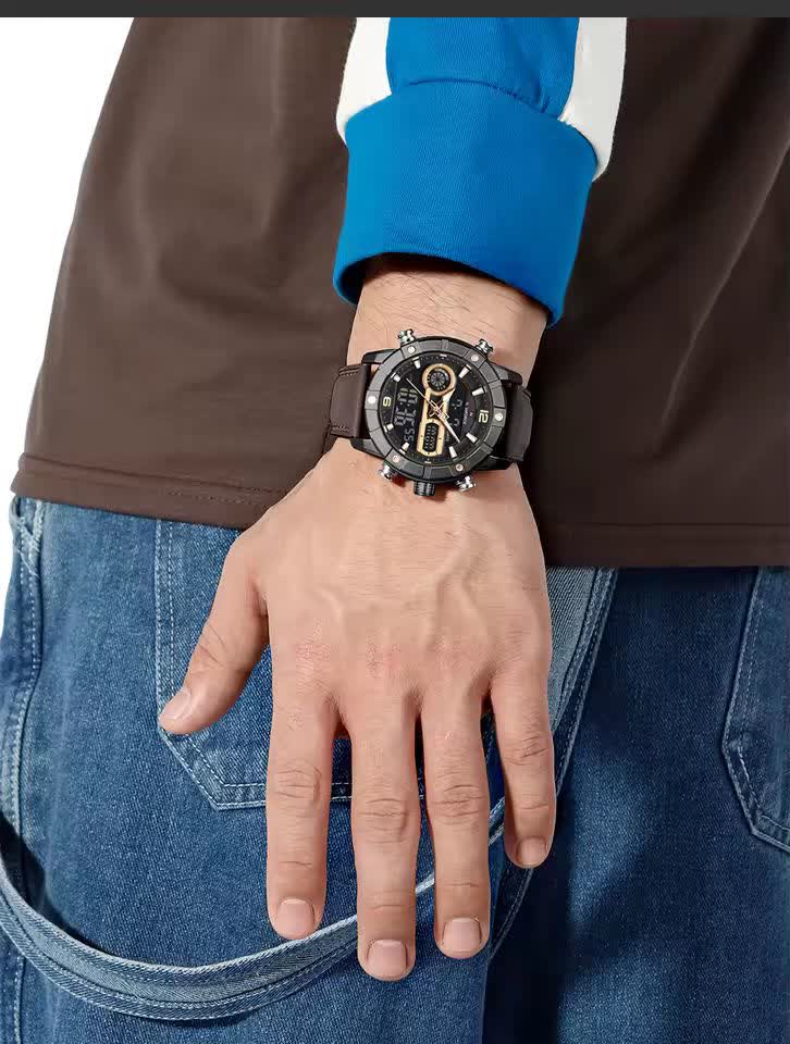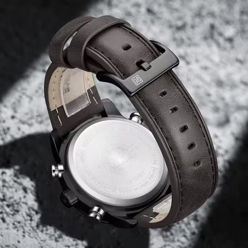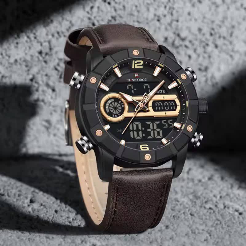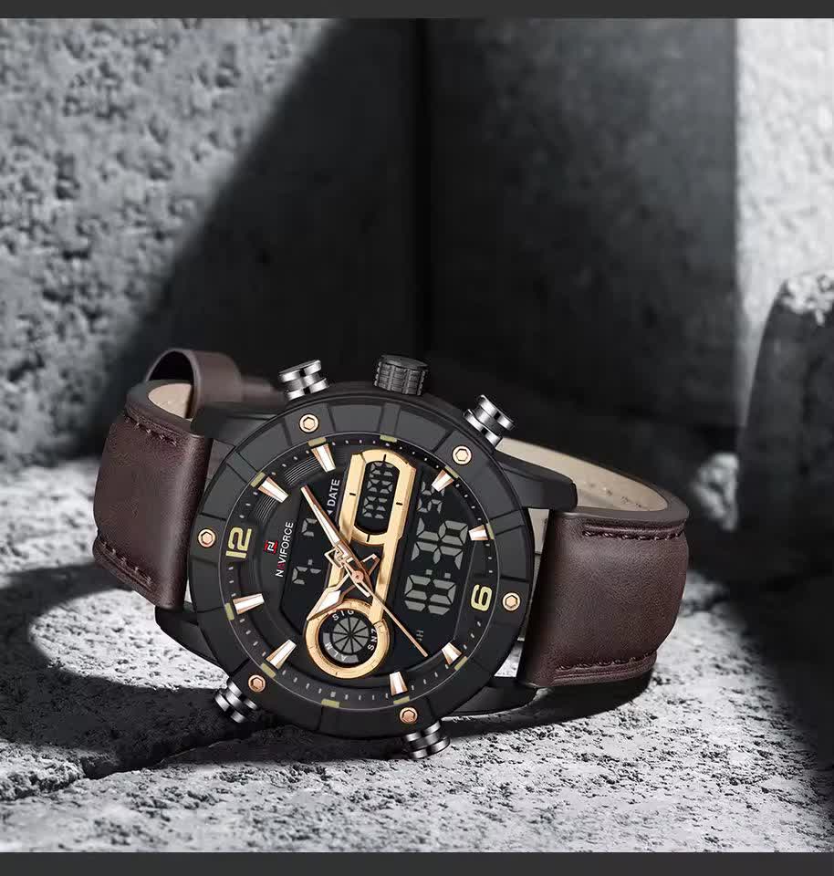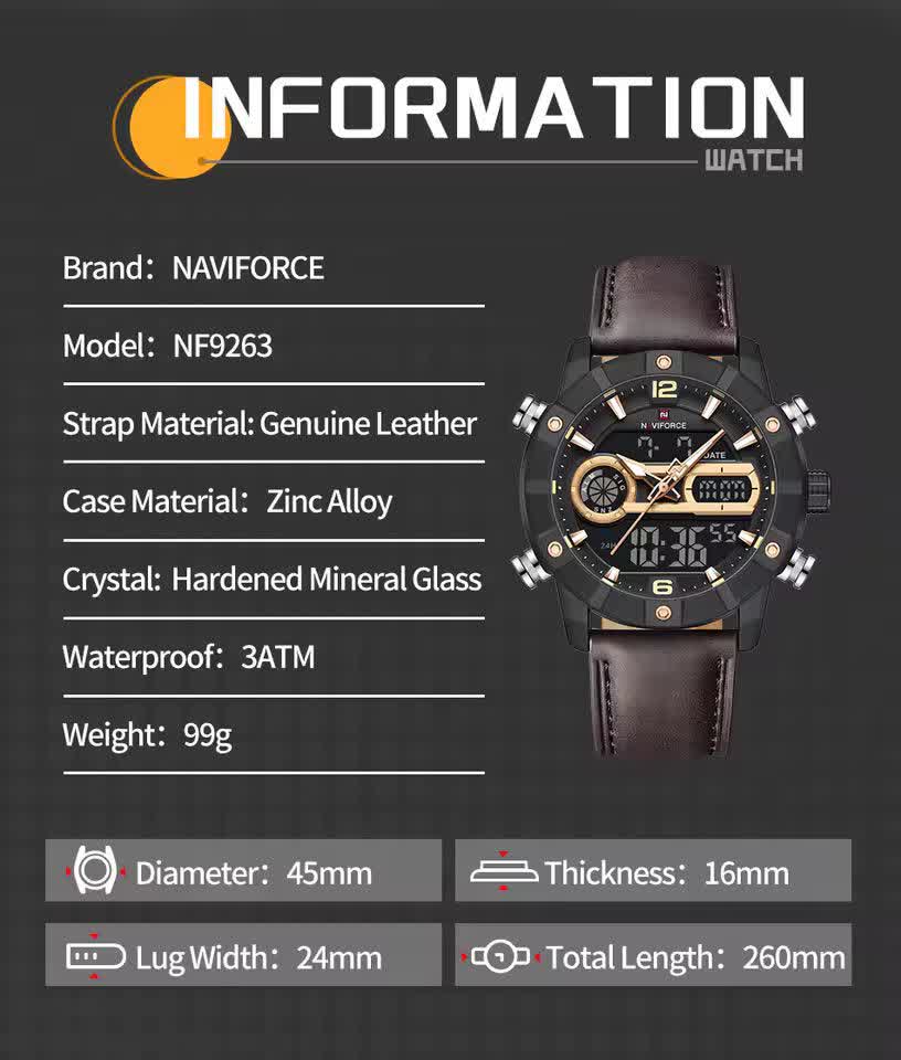 ساعت مچی مردانه عقربه ای و دیجیتال Naviforce NF9263 با صفحه مشکی و بند چرم قهوه ای دور دوخت، ترکیبی شیک و کاربردی برای استایل روزمره و رسمی است. این مدل با موتور ژاپن کوارتز دقیق، قاب استیل، شیشه معدنی ضد خش و فرم صفحه دایره شکل طراحی شده و دارای تقویم، آلارم، روزشمار، ثانیه شمار، عقربه شب تاب و چراغ دید در شب می باشد. ساعت ضد آب بوده و به صورت ارجینال همراه با کارت گارانتی و گارانتی نیوی فورس ایران از فروشگاه اینترنتی روبی مد عرضه می شود.