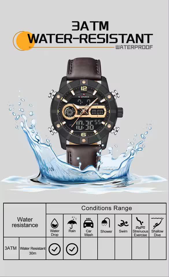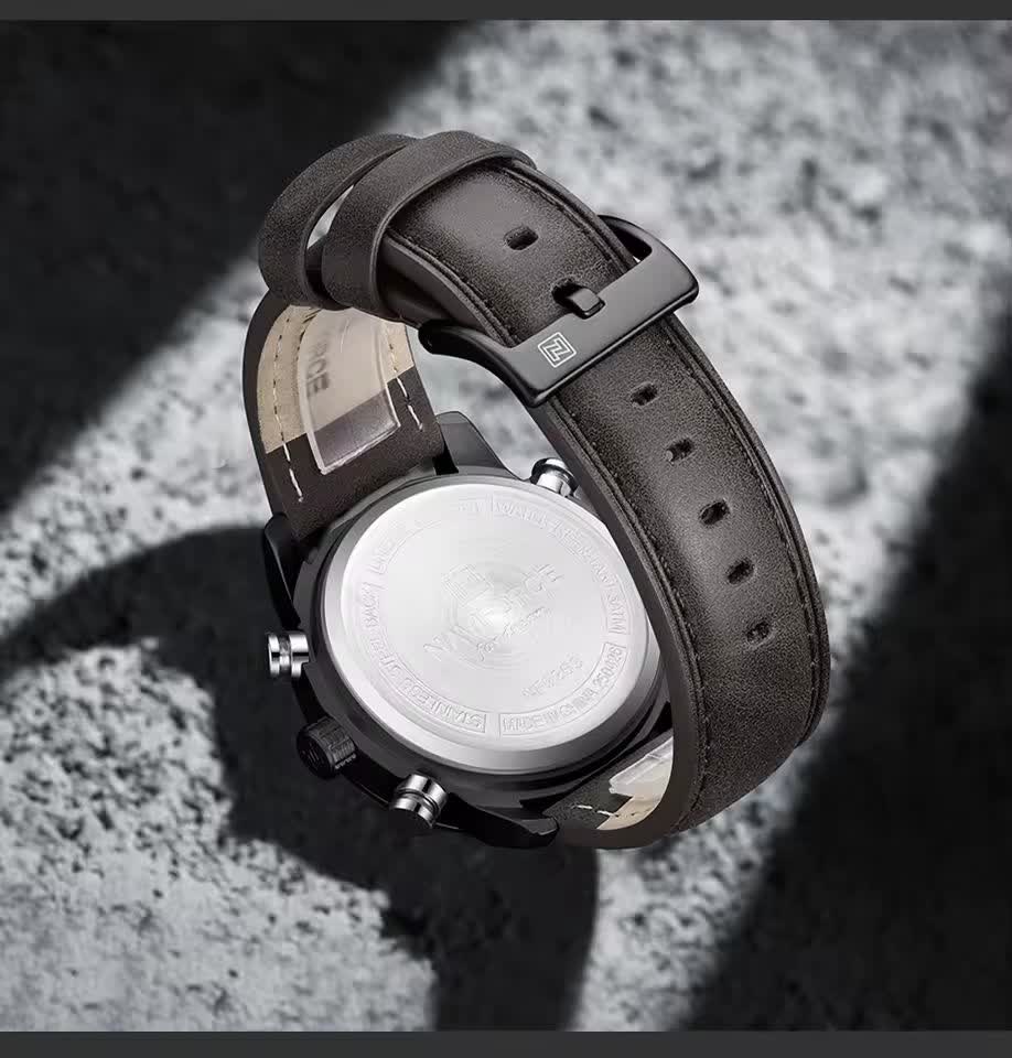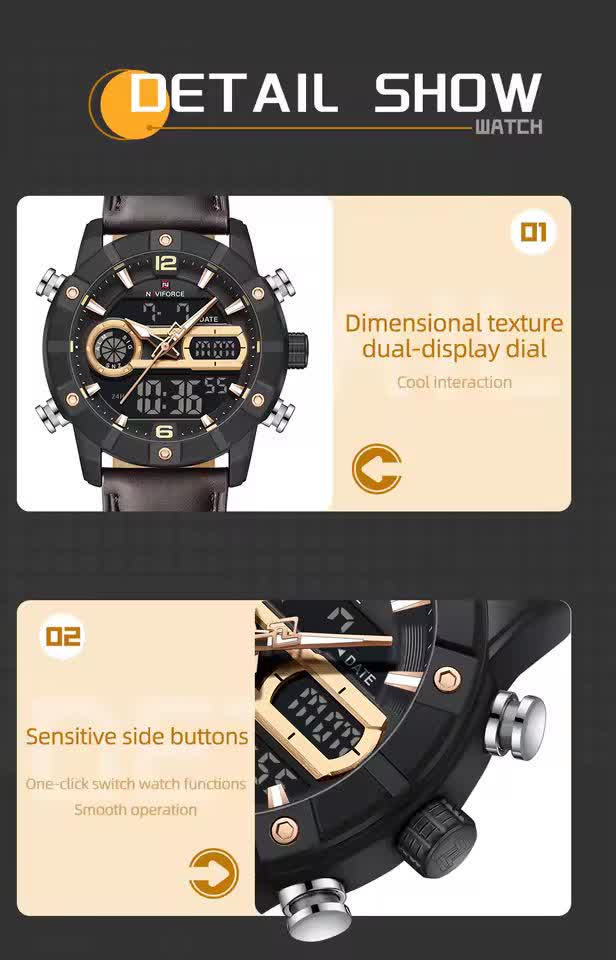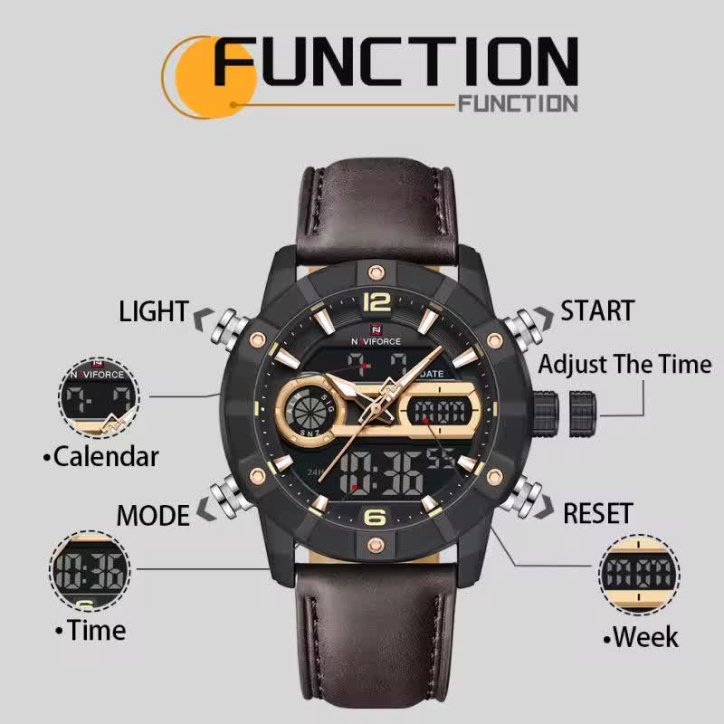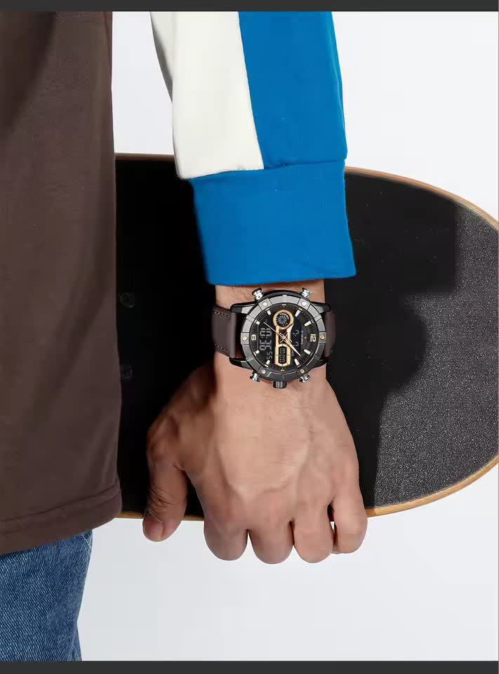 ساعت مچی مردانه عقربه ای و دیجیتال Naviforce NF9263 با صفحه مشکی و بند چرم قهوه ای دور دوخت، ترکیبی شیک و کاربردی برای استایل روزمره و رسمی است. این مدل با موتور ژاپن کوارتز دقیق، قاب استیل، شیشه معدنی ضد خش و فرم صفحه دایره شکل طراحی شده و دارای تقویم، آلارم، روزشمار، ثانیه شمار، عقربه شب تاب و چراغ دید در شب می باشد. ساعت ضد آب بوده و به صورت ارجینال همراه با کارت گارانتی و گارانتی نیوی فورس ایران از فروشگاه اینترنتی روبی مد عرضه می شود.