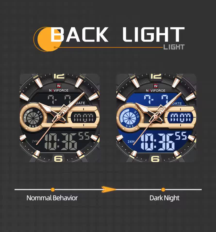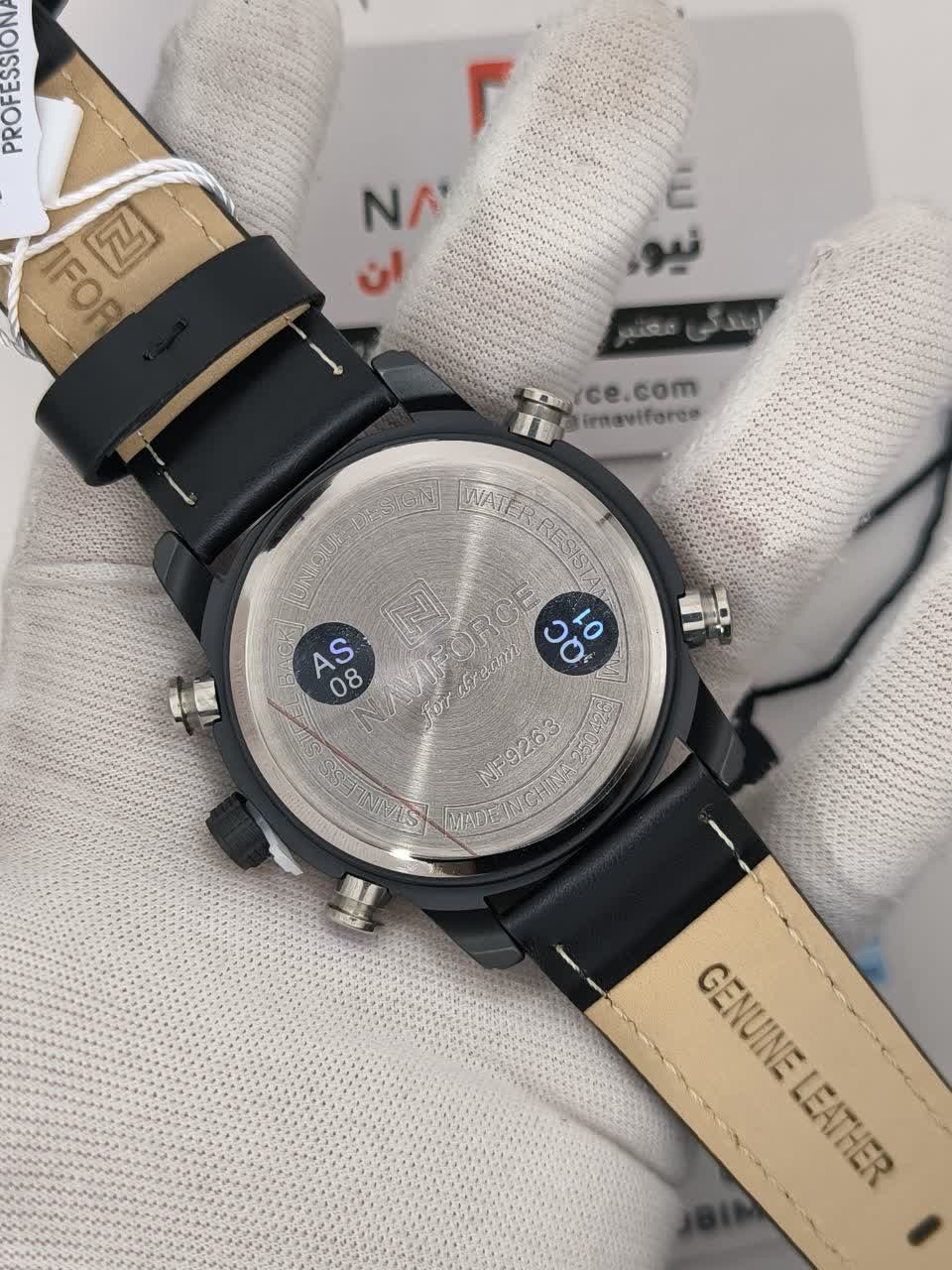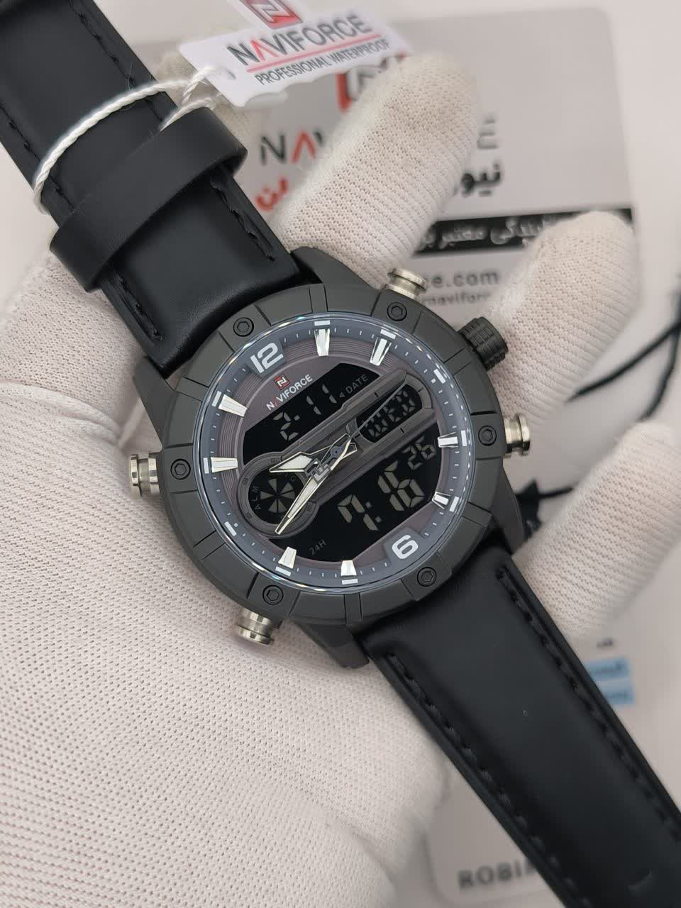 ساعت مچی مردانه عقربه ای و دیجیتال Naviforce NF9263 با صفحه مشکی و بند چرم مشکي دور دوخت، ترکیبی شیک و کاربردی برای استایل روزمره و رسمی است. این مدل با موتور ژاپن کوارتز دقیق، قاب استیل، شیشه معدنی ضد خش و فرم صفحه دایره شکل طراحی شده و دارای تقویم، آلارم، روزشمار، ثانیه شمار، عقربه شب تاب و چراغ دید در شب می باشد. ساعت ضد آب بوده و به صورت ارجینال همراه با کارت گارانتی و گارانتی نیوی فورس ایران از فروشگاه اینترنتی روبی مد عرضه می شود.