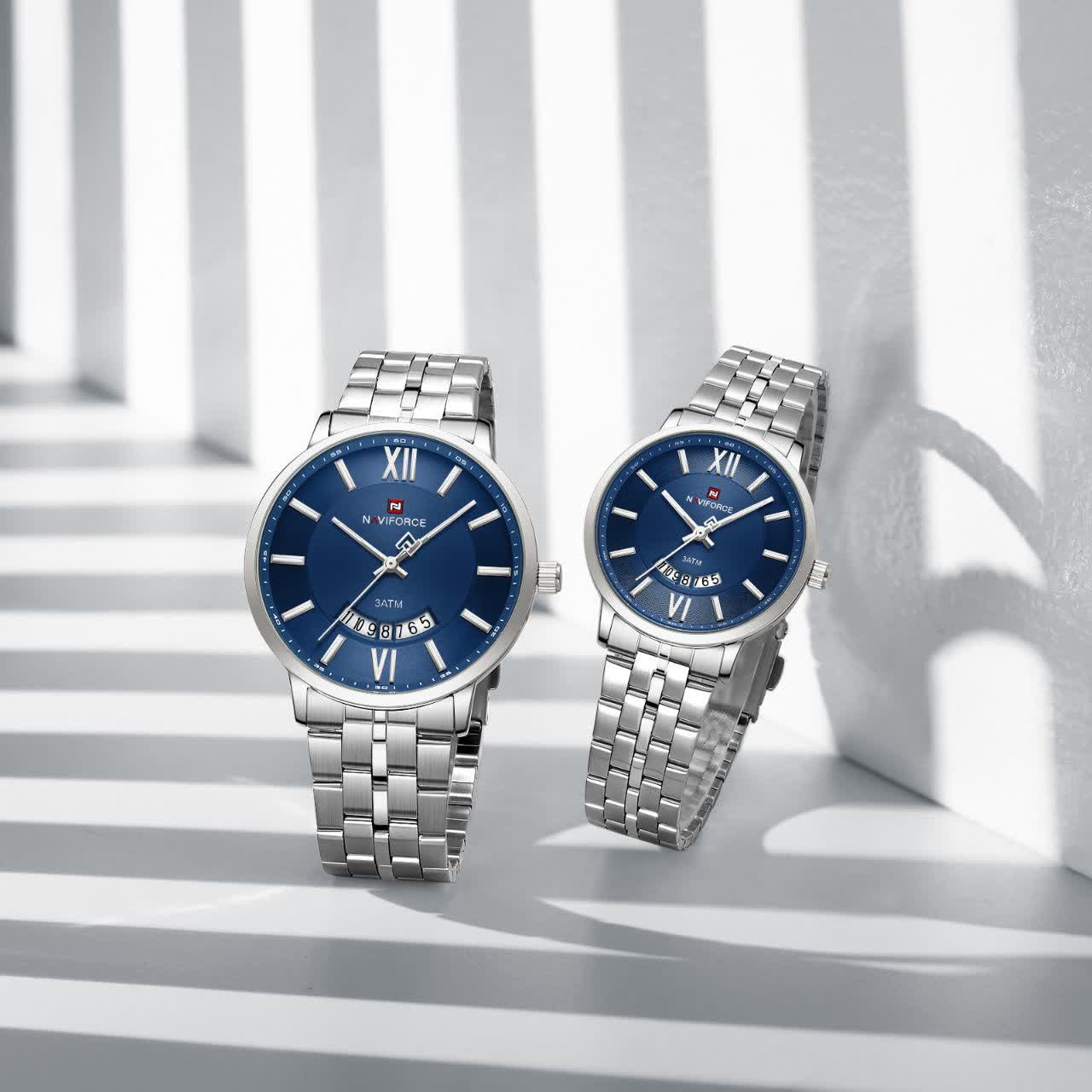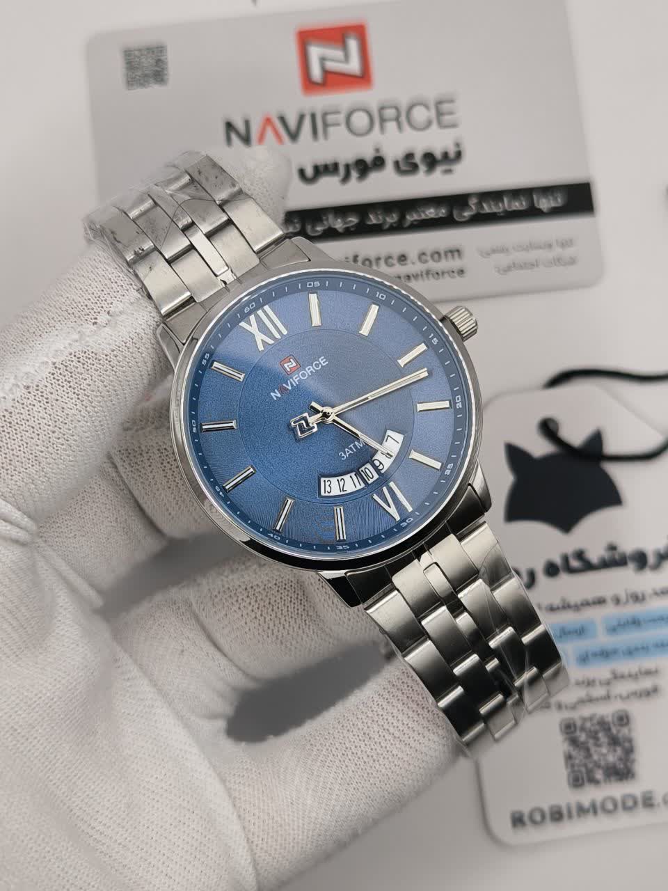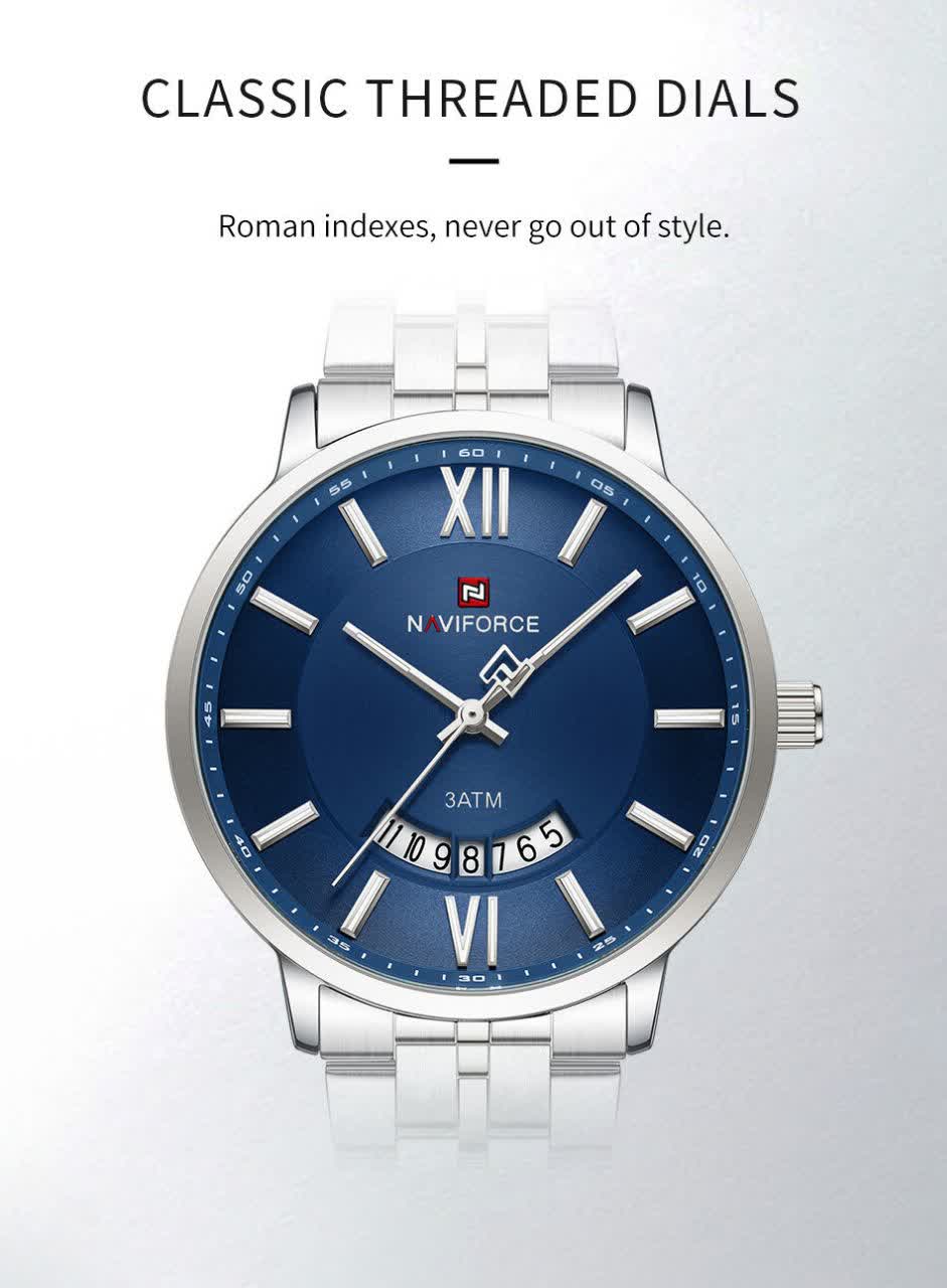 ساعت مچی عقربه ای مردانه Naviforce NF9238 با صفحه آبی جذاب و بند سیلور رنگ ثابت، انتخابی شیک و مناسب هر سلیقه و استایل است. این مدل با موتور ژاپن کوارتز، قاب استیل مقاوم، شیشه معدنی ضد خش و فرم صفحه دایره ای طراحی شده و دارای تقویم و عقربه شب نما می باشد. بند استیل ضد حساسیت پوستی با قفل کلیپسی ضامن دار، راحتی و امنیت بالایی را فراهم می کند و ساعت ضد آب است. محصول به صورت ارجینال همراه با کارت گارانتی و جعبه و گارانتی نیوی فورس ایران از فروشگاه اینترنتی روبی مد عرضه می شود.