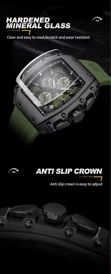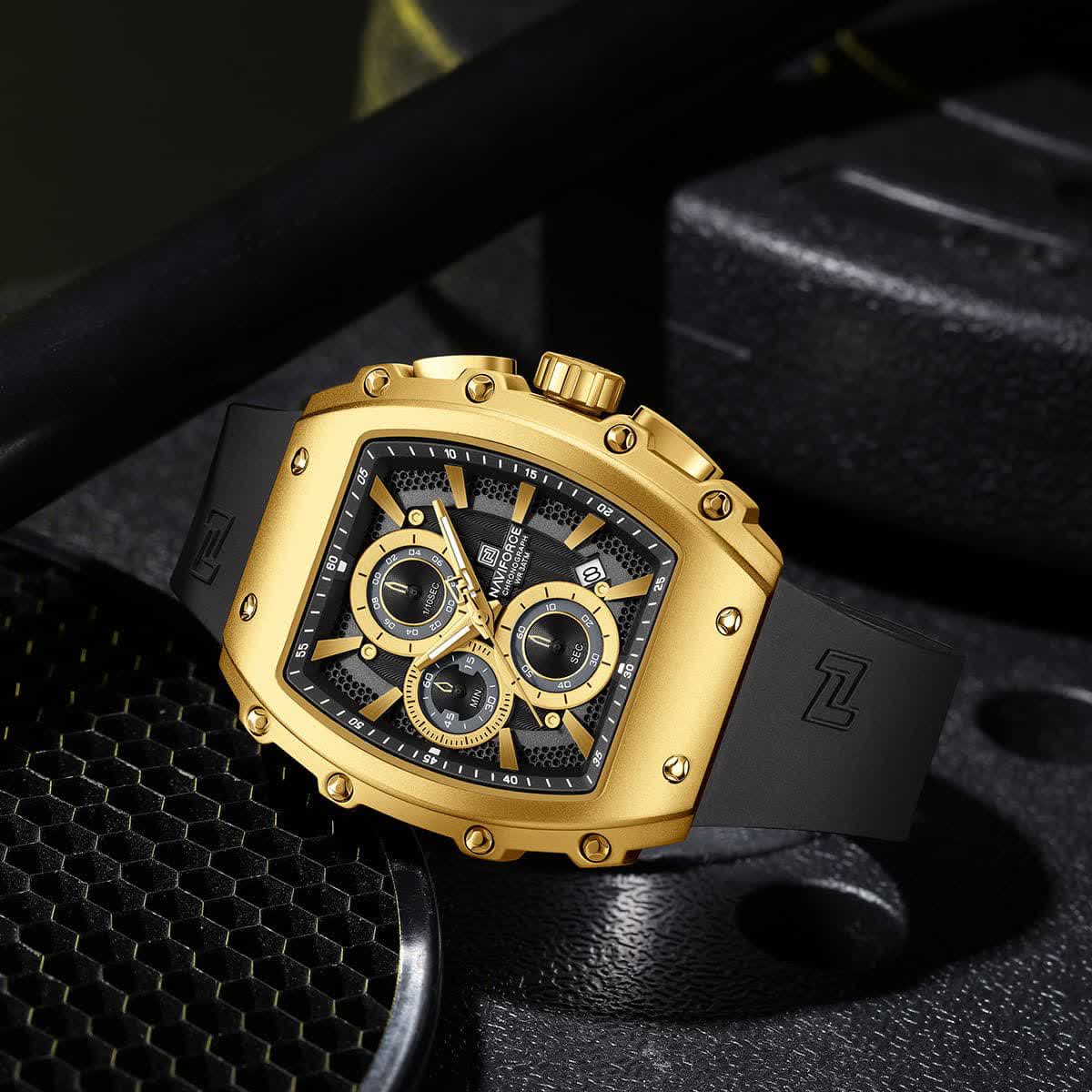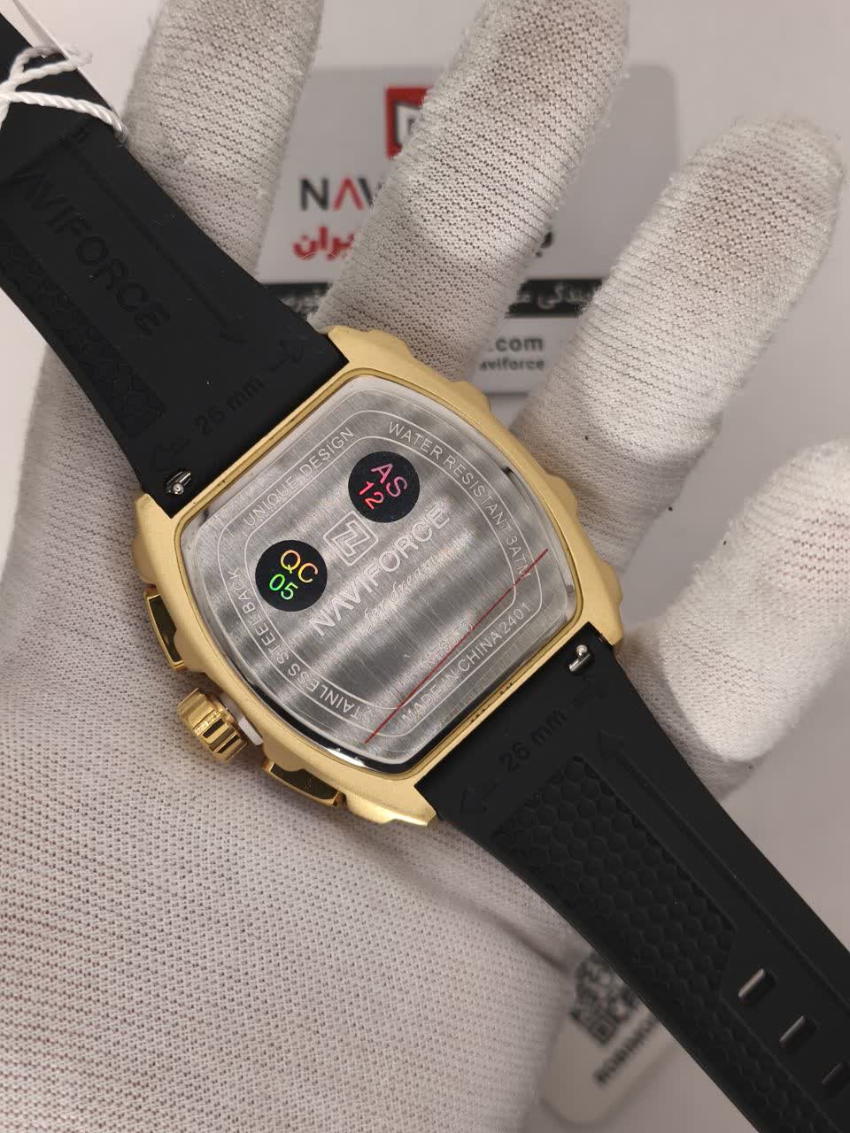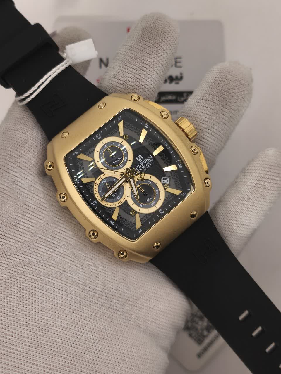 ساعت مچی کرنوگراف مردانه Naviforce NF8070 با صفحه مشکی، قاب طلایی و بند سیلیکونی ضد حساسیت، ترکیبی اسپرت و لوکس برای هر استایل است. این مدل سه موتوره کرنوگراف با موتور ژاپن کوارتز دقیق، قاب استیل، شیشه معدنی ضد خش و فرم صفحه مستطیل شکل طراحی شده و دارای تقویم و عقربه شب تاب می باشد. بند سیلیکونی با قفل سگکی سوزنی کمربندی راحتی و امنیت را تضمین می کند و ساعت ضد آب است. محصول ارجینال همراه با کارت گارانتی، جعبه و گارانتی نیوی فورس ایران از کالکشن جدید نیوی فورس از فروشگاه اینترنتی روبی مد قابل تهیه است و بیشتر از یک ساعت، یک دوست واقعی را ارائه می دهد.