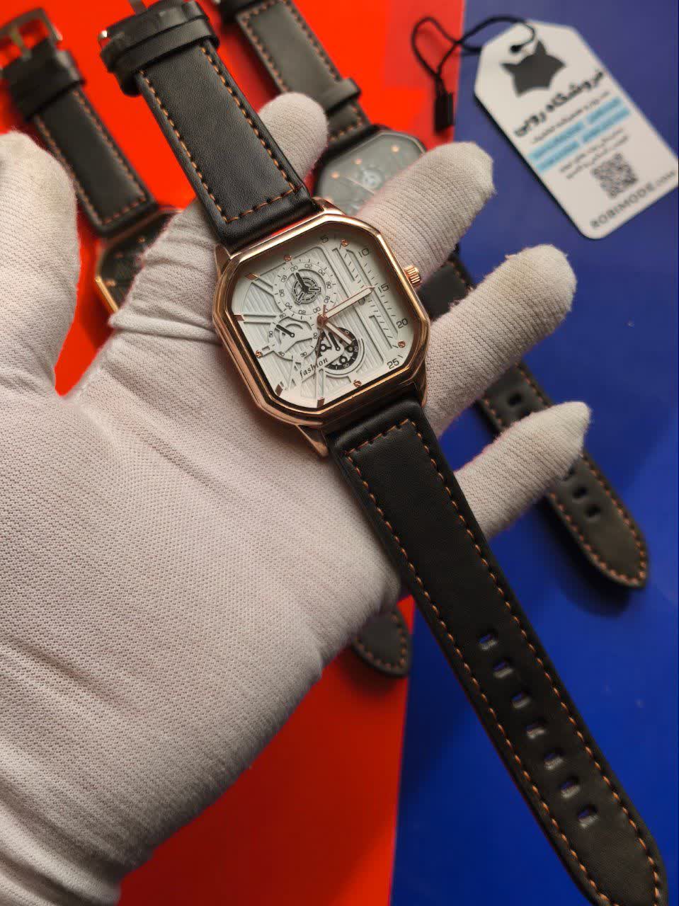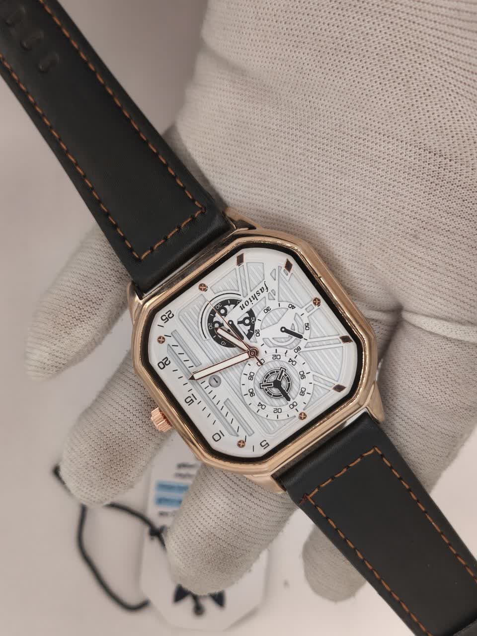ساعت مچی مردانه طرح کرنو فشیون FASHION بند چرمی مدل 3 با بند مشکی قاب طلایی و صفحه سفید، انتخابی شیک و جذاب برای استایل رسمی و روزمره شماست که با موتور کوارتز دقت بالا و تقویم دار عملکردی دقیق ارائه می دهد. این مدل با طرح سه موتوره کرنوگراف، قاب استیل رنگ ثابت، شیشه ضد خش و قابلیت ضد آب، کیفیت و دوام را تضمین می کند. بند چرمی باکیفیت دور دوخت و ضد حساسیت پوستی در کنار قفل سوزنی سگکی کمربندی، راحتی کامل را فراهم کرده است. عقربه شب نما و فرم صفحه مربعی جلوه ای متفاوت به آن داده و یکی از پرطرفدارترین ساعت ها است که می توانید از فروشگاه اینترنتی روبی مد تهیه کنید.