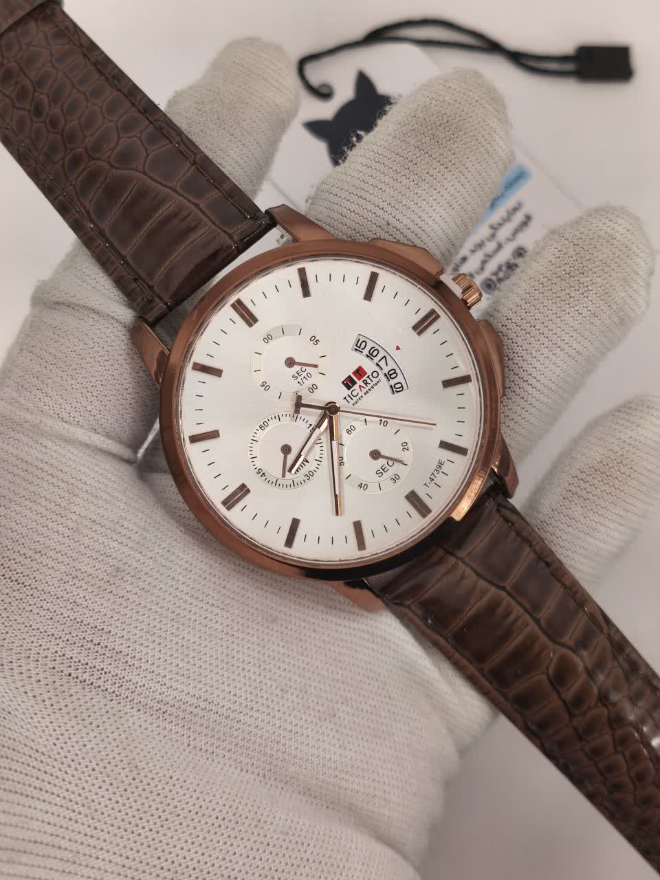 ساعت مچی مردانه TICARTO مدل 2 با موتور تایوان کیفیت بالا و کوارتز دقت عالی، انتخابی لوکس، کلاسیک و اسپورت برای استایل روزمره و رسمی است. این مدل با بند چرمی قهوه ای دوردوخت و صفحه سفید با فرم گرد طراحی شده و دارای طرح کرنو سه موتور و تقویم دار می باشد. دور قاب استیل رنگ ثابت، شیشه کریستال مقاوم، عقربه و صفحه شب نما و ضد آب صدرصد بودن از ویژگی های کاربردی آن است. قفل سگکی کمربندی سوزنی استفاده راحتی را فراهم می کند و محصول به همراه جعبه هدیه عرضه می شود. همین حالا از فروشگاه اینترنتی روبی مد تهیه کنید و با ساعتی خاص بدرخشید.