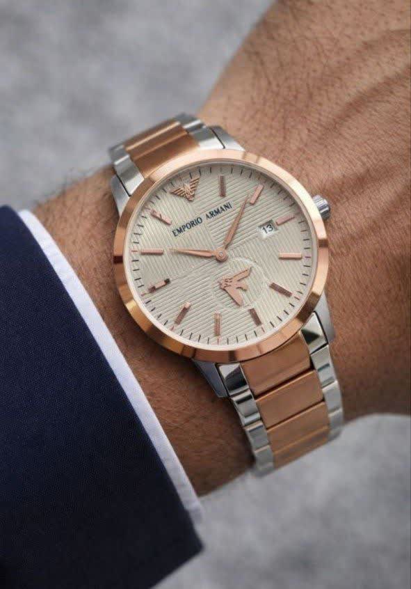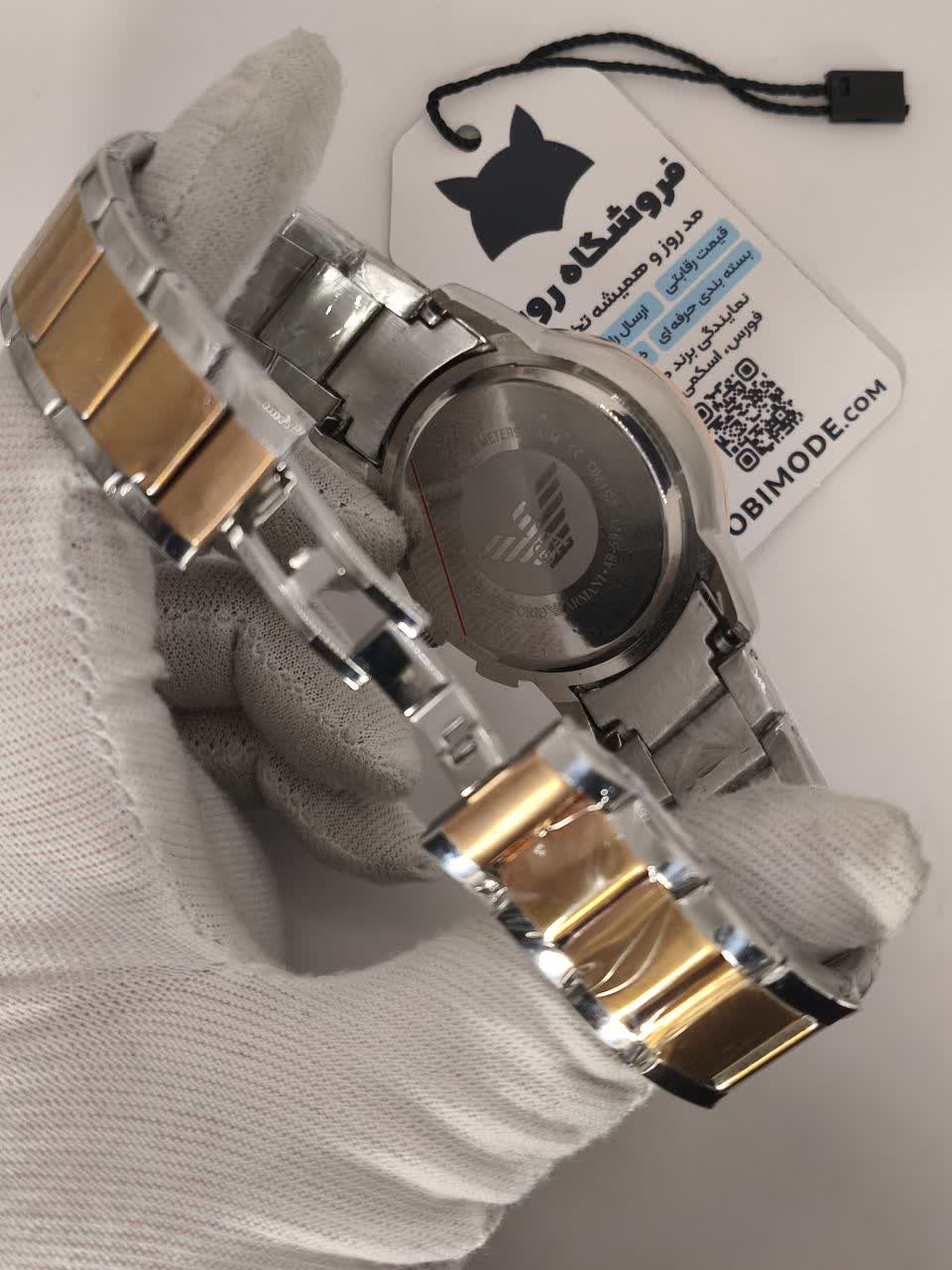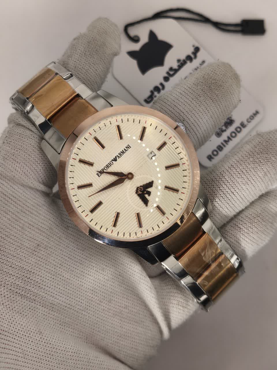 ساعت مچی مردانه Emporio Armani طلایی با زیر ثانیه فعال چرخشی، ترکیبی از ظرافت و قدرت در طراحی است. این مدل با بند نقره ای رگه طلایی و صفحه سفید با فرم گرد ساخته شده و دارای موتور کوارتز با دقت عالی و تقویم دار می باشد. بدنه تمام استیل رنگ ثابت با بند توپُر سنگین، قفل پروانه ای مدل جدید و شیشه سافایر ضد خش، کیفیتی ماندگار را تضمین می کند و عقربه و صفحه شب نما در کنار ضد آب بودن کارایی آن را کامل می سازد. محصول به همراه جعبه هدیه عرضه می شود تا انتخابی خاص برای هدیه باشد. همین حالا از فروشگاه اینترنتی روبی مد تهیه کنید، ساعت مچی شما امضای شماست.