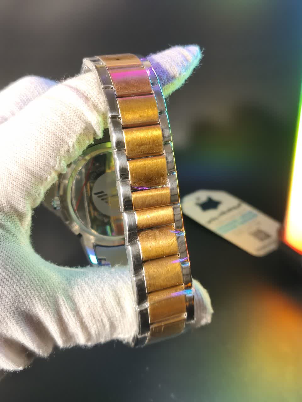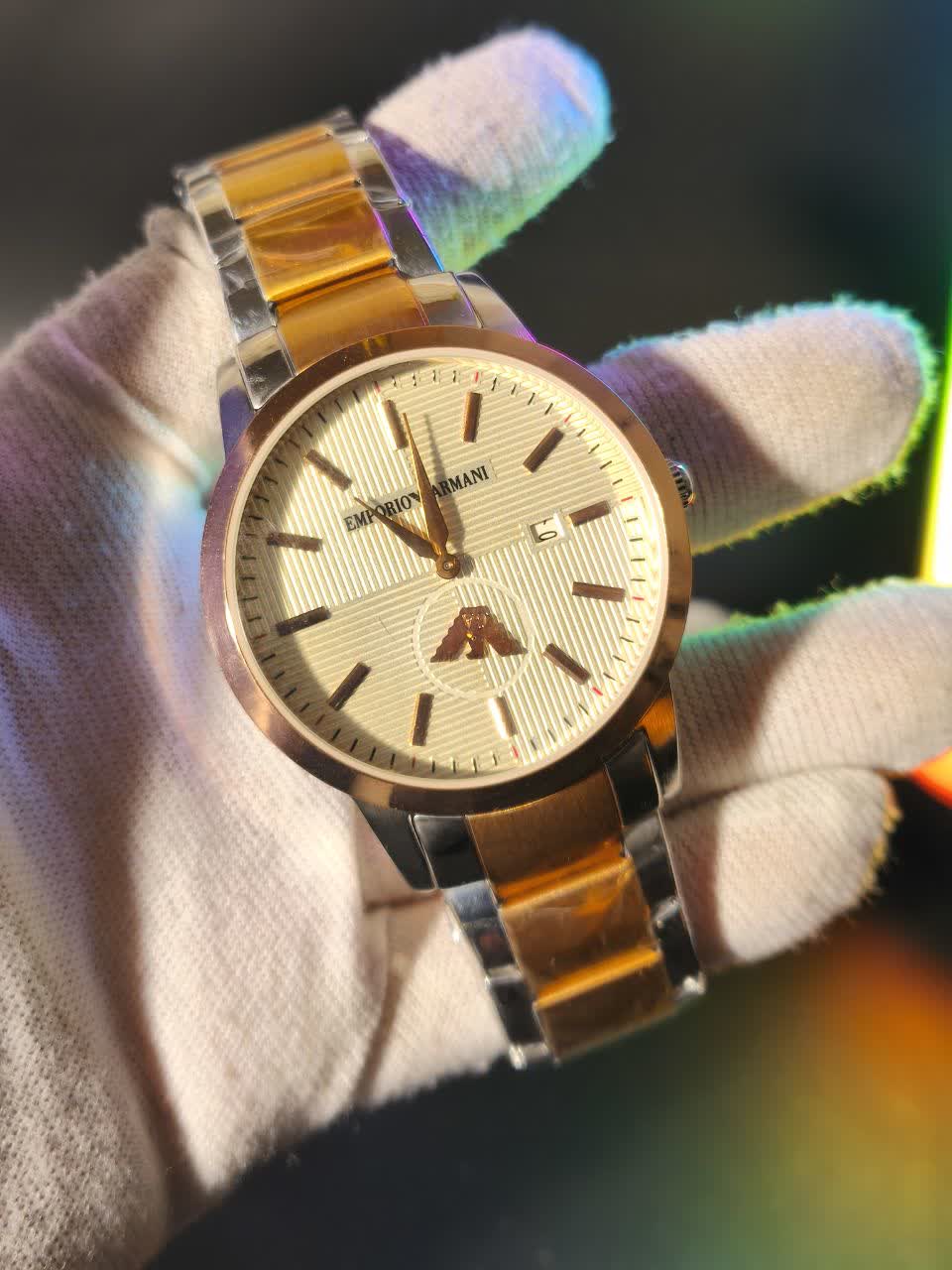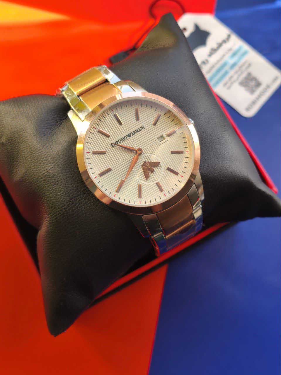 ساعت مچی مردانه Emporio Armani طلایی با زیر ثانیه فعال چرخشی، ترکیبی از ظرافت و قدرت در طراحی است. این مدل با بند نقره ای رگه طلایی و صفحه سفید با فرم گرد ساخته شده و دارای موتور کوارتز با دقت عالی و تقویم دار می باشد. بدنه تمام استیل رنگ ثابت با بند توپُر سنگین، قفل پروانه ای مدل جدید و شیشه سافایر ضد خش، کیفیتی ماندگار را تضمین می کند و عقربه و صفحه شب نما در کنار ضد آب بودن کارایی آن را کامل می سازد. محصول به همراه جعبه هدیه عرضه می شود تا انتخابی خاص برای هدیه باشد. همین حالا از فروشگاه اینترنتی روبی مد تهیه کنید، ساعت مچی شما امضای شماست.