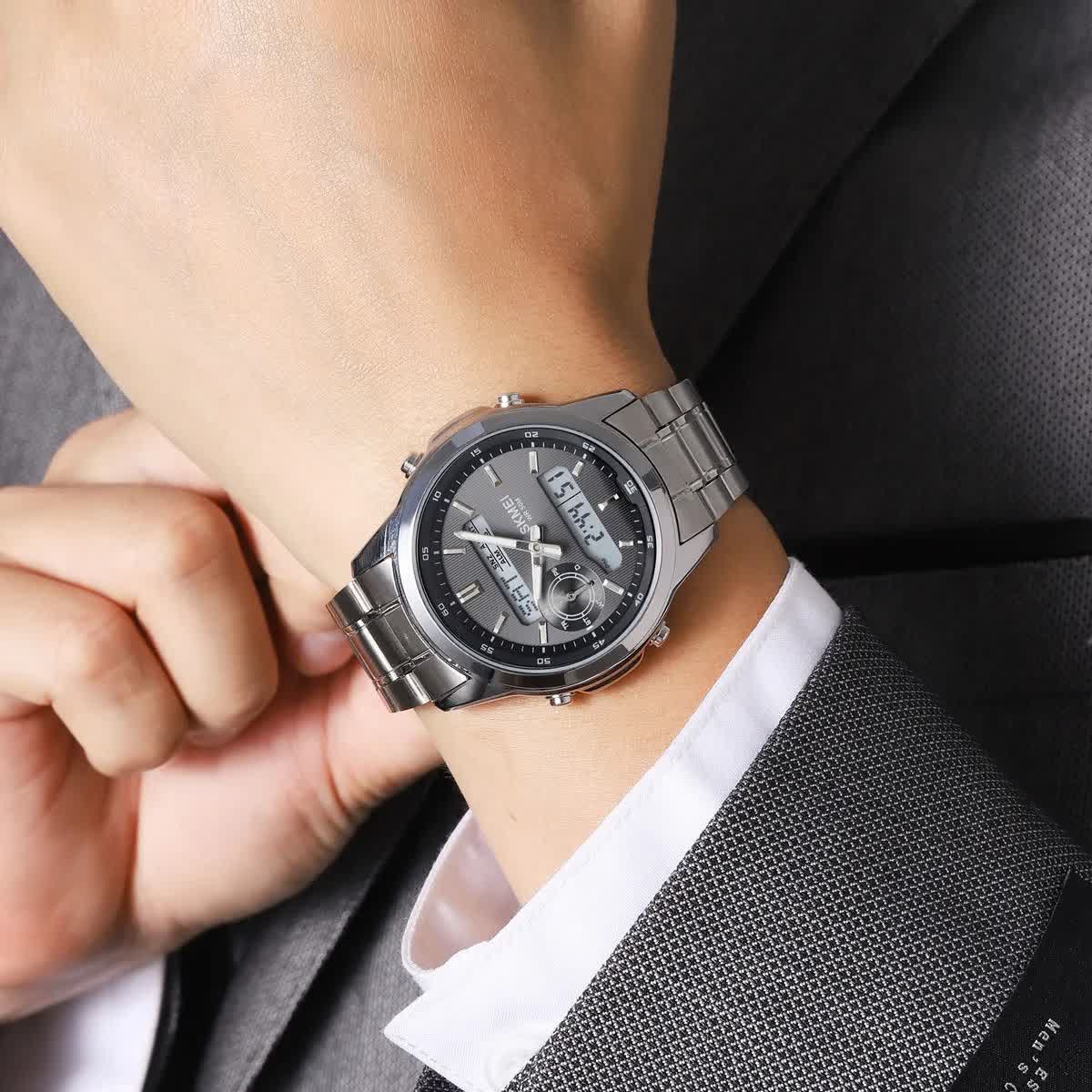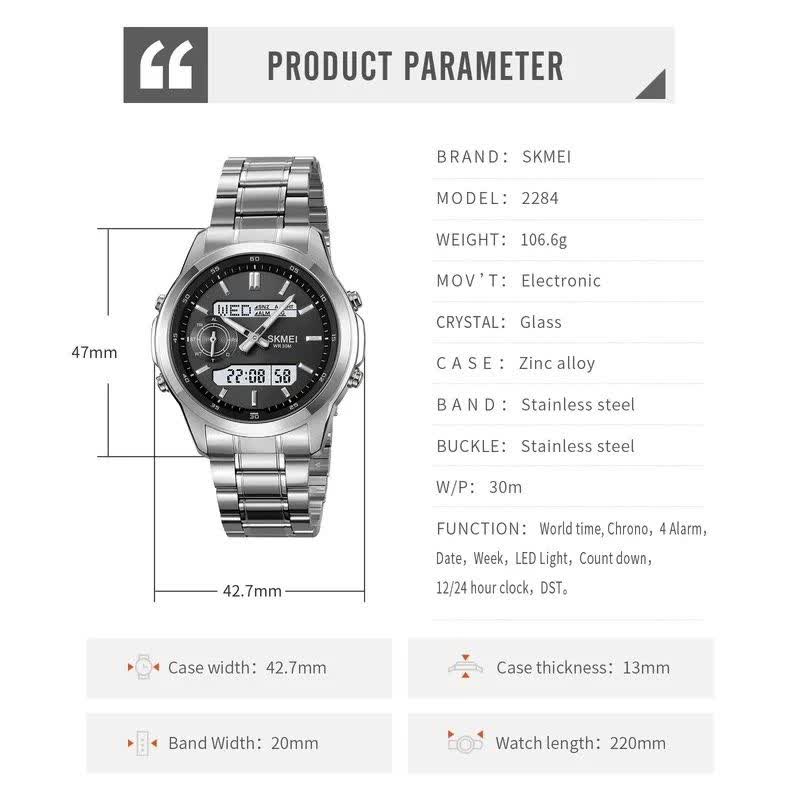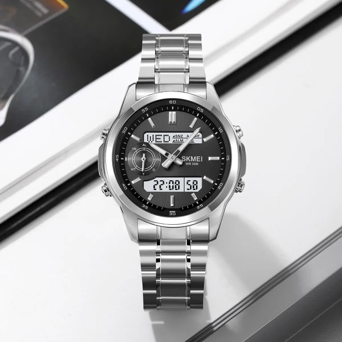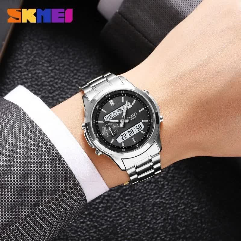 ساعت مچی مردانه عقربه ای و دیجیتال اسکمی SKMEI مدل SIBK 2284 اورجینال با بند استیل و صفحه مشکی انتخابی شیک و مدرن برای آقایان خوش استایل است. این مدل ارجینال ضمانتی همراه با جعبه بوده و دارای صفحه نمایش دیجیتال و عقربه ای با تقویم شمارش معکوس آلارم کرنومتر هفته تاریخ و ثانیه شمار میباشد. صفحه چراغ دار دید در شب خوانایی عالی را فراهم میکند و قاب استیل ضد آب در کنار صفحه ضد خط و خش دوام بالایی دارد. بند استیل رنگ ثابت ضد زنگ و ضد حساسیت پوستی با قفل کلیپسی ضامن دار امنیت و راحتی کامل را تضمین میکند. دلبر ترین ساعت را همین حالا از فروشگاه اینترنتی روبی مد تهیه کن.