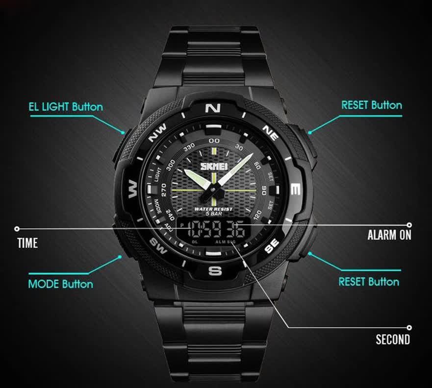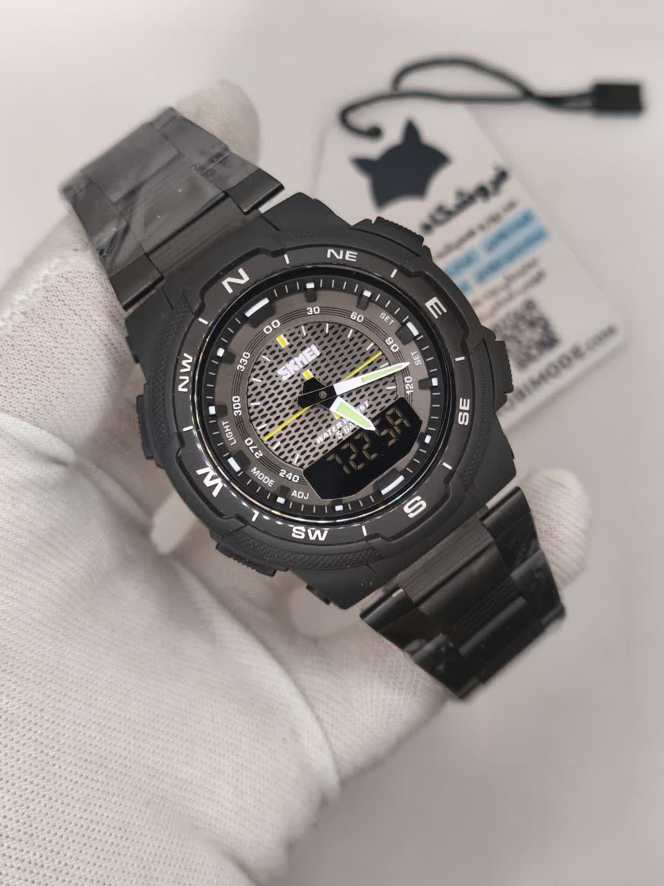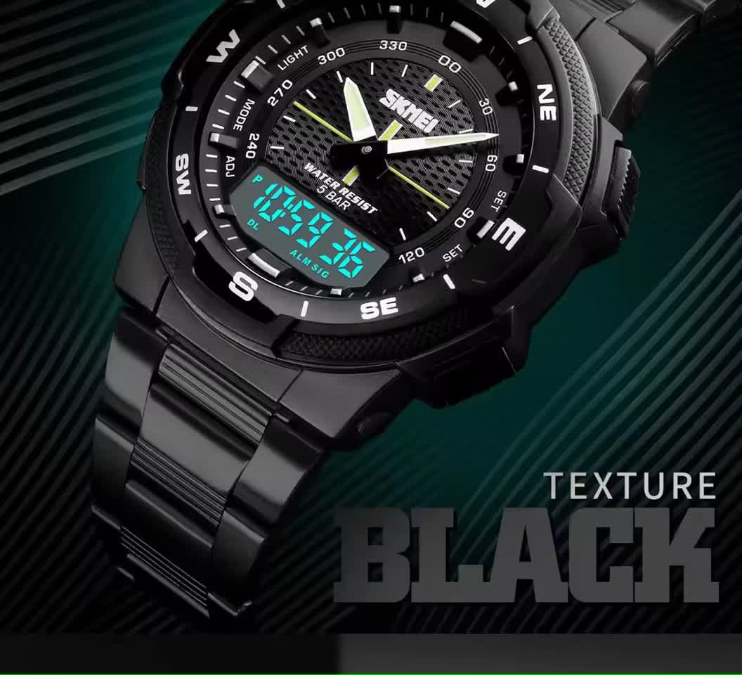 ساعت مچی مردانه عقربه ای و دیجیتال اسکمی SKMEI مدل 1370 مشکی با بند مشکی و صفحه مشکی انتخابی خاص و جذاب برای آقایان خوش سلیقه است. این مدل ارجینال ضمانتی همراه با جعبه بوده و دارای صفحه نمایش دیجیتال و عقربه ای با تقویم شمارش معکوس آلارم کرنومتر هفته تاریخ و ثانیه شمار میباشد. صفحه چراغ دار دید در شب خوانایی عالی را فراهم میکند و قاب استیل ضد آب در کنار صفحه ضد خط و خش دوام بالایی دارد. بند استیل رنگ ثابت ضد زنگ و ضد حساسیت پوستی با قفل کلیپسی ضامن دار امنیت و راحتی کامل را تضمین میکند. مناسب سخت پسند ها را همین حالا از فروشگاه اینترنتی روبی مد تهیه کن.