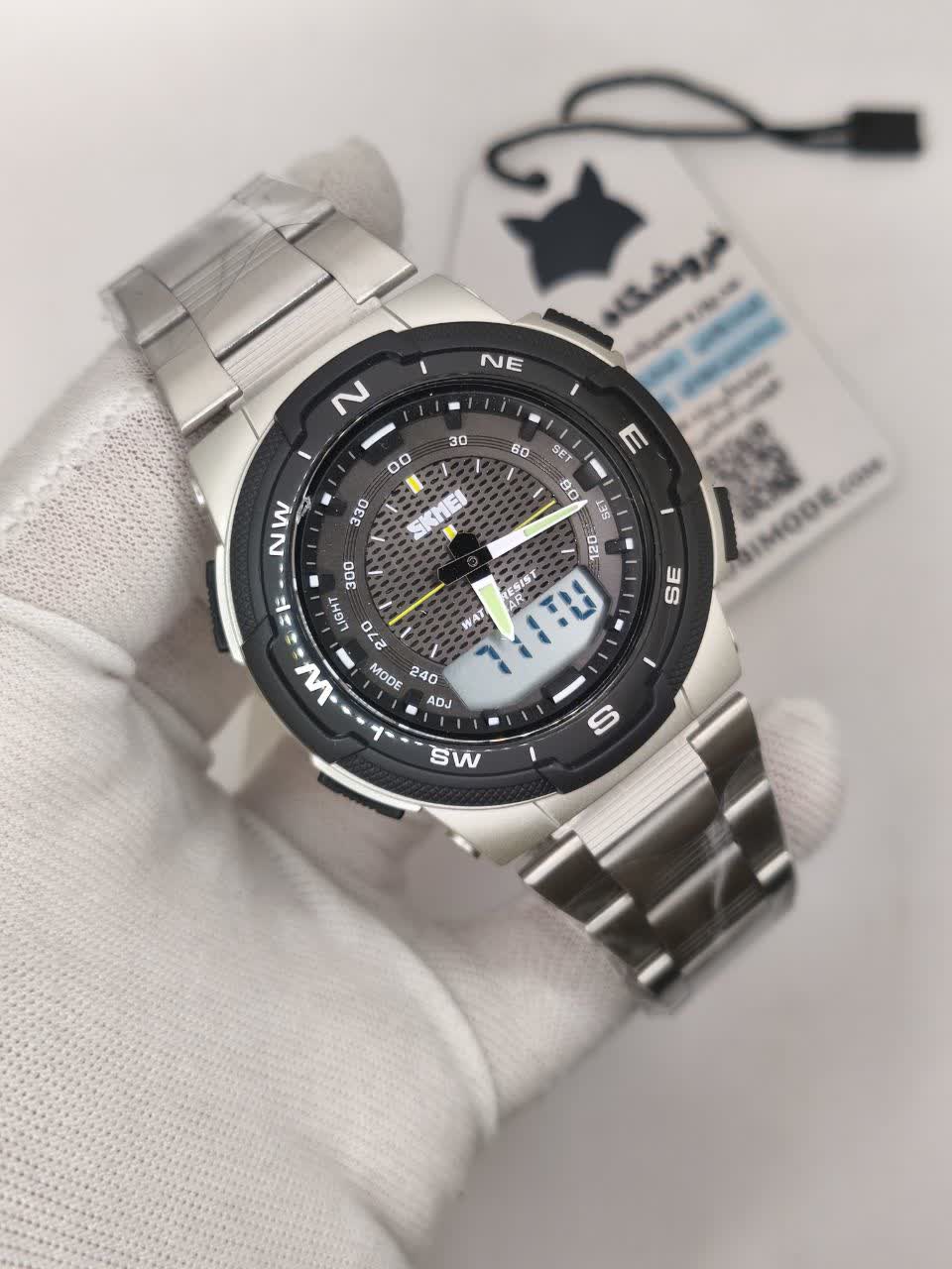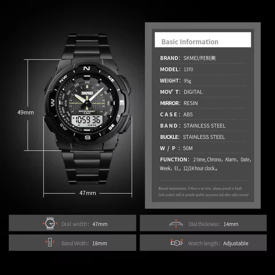 ساعت مچی مردانه عقربه ای و دیجیتال اسکمی SKMEI مدل 1370 نقره ای با بند استیل و صفحه مشکی انتخابی شیک و مدرن برای آقایان با سلیقه خاص است. این مدل اورجینال ضمانتی همراه با جعبه بوده و دارای صفحه نمایش دیجیتال و عقربه ای با تقویم شمارش معکوس آلارم کرنومتر هفته تاریخ و ثانیه شمار میباشد. صفحه چراغ دار دید در شب خوانایی عالی را فراهم میکند و قاب استیل ضد آب در کنار صفحه ضد خط و خش دوام بالایی دارد. بند استیل رنگ ثابت ضد زنگ و ضد حساسیت پوستی با قفل کلیپسی ضامن دار راحتی و امنیت کامل را تضمین میکند. برای تو که بهترینی را همین حالا از فروشگاه اینترنتی روبی مد تهیه کن.