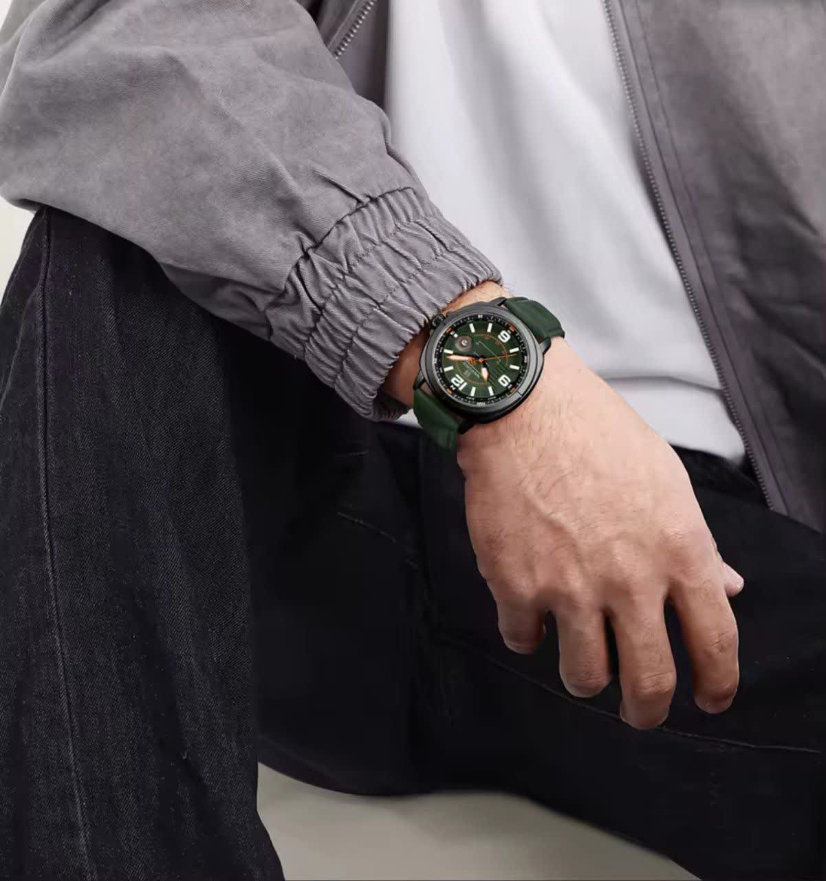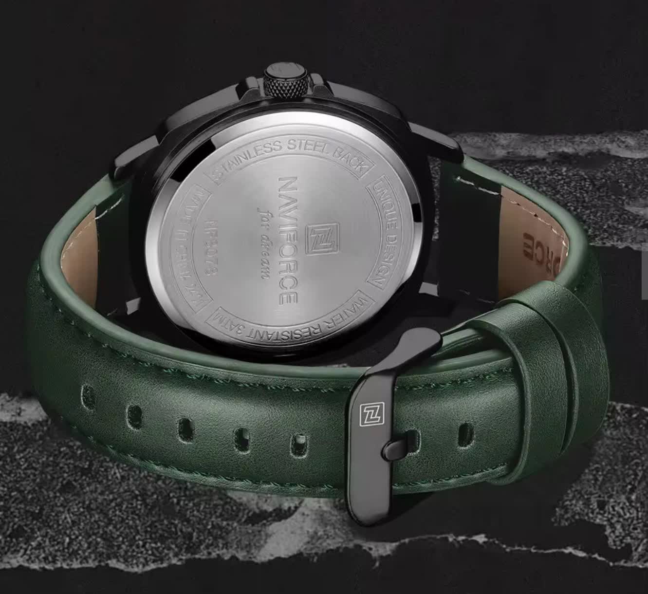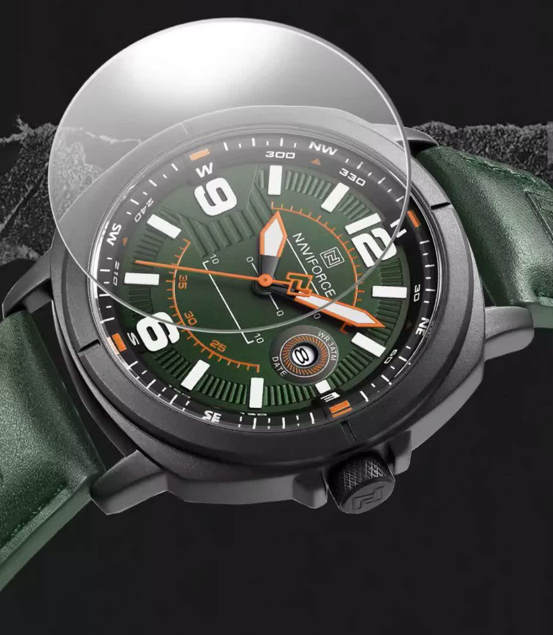 ساعت مچی عقربه ای مردانه NAVIFORCE مدل Nf8078 با طراحی شیک و خاص، انتخابی جذاب برای آقایان خوش استایل است که با رنگ بند چرم سبز لجنی، صفحه لجنی و قاب مشکی جلوه ای متفاوت و چشم نواز ایجاد می کند. این مدل اورجینال همراه با کارت گارانتی، جعبه اصلی و گارانتی نیوی فورس ایران ارائه می شود و به موتور ژاپن کوارتز دقیق و تقویم دار مجهز است. شیشه معدنی مقاوم، قاب استیل رنگ ثابت و عقربه های شب نما خوانایی و دوام بالایی را فراهم می کند. بند چرمی دور دوخت با خاصیت ضد تعریق در کنار قفل سگکی راحتی و استحکام را تضمین می کند و مقاومت در برابر آب خیال شما را از استفاده روزمره آسوده می سازد. این محصول با کیفیت را می توانید با اطمینان از فروشگاه اینترنتی روبی مد تهیه کنید.