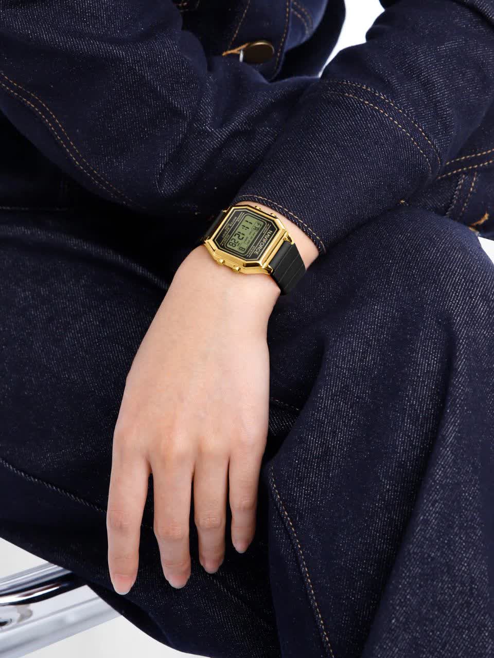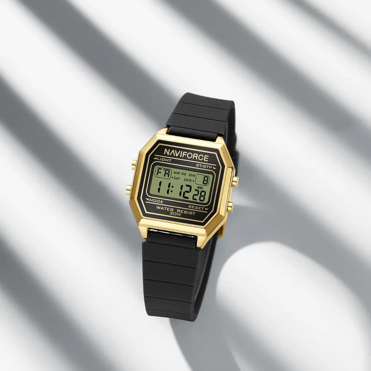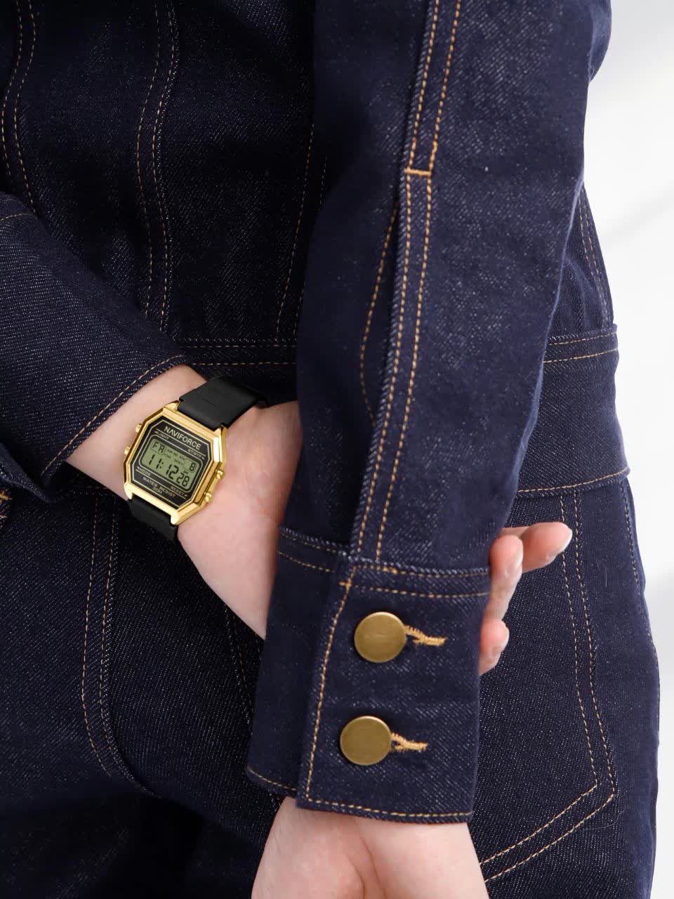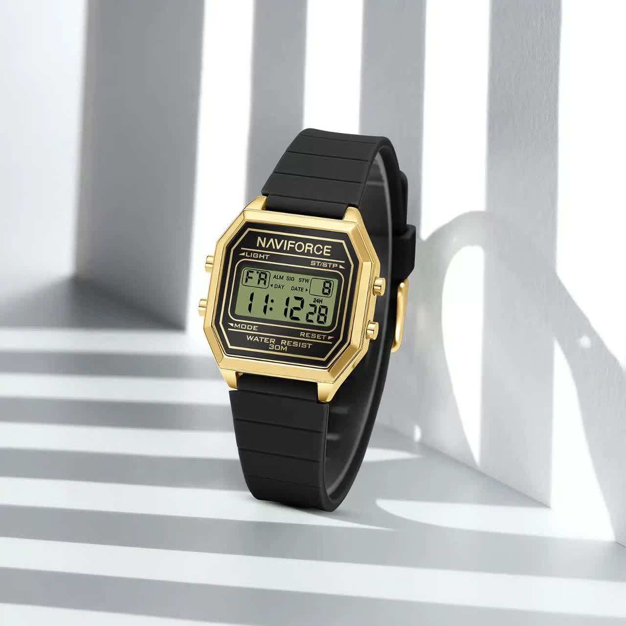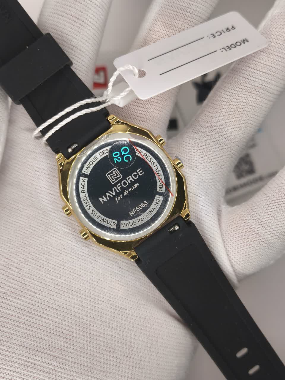 ساعت مچی زنانه دیجیتال NAVIFORCE مدل Nf5063t با بند مشکی رابر و قاب طلایی، طراحی شیک با فرم صفحه مربع شکل دارد و گزینه ای ایده آل برای استفاده روزمره و اسپرت است. این مدل اورجینال همراه با کارت گارانتی و جعبه اصلی و گارانتی نیوی فورس ایران عرضه می شود و به موتور ژاپن کوارتز دقیق مجهز است. امکاناتی مانند کرنومتر، تایمر، تقویم، ثانیه شمار و صفحه چراغ دار در کنار خاصیت ضد آب، کارایی کامل را فراهم می کند. قاب استیل رنگ ثابت، شیشه معدنی ضد خش و بند سیلیکونی با کیفیت عالی و ضد حساسیت با قابلیت تعویض آسان و قفل سگکی سوزنی کمربندی دوام و راحتی بالایی را تضمین می کند. این محصول را می توانید با اطمینان از فروشگاه اینترنتی روبی مد تهیه کنید.