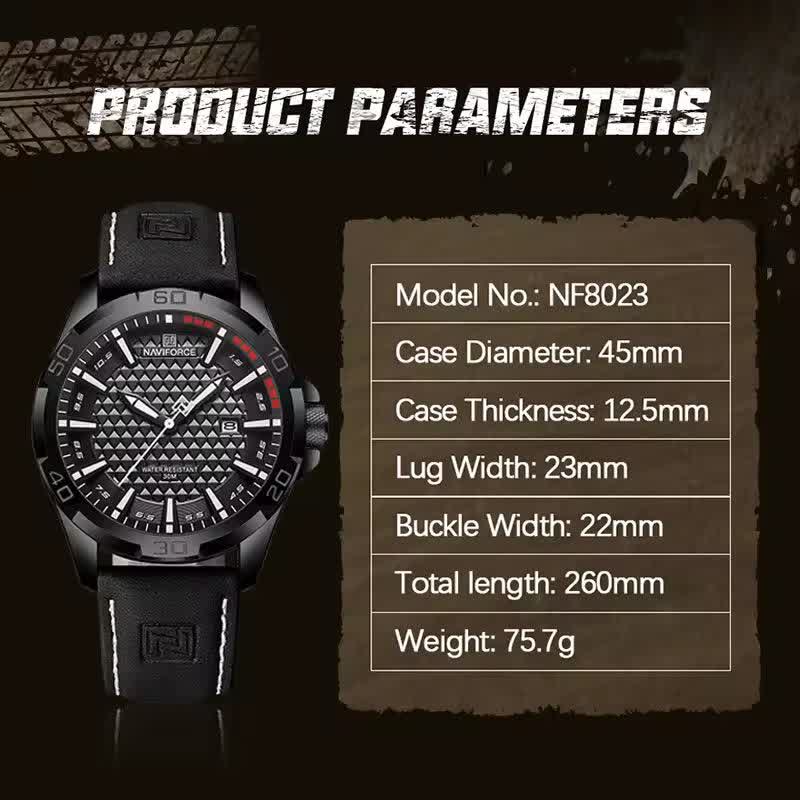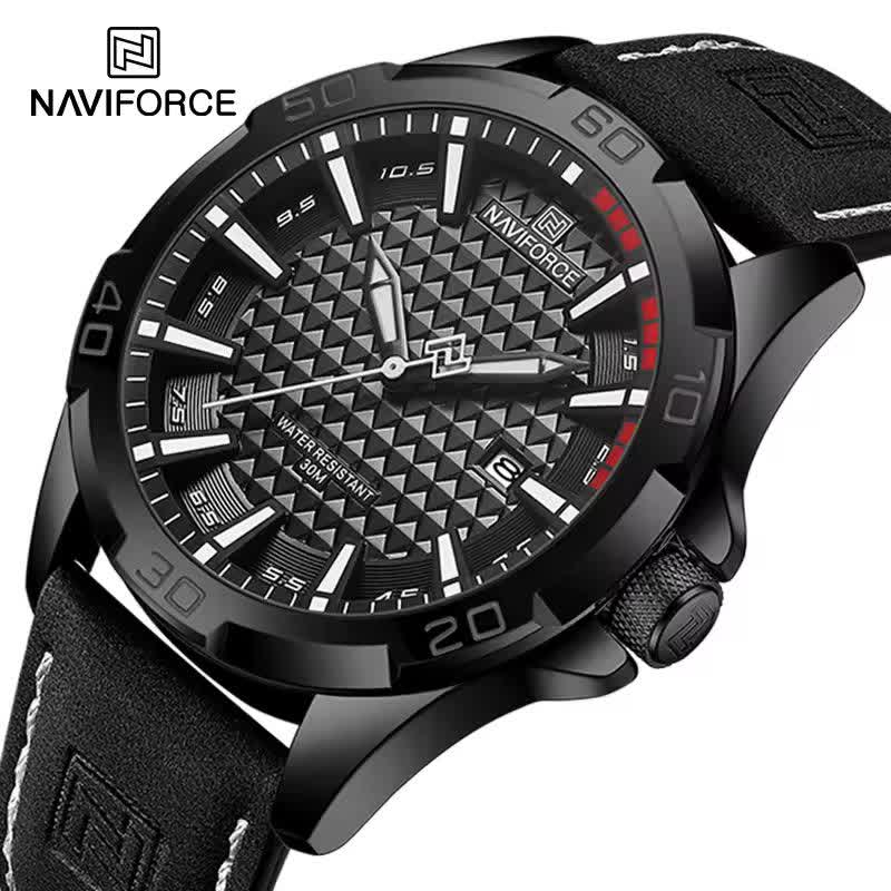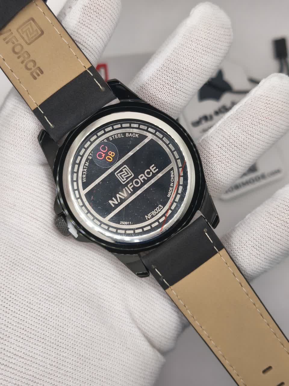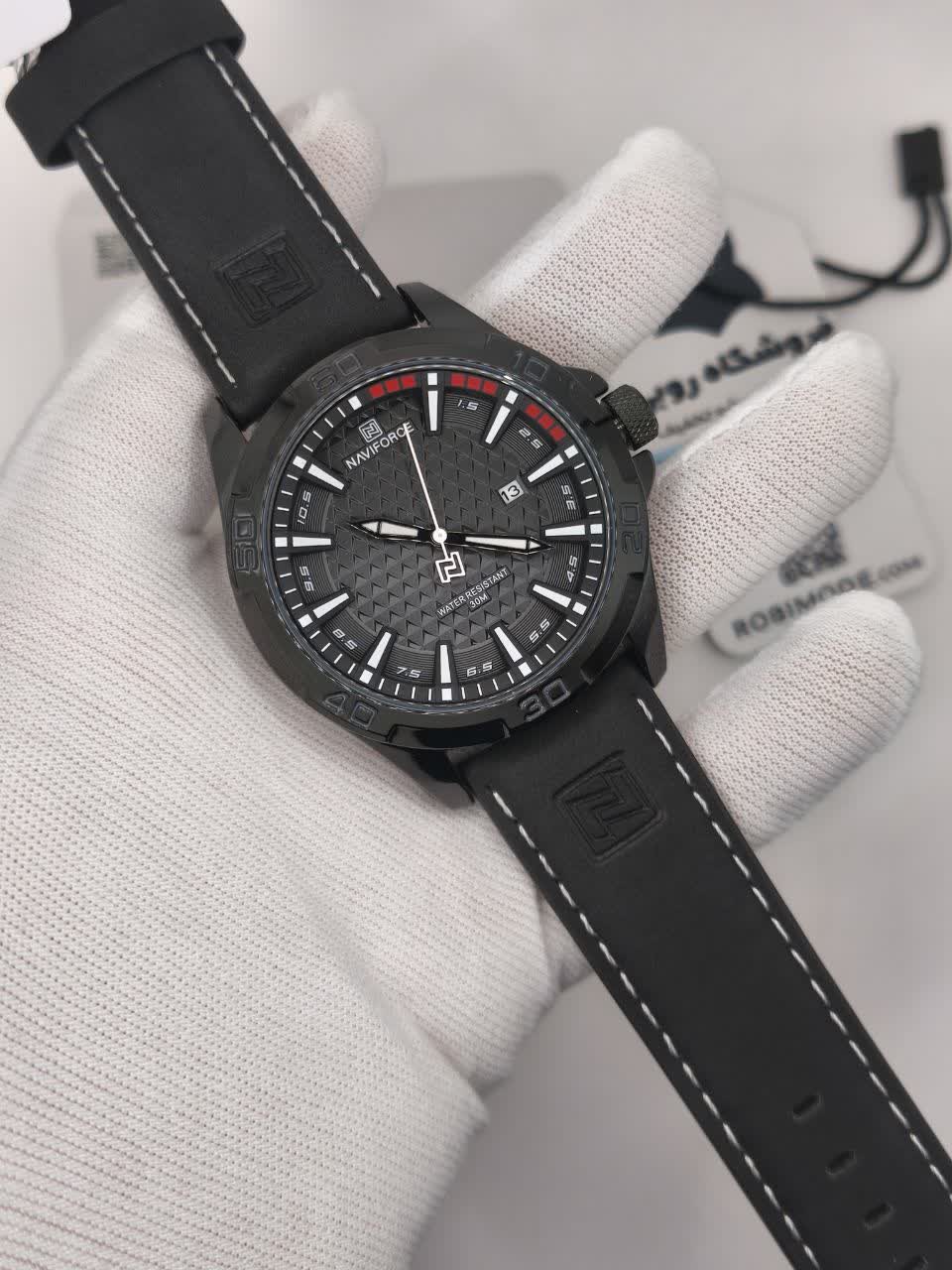 ساعت مچی عقربه ای مردانه NAVIFORCE مدل Nf8023 مشکی با ترکیب بند مشکی، صفحه مشکی و قاب استیل، طراحی شیک و کلاسیک با فرم صفحه دایره شکل دارد و مناسب هر سبک و استایل است. این مدل اورجینال همراه با کارت گارانتی و جعبه اصلی و گارانتی نیوی فورس ایران ارائه می شود و به موتور ژاپن دقیق و تقویم دار مجهز است. قاب استیل رنگ ثابت، شیشه معدنی ضد خش و صفحه شب نما در کنار خاصیت ضد آب کیفیت و دوام بالایی را تضمین می کند. بند چرم دور دوخت با ویژگی ضد حساسیت پوستی و قفل کمربندی سوزنی سگکی راحتی و استحکام را فراهم می سازد و این محصول را می توانید از فروشگاه اینترنتی روبی مد تهیه کنید.