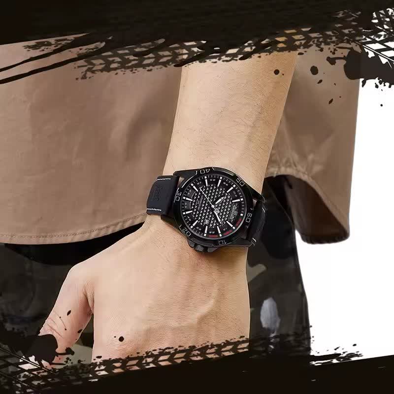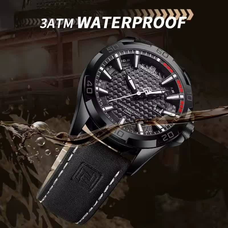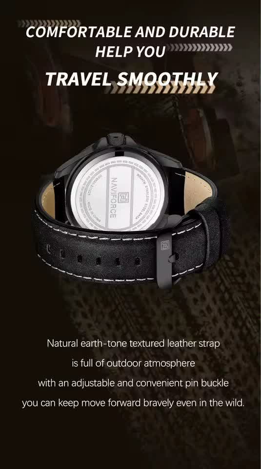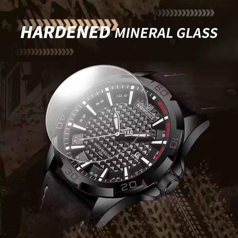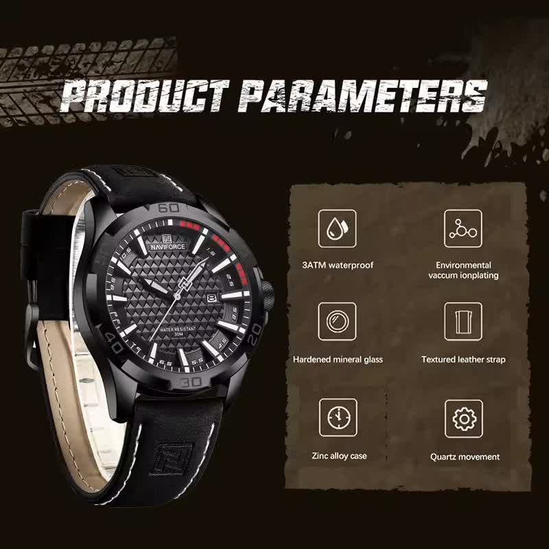 ساعت مچی عقربه ای مردانه NAVIFORCE مدل Nf8023 مشکی با ترکیب بند مشکی، صفحه مشکی و قاب استیل، طراحی شیک و کلاسیک با فرم صفحه دایره شکل دارد و مناسب هر سبک و استایل است. این مدل اورجینال همراه با کارت گارانتی و جعبه اصلی و گارانتی نیوی فورس ایران ارائه می شود و به موتور ژاپن دقیق و تقویم دار مجهز است. قاب استیل رنگ ثابت، شیشه معدنی ضد خش و صفحه شب نما در کنار خاصیت ضد آب کیفیت و دوام بالایی را تضمین می کند. بند چرم دور دوخت با ویژگی ضد حساسیت پوستی و قفل کمربندی سوزنی سگکی راحتی و استحکام را فراهم می سازد و این محصول را می توانید از فروشگاه اینترنتی روبی مد تهیه کنید.
