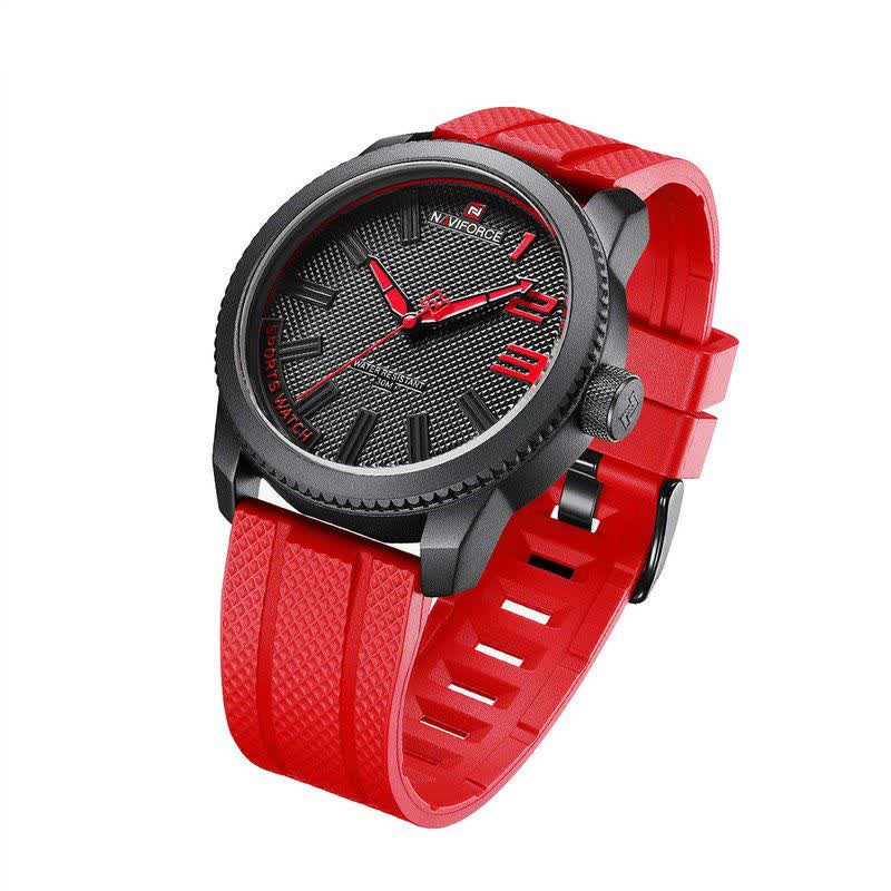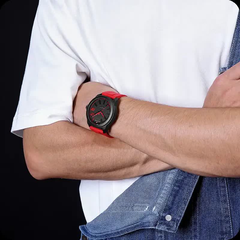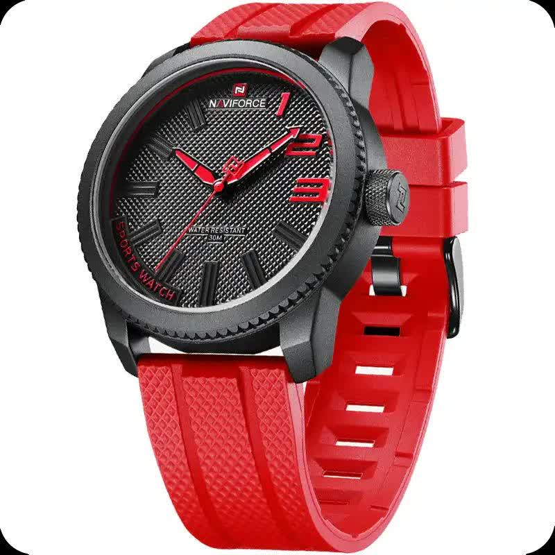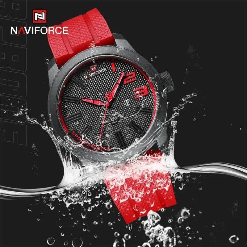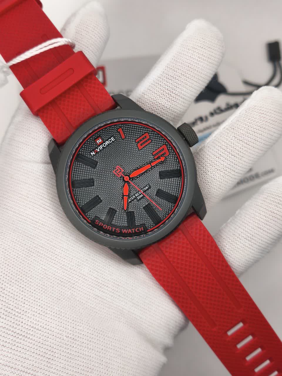 ساعت مچی مردانه NAVIFORCE مدل Nf9202 اصلی قرمز با بند قرمز، صفحه مشکی و قاب مشکی طراحی اسپرت و جذاب با فرم صفحه گرد دارد و مناسب استایل های روزمره و خاص است. این مدل اورجینال همراه با کارت گارانتی و جعبه اصلی و گارانتی نیوی فورس ایران عرضه می شود و به موتور ژاپن کوارتز با دقت بالا مجهز است. قاب استیل مقاوم، شیشه معدنی ضد خش، عقربه شب نما و خاصیت ضد آب کیفیت و دوام بالایی را تضمین می کند. بند سیلیکونی ضد حساسیت پوستی با قابلیت تعویض آسان و قفل کمربندی سوزنی سگکی راحتی و امنیت را فراهم می سازد و این محصول را می توانید از فروشگاه اینترنتی روبی مد تهیه کنید.
