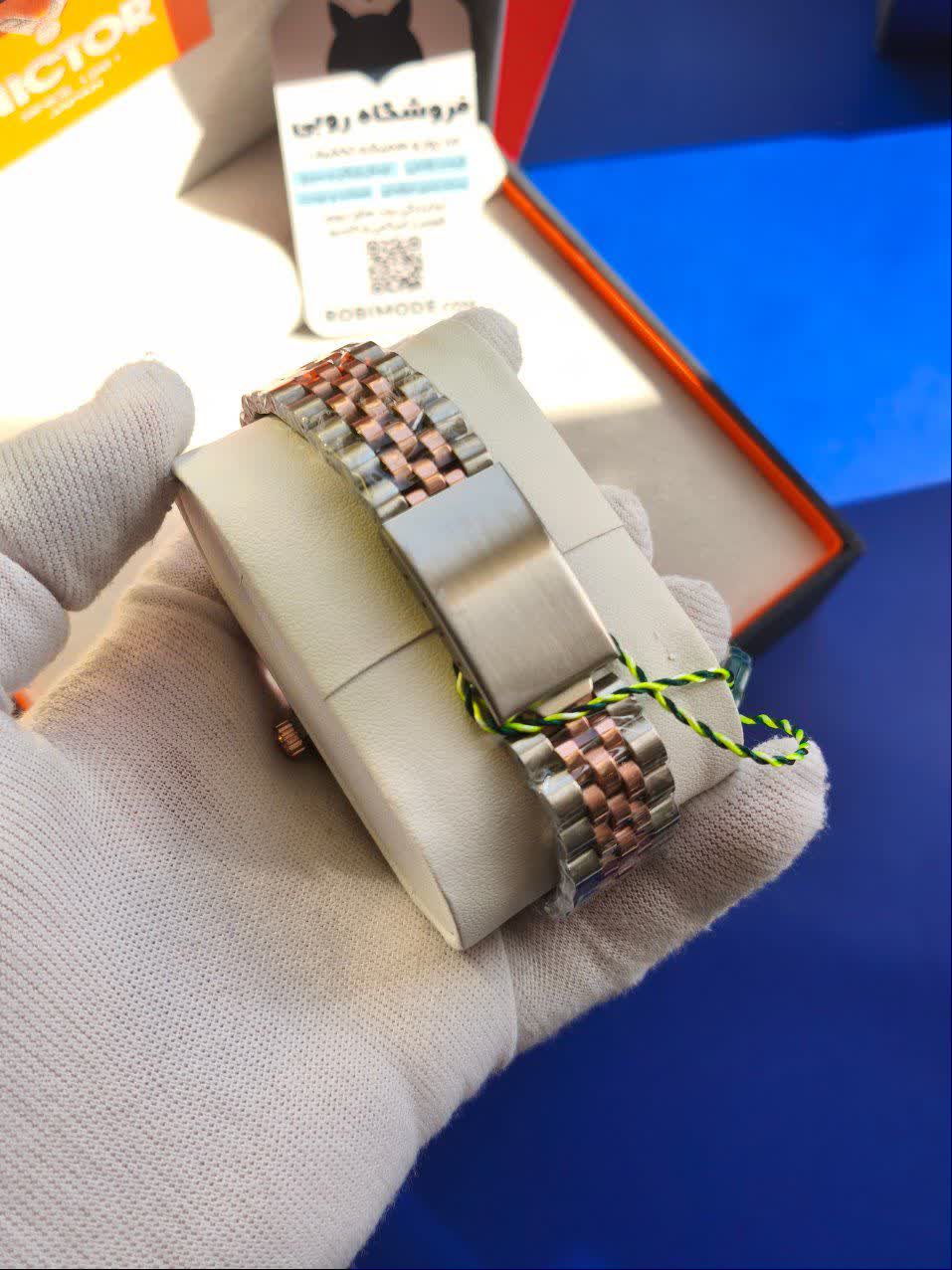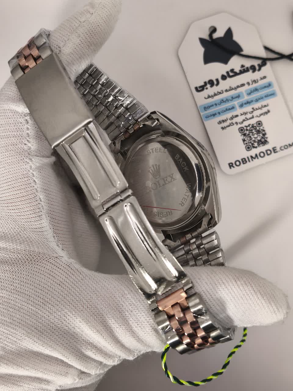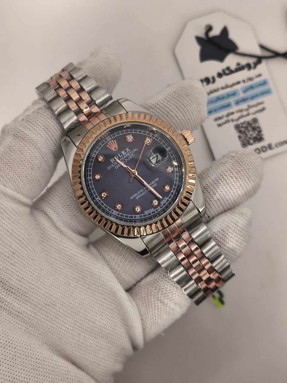 ساعت مچی مردانه رولکس دی دیت جاس ROLEX رزگلد با طراحی لوکس و چشم نواز انتخابی ایده آل برای آقایان خوش پوش است. این مدل با بند نقره ای رگه طلایی و صفحه مشکی جلوه ای خاص دارد و از استیل رنگ ثابت ضد زنگ با کیفیت فوق العاده ساخته شده است. دارای تقویم دار تلسکوپی بند توپُر سنگین ارجینال قفل کلیپسی ضامن دار و صفحه و عقربه شب نما می باشد. شیشه معدنی نشکن صفحه ضد خط و خش بند ضد حساسیت پوستی و ساختار ضد آب واشر دار دوام و کارایی آن را تضمین می کند. صفحه دور الماس ثابت با فرم دایره ای به همراه جعبه رایگان عرضه شده و هم اکنون از فروشگاه اینترنتی روبی مد قابل سفارش است.