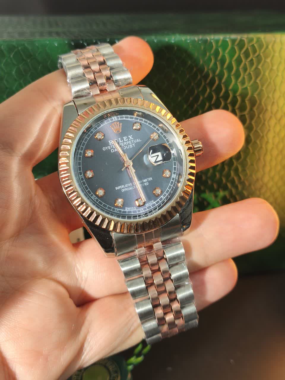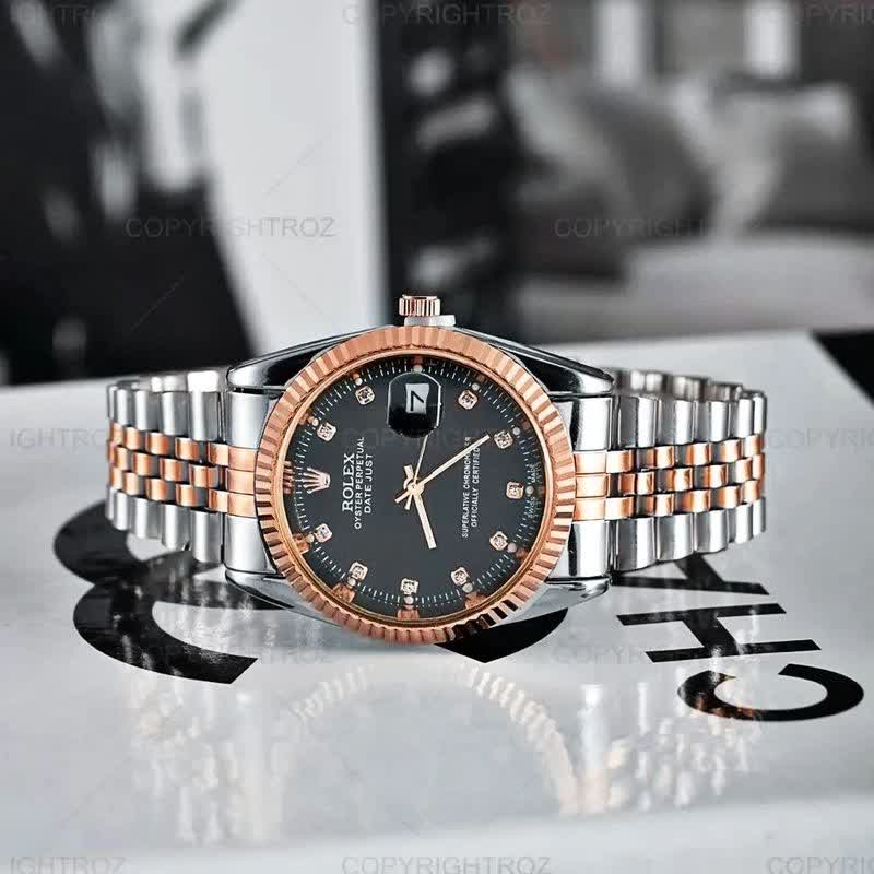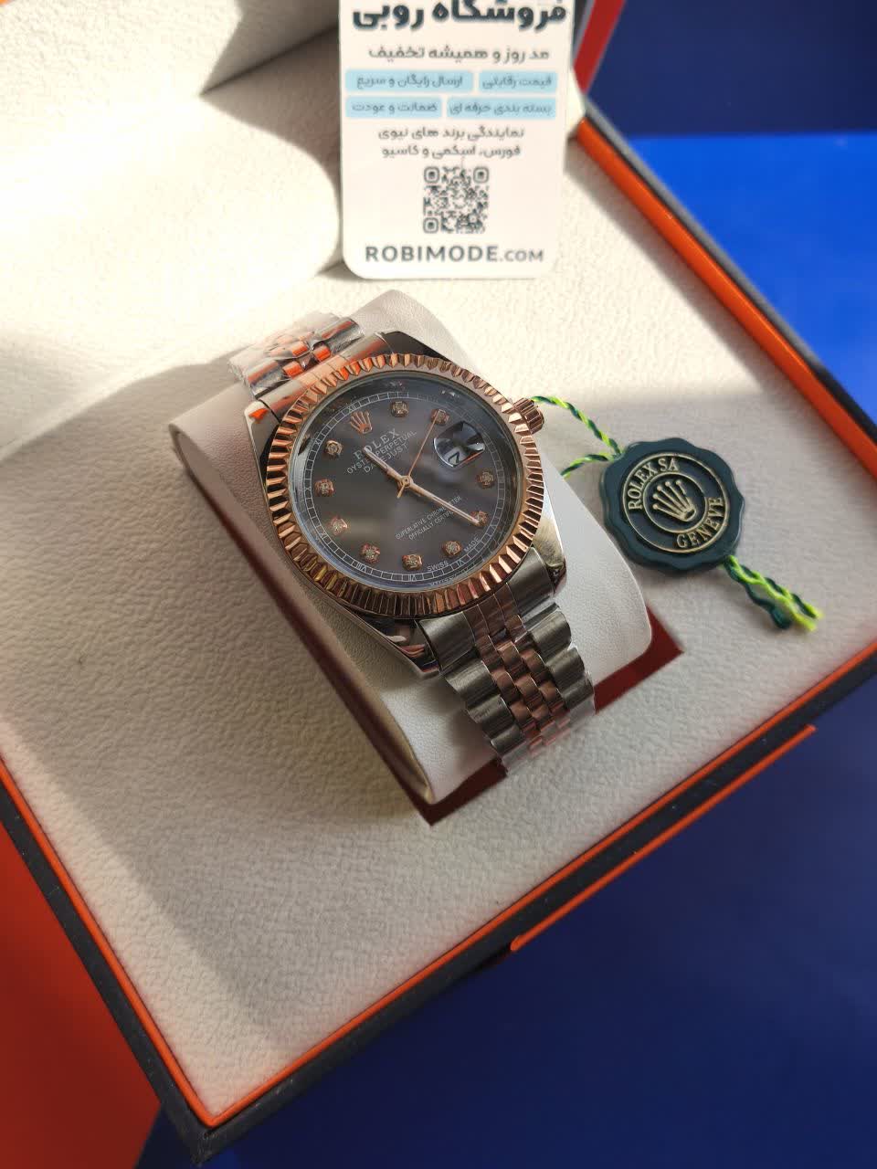 ساعت مچی مردانه رولکس دی دیت جاس ROLEX رزگلد با طراحی لوکس و چشم نواز انتخابی ایده آل برای آقایان خوش پوش است. این مدل با بند نقره ای رگه طلایی و صفحه مشکی جلوه ای خاص دارد و از استیل رنگ ثابت ضد زنگ با کیفیت فوق العاده ساخته شده است. دارای تقویم دار تلسکوپی بند توپُر سنگین ارجینال قفل کلیپسی ضامن دار و صفحه و عقربه شب نما می باشد. شیشه معدنی نشکن صفحه ضد خط و خش بند ضد حساسیت پوستی و ساختار ضد آب واشر دار دوام و کارایی آن را تضمین می کند. صفحه دور الماس ثابت با فرم دایره ای به همراه جعبه رایگان عرضه شده و هم اکنون از فروشگاه اینترنتی روبی مد قابل سفارش است.