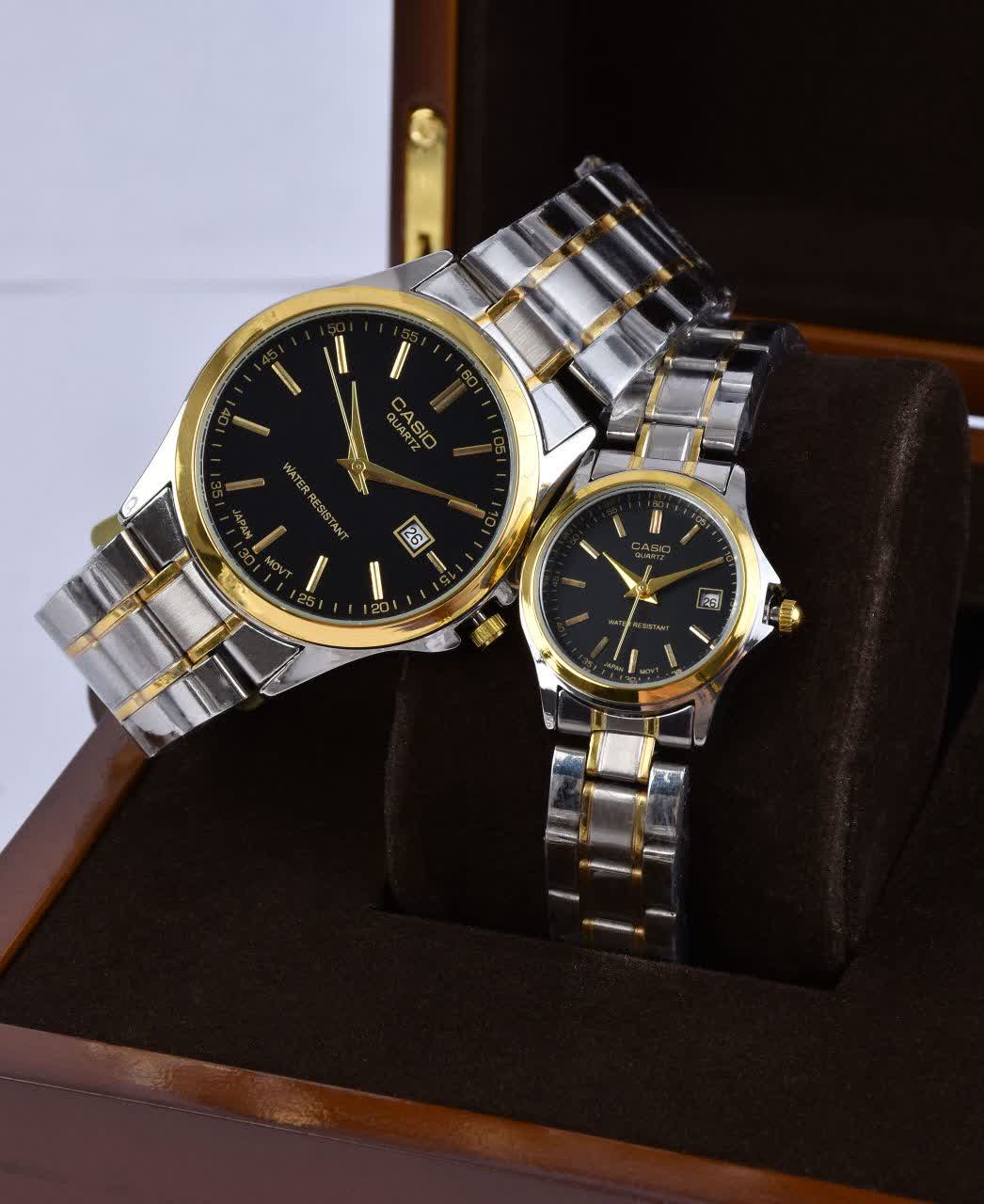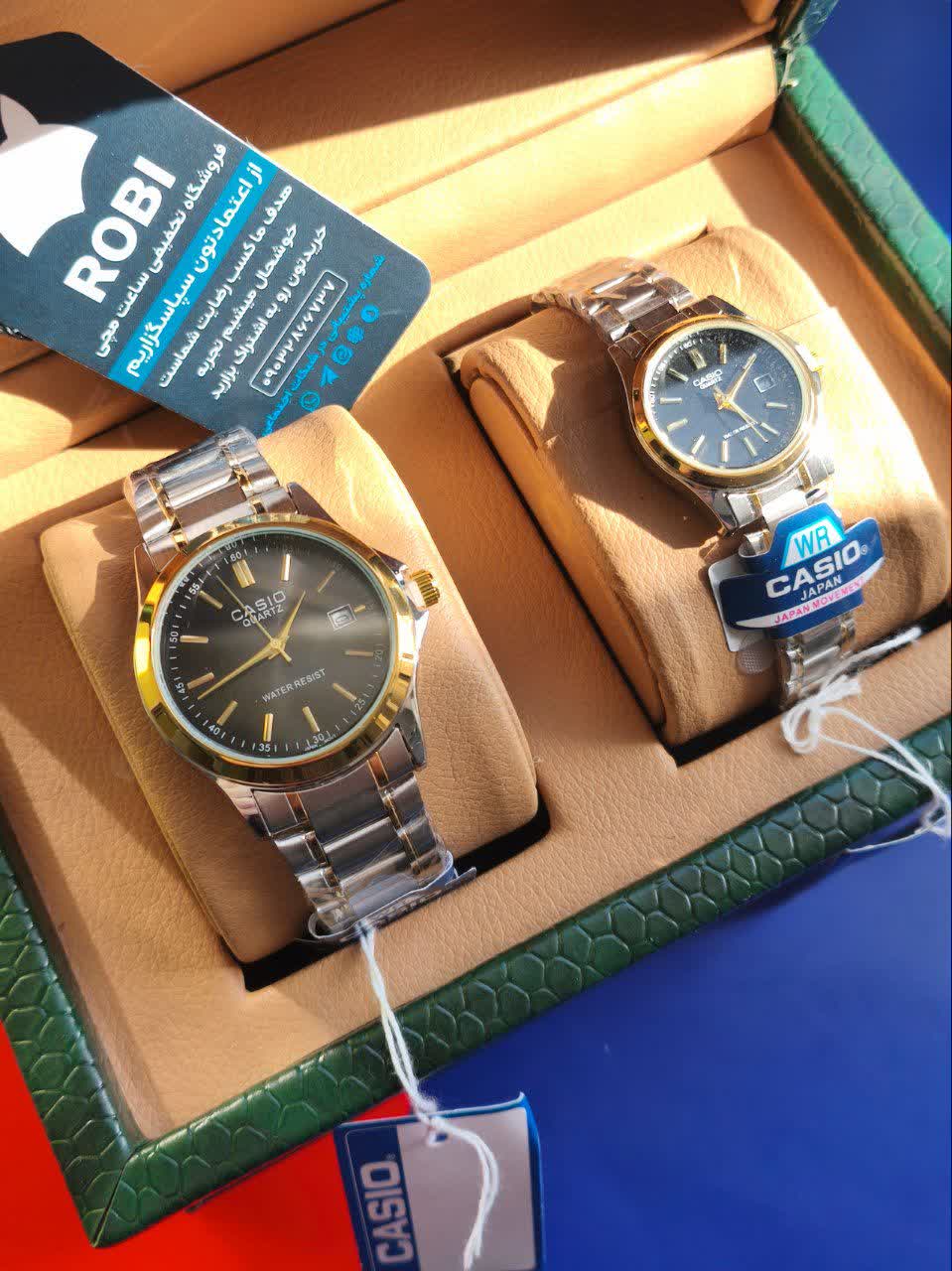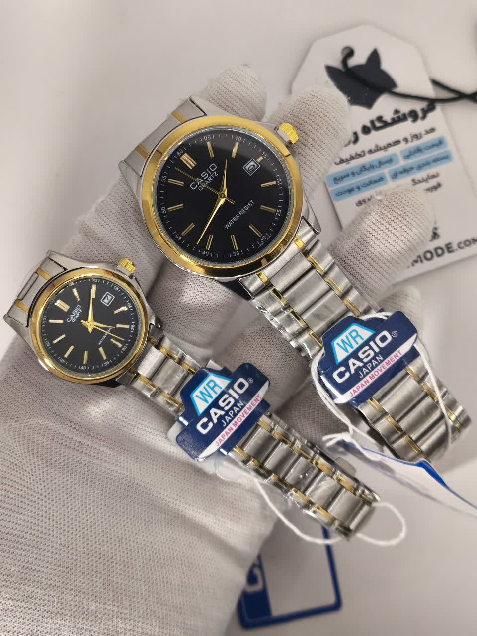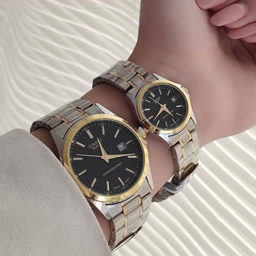 ست ساعت مچی زنانه و مردانه کاسیو CASIO موتور ژاپنی کد 1 انتخابی شیک و خاص برای زوج های خوش سلیقه است. این مدل با بند نقره ای رگه طلایی و صفحه مشکی طراحی شده و متفاوت با نمونه های بازاری می باشد. بهره مند از موتور ژاپن با تکنولوژی کوارتز تقویم دار و ضد آب بوده و از استیل رنگ ثابت ضد زنگ با کیفیت بالا ساخته شده است. دارای قفل کلیپسی ضامن دار عقربه و صفحه شب نما شیشه معدنی نشکن صفحه ضد خط و خش و بند ضد حساسیت پوستی با فرم صفحه دایره ای است. این ست جذاب به همراه جعبه رایگان از فروشگاه اینترنتی روبی مد قابل تهیه می باشد.
