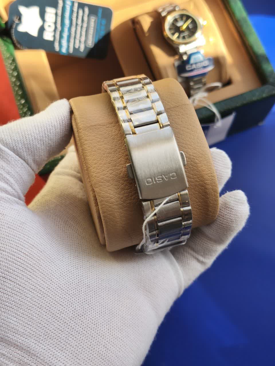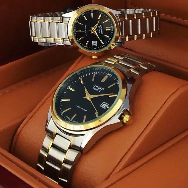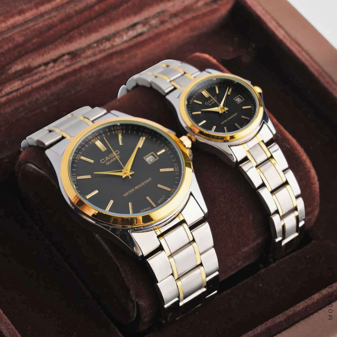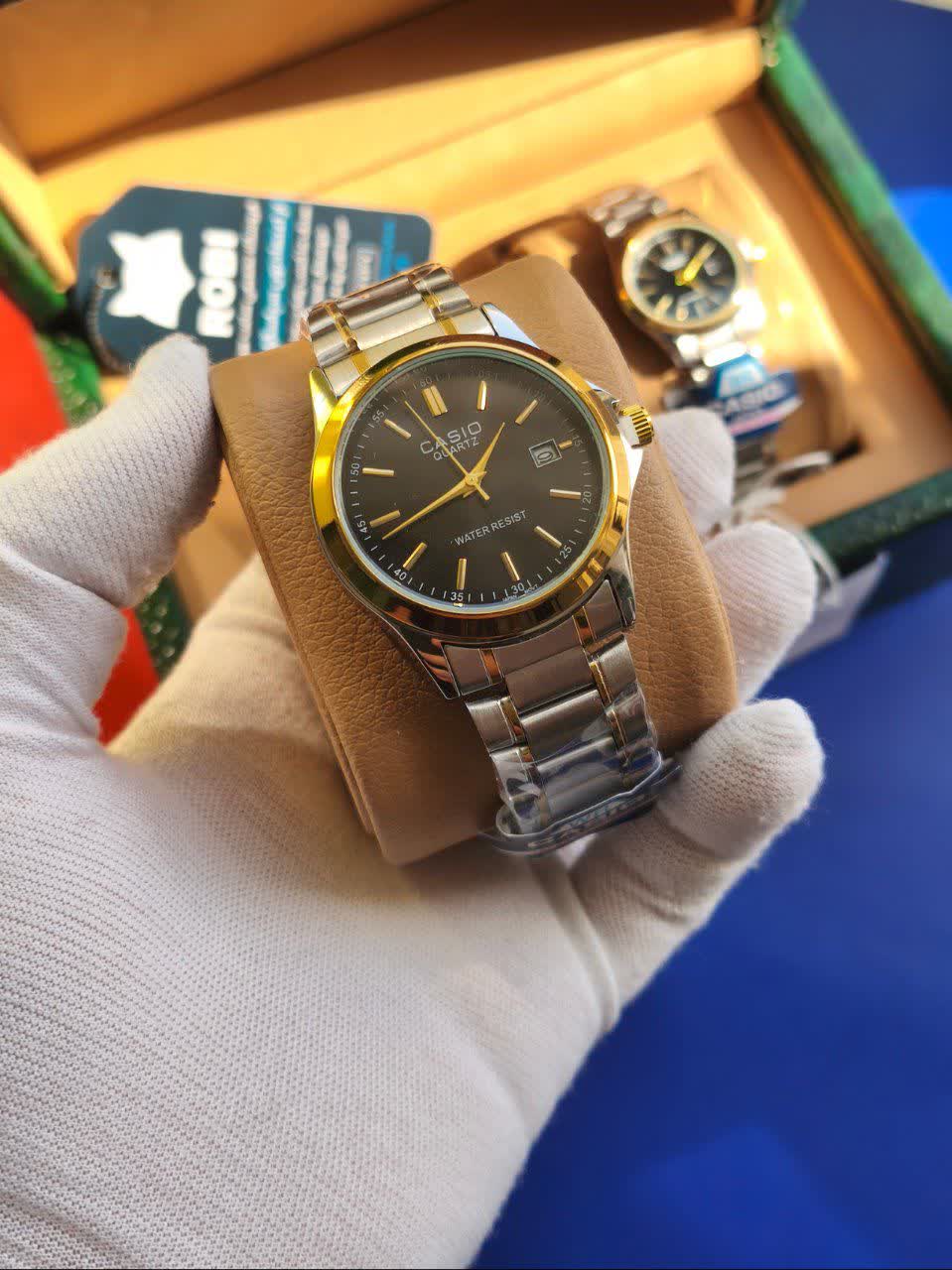 ست ساعت مچی زنانه و مردانه کاسیو CASIO موتور ژاپنی کد 1 انتخابی شیک و خاص برای زوج های خوش سلیقه است. این مدل با بند نقره ای رگه طلایی و صفحه مشکی طراحی شده و متفاوت با نمونه های بازاری می باشد. بهره مند از موتور ژاپن با تکنولوژی کوارتز تقویم دار و ضد آب بوده و از استیل رنگ ثابت ضد زنگ با کیفیت بالا ساخته شده است. دارای قفل کلیپسی ضامن دار عقربه و صفحه شب نما شیشه معدنی نشکن صفحه ضد خط و خش و بند ضد حساسیت پوستی با فرم صفحه دایره ای است. این ست جذاب به همراه جعبه رایگان از فروشگاه اینترنتی روبی مد قابل تهیه می باشد.