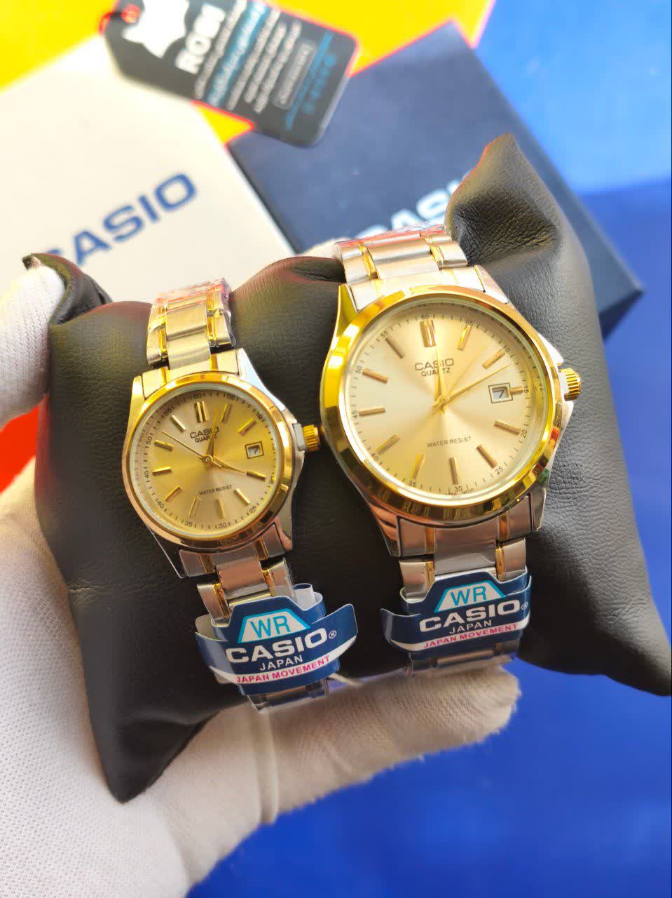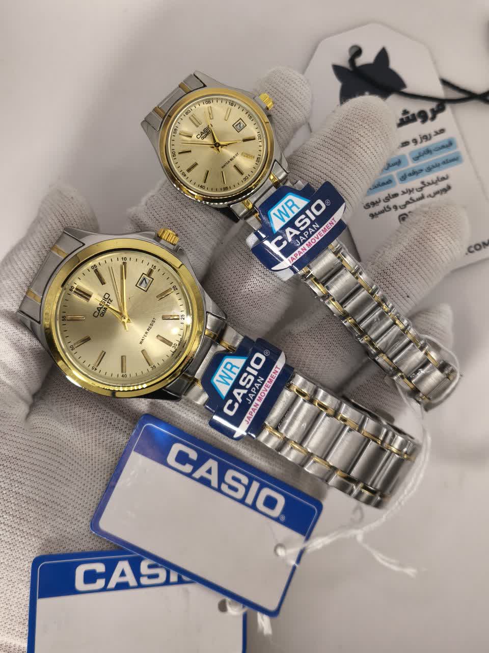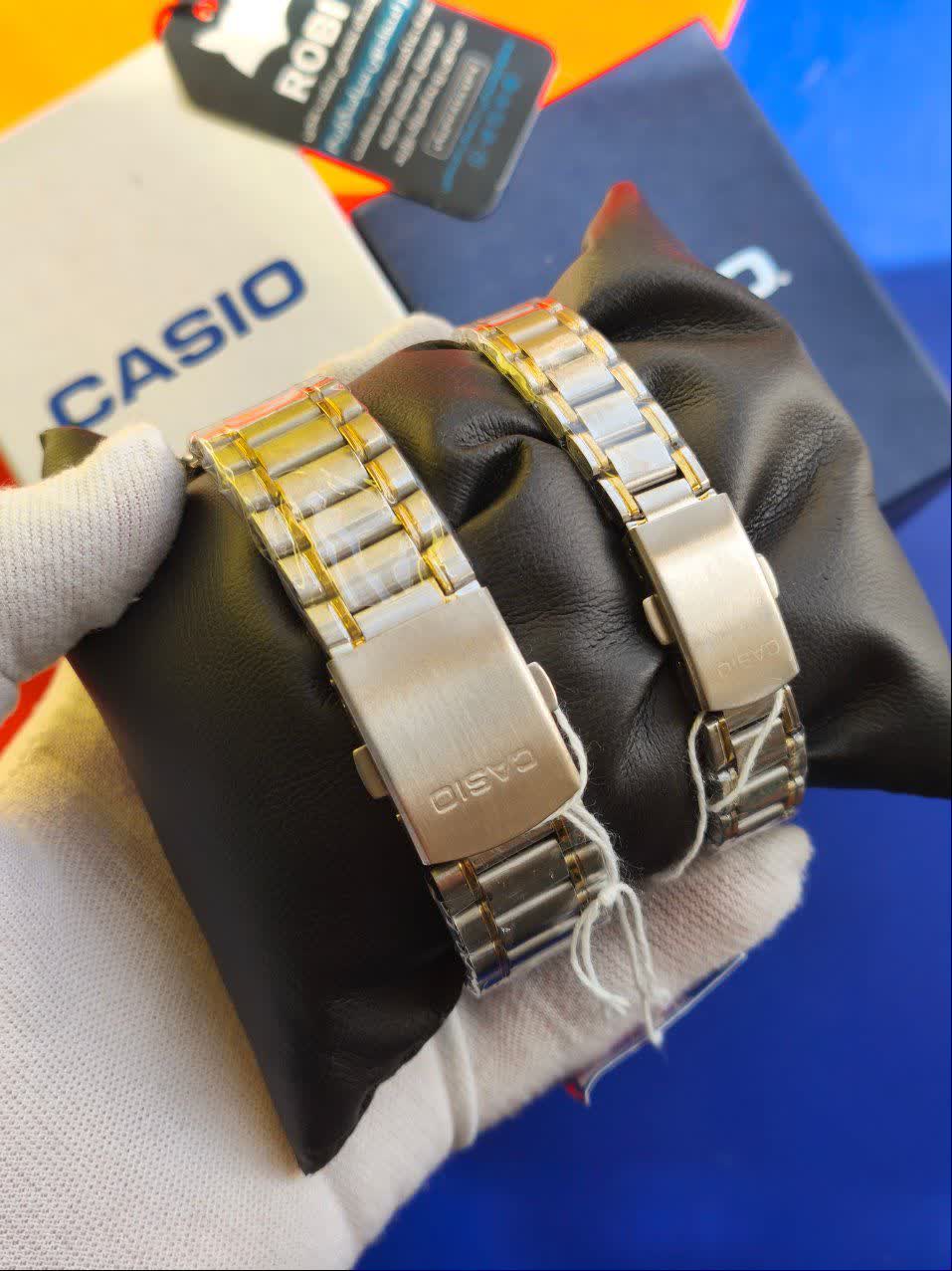 ست ساعت مچی زنانه و مردانه کاسیو CASIO موتور ژاپنی کد 2 انتخابی لوکس و هماهنگ برای زوج های خوش سلیقه است. این مدل با بند نقره ای رگه طلایی و صفحه طلایی طراحی شده و متفاوت با نمونه های بازاری می باشد. مجهز به موتور ژاپن با تکنولوژی کوارتز بوده و دارای تقویم دار و ضد آب است و از استیل رنگ ثابت ضد زنگ با کیفیت بالا ساخته شده است. قفل کلیپسی ضامن دار عقربه و صفحه شب نما شیشه معدنی نشکن صفحه ضد خط و خش و بند ضد حساسیت پوستی با فرم صفحه دایره ای از ویژگی های کاربردی آن است. این ست شیک به همراه جعبه رایگان از فروشگاه اینترنتی روبی مد قابل سفارش می باشد.