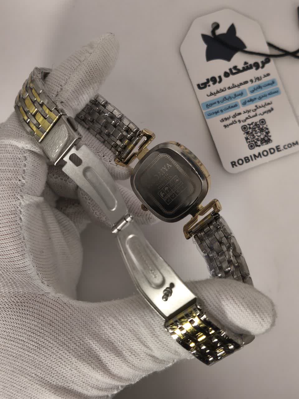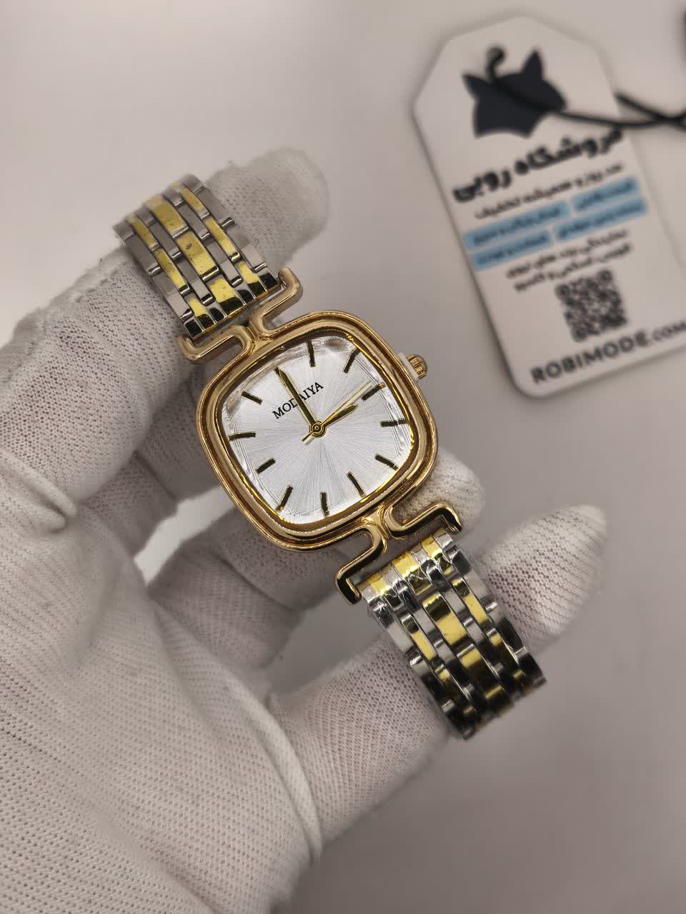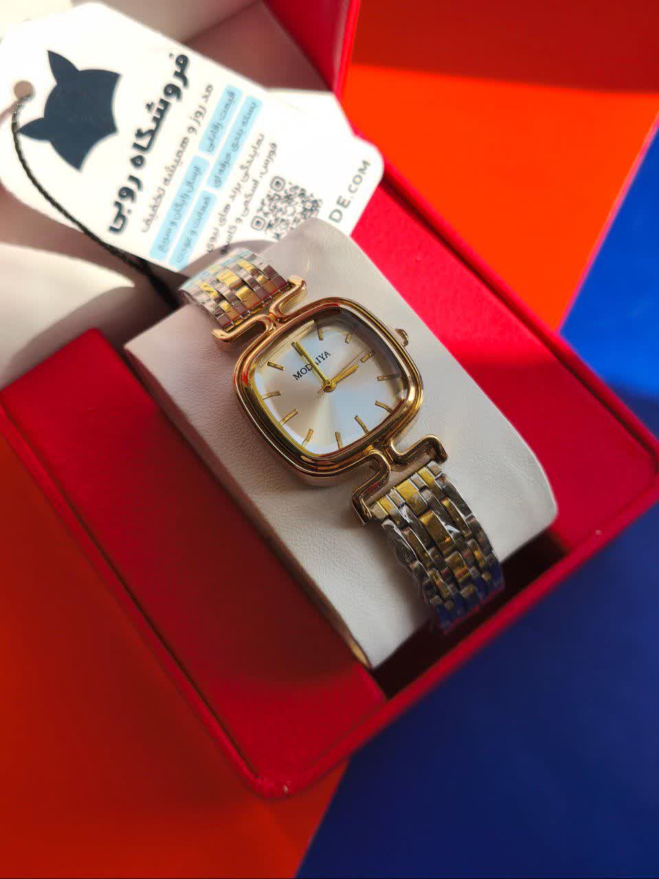 ساعت مچی عقربه ای زنانه مودیا MODAIYA پاپیونی با طراحی ظریف و خاص انتخابی متفاوت برای بانوان خوش سلیقه است. این مدل با بند نقره ای رگه طلایی و صفحه سفید جلوه ای شیک داشته و با طرح پاپیونی خاص زیبایی استایل شما را تکمیل می کند. بدنه از استیل رنگ ثابت ضد زنگ ساخته شده و دارای زیر ثانیه فعال و ضد آب می باشد. قفل کلیپسی ضامن دار صفحه ضد خط و خش بند ضد حساسیت پوستی و فرم صفحه مربع شکل از ویژگی های کاربردی آن است. این ساعت جذاب به همراه جعبه رایگان از فروشگاه اینترنتی روبی مد قابل سفارش می باشد.