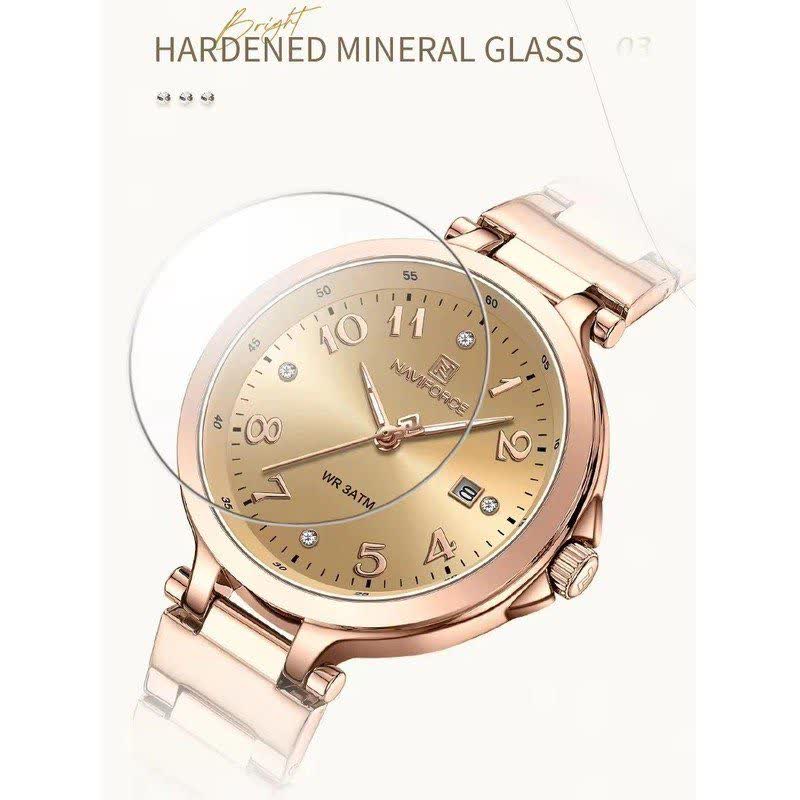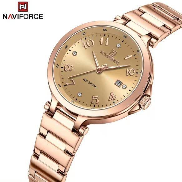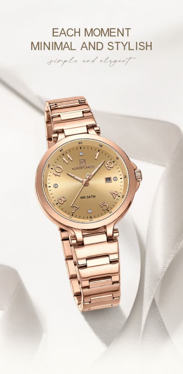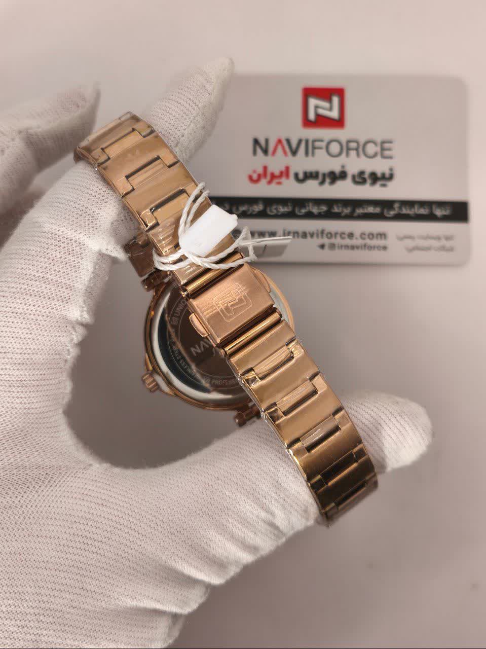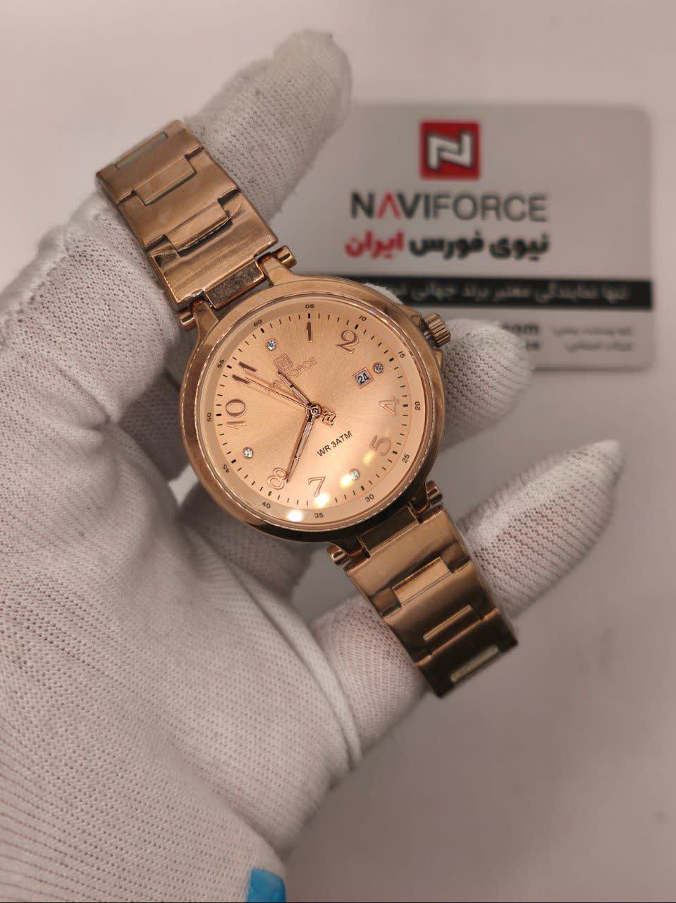 ساعت مچي عقربه اي زنانه نيوي فورس NAVIFORCE مدل Nf5033 رزگلد با رنگ بند و صفحه رزگلد طلایی جلوهای ظریف و لوکس به استایل شما میبخشد. این مدل با موتور ژاپن و قابلیت تقویم دار دقت بالا را در کنار طراحی صفحه الماس کاری و فرم صفحه دایره ای ارائه میدهد و عقربه شب نما خوانایی را در نور کم آسان میکند. قاب استیل مقاوم به همراه بند استیل رنگ ثابت و بند ضد حساسیت پوستی دوام و راحتی را همزمان فراهم میسازد. شیشه معدنی ضد خش خاصیت ضد آب و قفل کلیپسی ضامن دار کیفیت و امنیت استفاده را تضمین میکند. این محصول ارجینال با کارت گارانتی و جعبه به همراه گارانتی نیوی فورس ایران از فروشگاه اینترنتی روبی مد عرضه میشود تا با اطمینان خرید کنید.