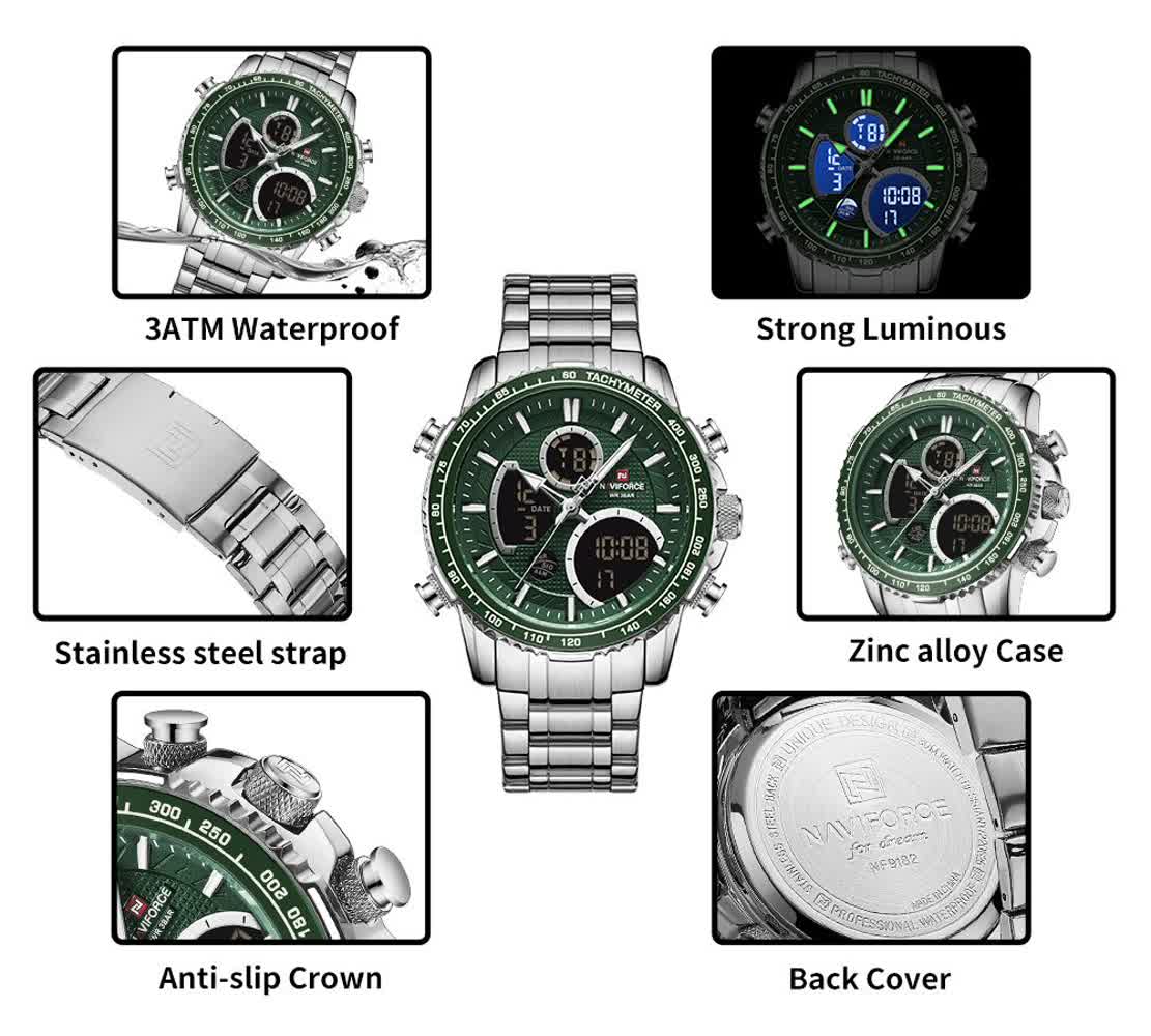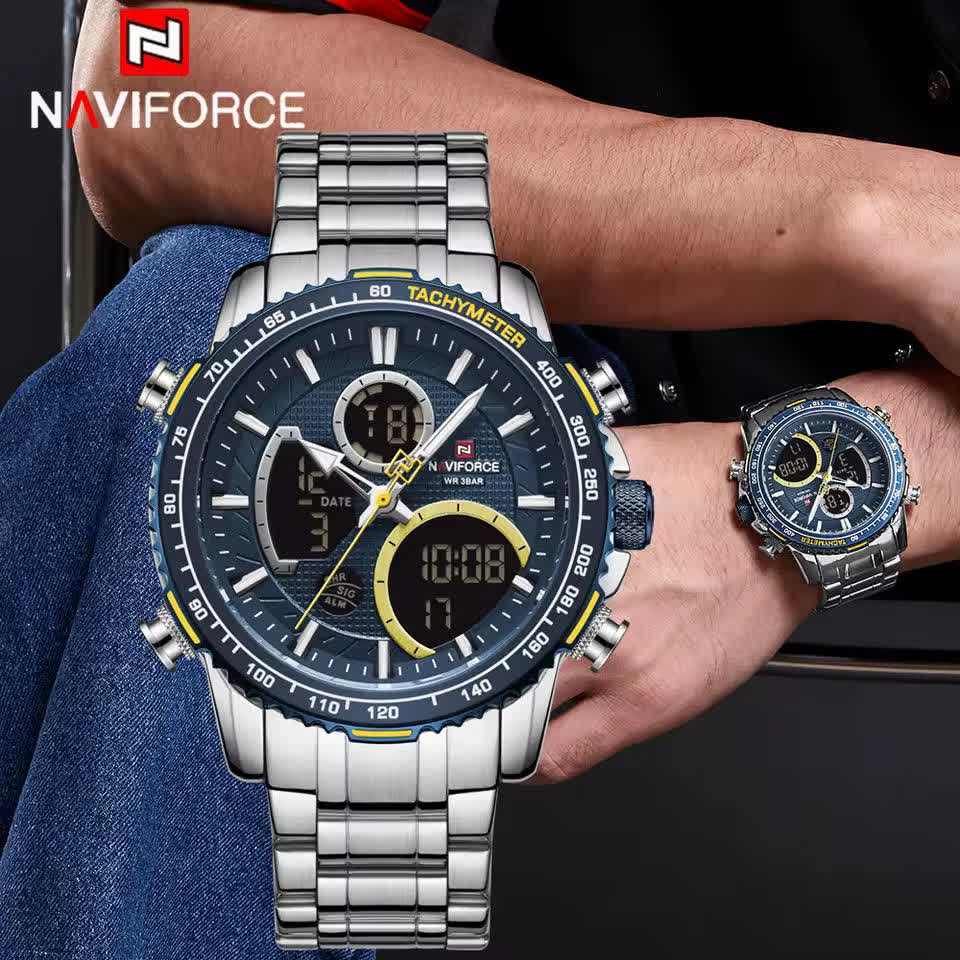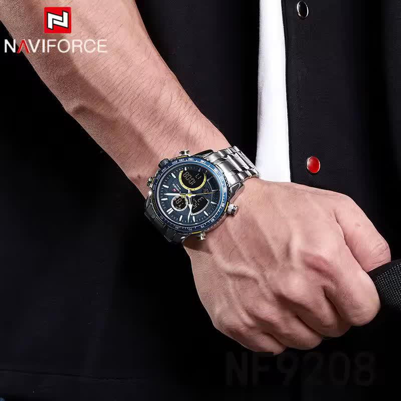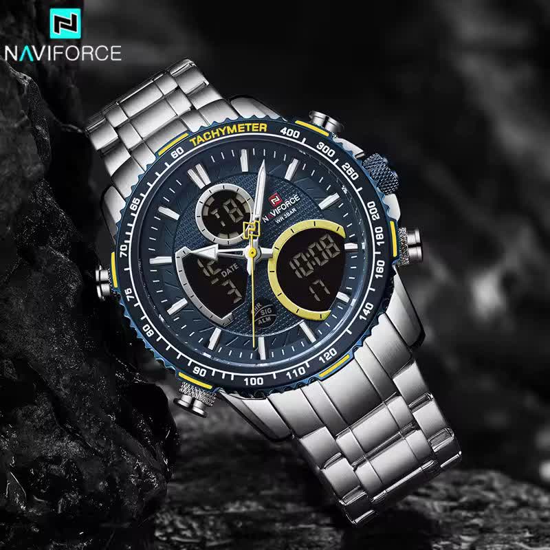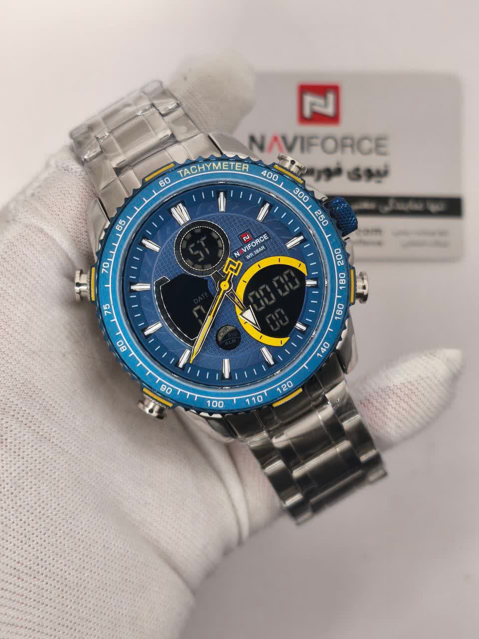 ساعت مچي مردانه عقربه اي و ديجيتال نيوي فورس NAVIFORCE مدل NF9182 موتور ژاپني آبي با رنگ بند نقره ای و صفحه آبی ترکیبی جذاب و مدرن برای آقایان خوش استایل است. این مدل با نمایشگر هم آنالوگ هم دیجیتال و موتور ژاپن تکنولوژی کوارتز دقت موتور بالا را در کنار تقویم دار بودن ثانیه شمار آلارم و امکانات کاربردی دیگر ارائه میدهد. قاب استیل مقاوم به همراه بند استیل ضد زنگ توپُر سنگین و بند ضد حساسیت پوستی با قفل کلیپسی ضامن دار راحتی و استحکام را همزمان فراهم میکند. شیشه معدنی ضد خش چراغ دید در شب و خاصیت ضد آب آن را به گزینهای ایدهآل برای استفاده روزمره و ورزشی تبدیل کرده است. این محصول ارجینال با کارت گارانتی و جعبه به همراه گارانتی نیوی فورس ایران از فروشگاه اینترنتی روبی مد عرضه میشود تا با اطمینان خرید کنید.