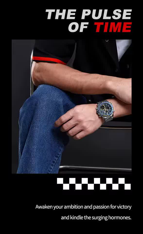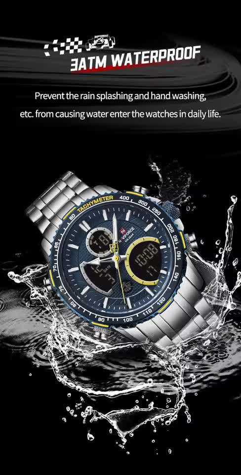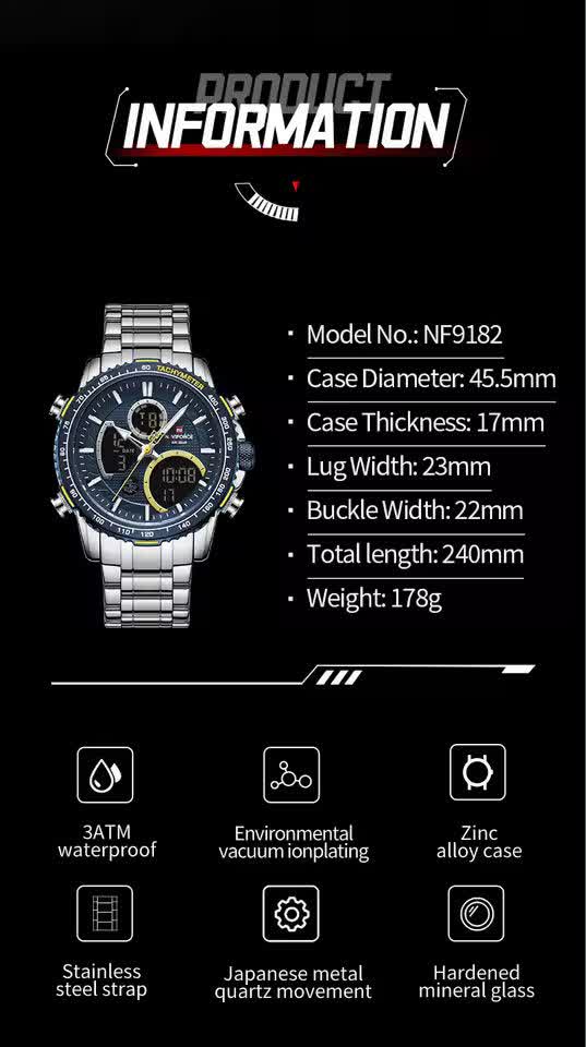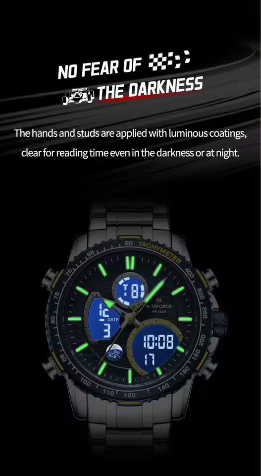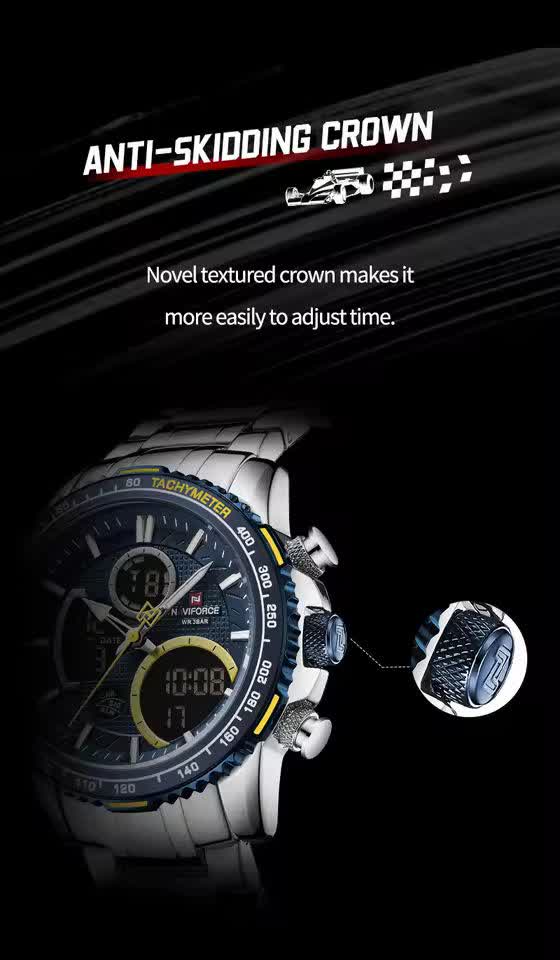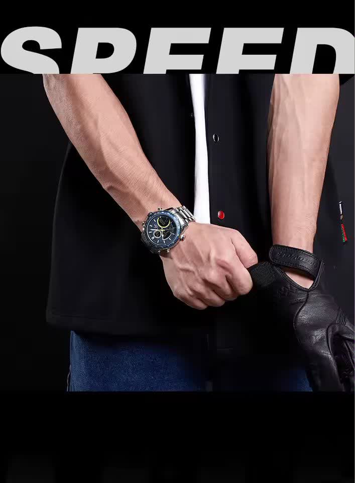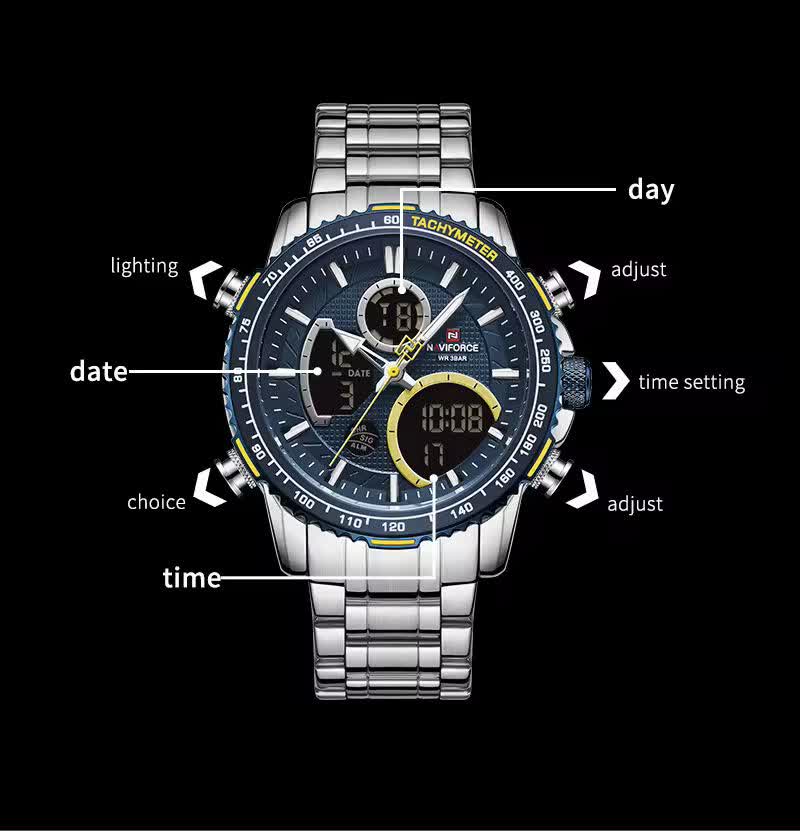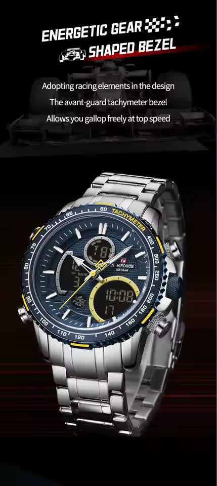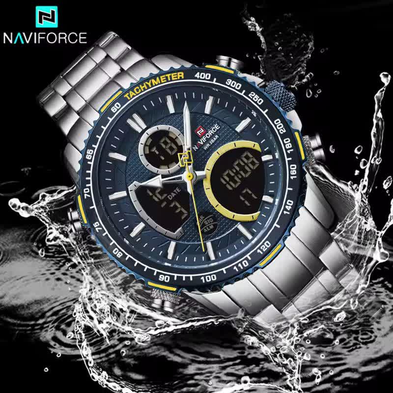 ساعت مچي مردانه عقربه اي و ديجيتال نيوي فورس NAVIFORCE مدل NF9182 موتور ژاپني آبي با رنگ بند نقره ای و صفحه آبی ترکیبی جذاب و مدرن برای آقایان خوش استایل است. این مدل با نمایشگر هم آنالوگ هم دیجیتال و موتور ژاپن تکنولوژی کوارتز دقت موتور بالا را در کنار تقویم دار بودن ثانیه شمار آلارم و امکانات کاربردی دیگر ارائه میدهد. قاب استیل مقاوم به همراه بند استیل ضد زنگ توپُر سنگین و بند ضد حساسیت پوستی با قفل کلیپسی ضامن دار راحتی و استحکام را همزمان فراهم میکند. شیشه معدنی ضد خش چراغ دید در شب و خاصیت ضد آب آن را به گزینهای ایدهآل برای استفاده روزمره و ورزشی تبدیل کرده است. این محصول ارجینال با کارت گارانتی و جعبه به همراه گارانتی نیوی فورس ایران از فروشگاه اینترنتی روبی مد عرضه میشود تا با اطمینان خرید کنید.