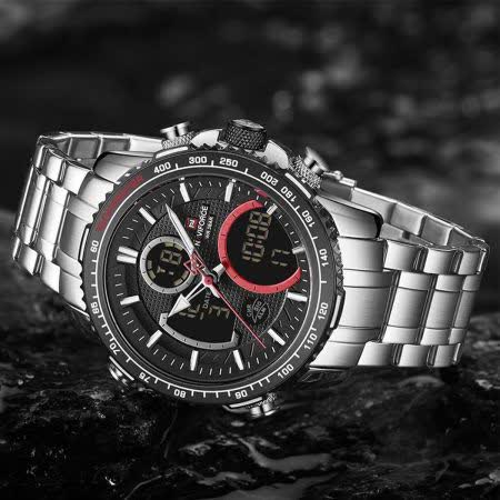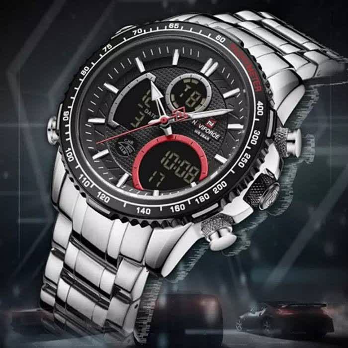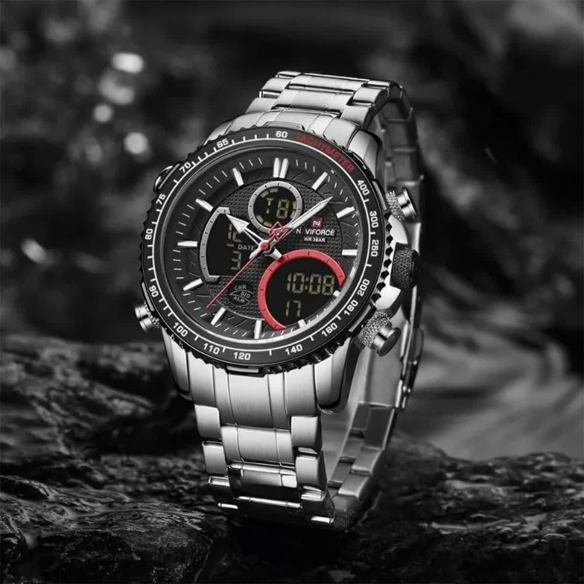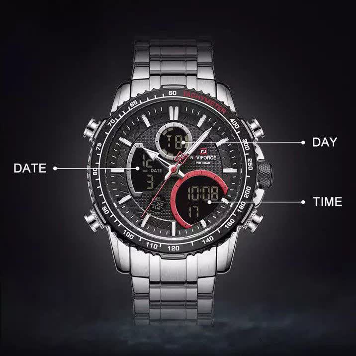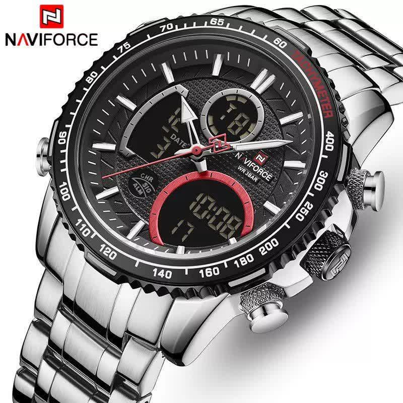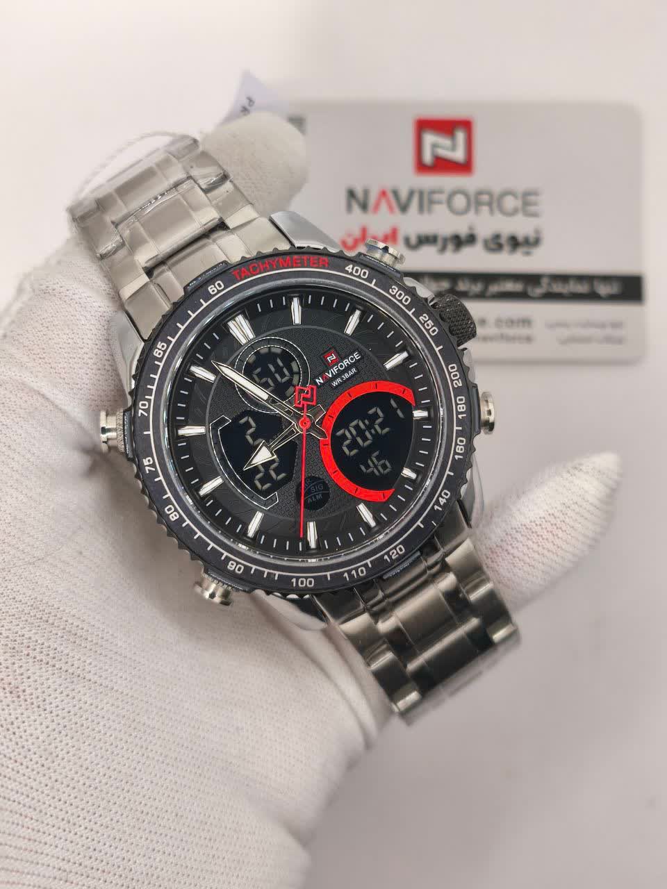 ساعت مچي مردانه عقربه اي و ديجيتال نيوي فورس NAVIFORCE مدل NF9182 موتور ژاپني مشکي با رنگ بند نقره ای و صفحه مشکی طراحی شیک و قدرتمندی برای استایل رسمی و اسپرت ارائه میدهد. این مدل با نمایشگر هم آنالوگ هم دیجیتال و موتور ژاپن تکنولوژی کوارتز دقت موتور بالا را در کنار تقویم دار بودن ثانیه شمار آلارم و امکانات کاربردی دیگر فراهم میکند. قاب استیل مقاوم به همراه بند استیل ضد زنگ توپُر سنگین و بند ضد حساسیت پوستی با قفل کلیپسی ضامن دار دوام و راحتی بالایی ایجاد میکند. شیشه معدنی ضد خش چراغ دید در شب و خاصیت ضد آب آن را به گزینهای ایدهآل برای استفاده روزمره و فعالیتهای مختلف تبدیل کرده است. این محصول ارجینال با کارت گارانتی و جعبه به همراه گارانتی نیوی فورس ایران از فروشگاه اینترنتی روبی مد عرضه میشود تا با اطمینان خرید کنید.