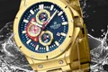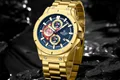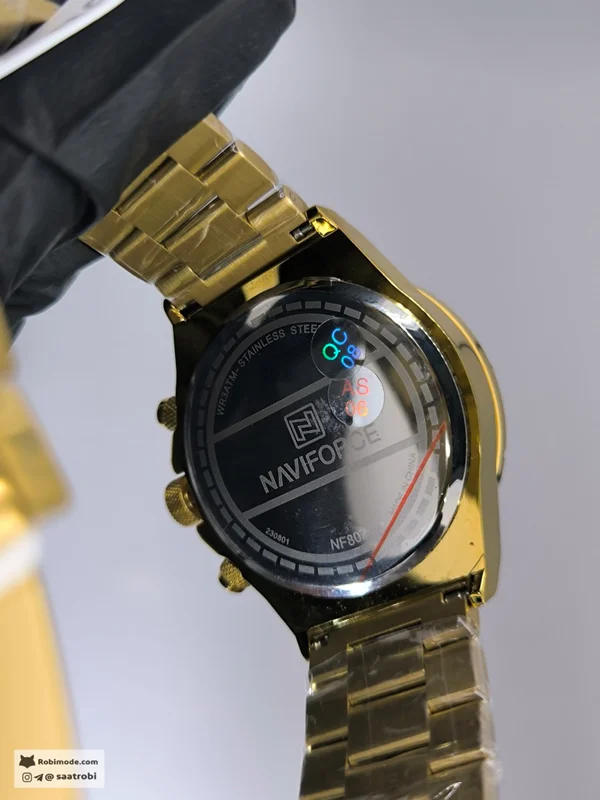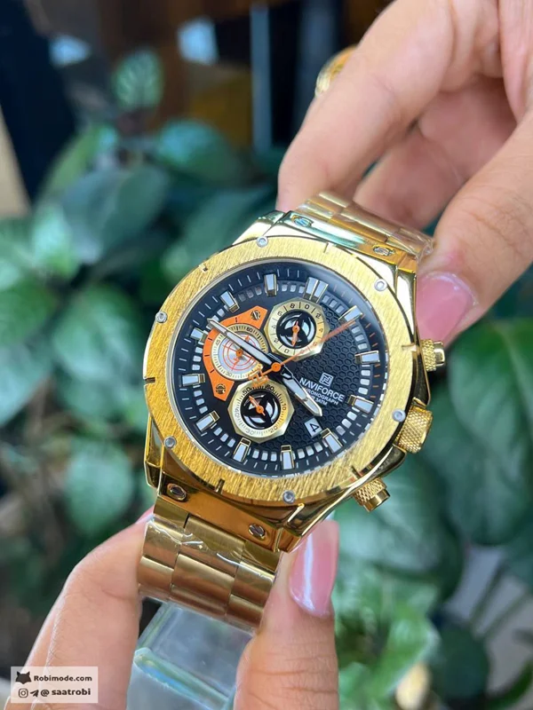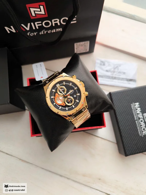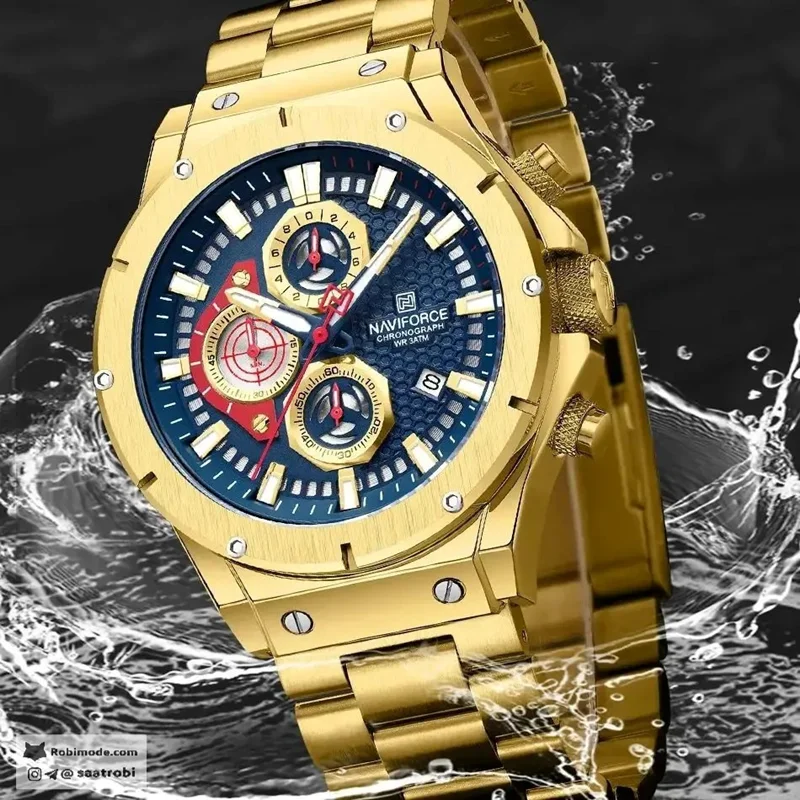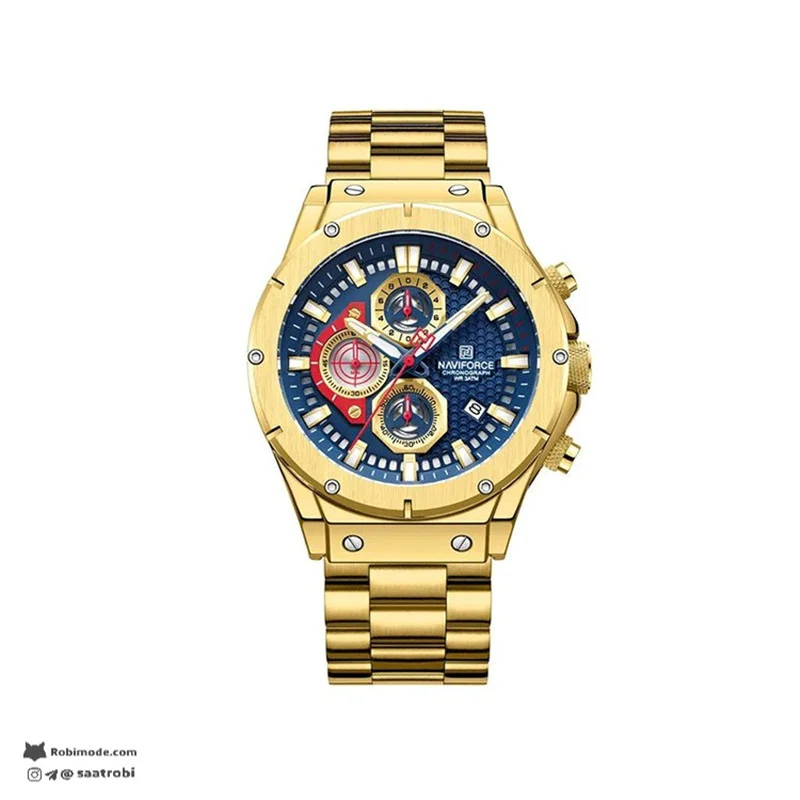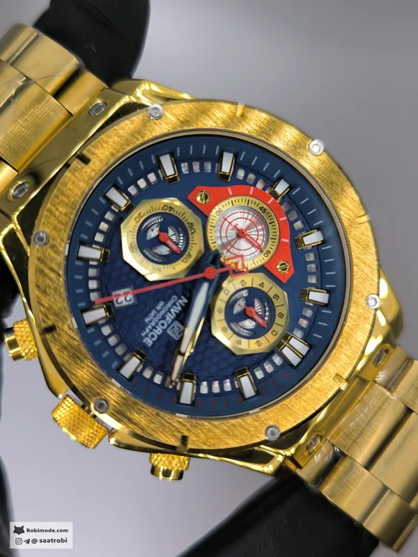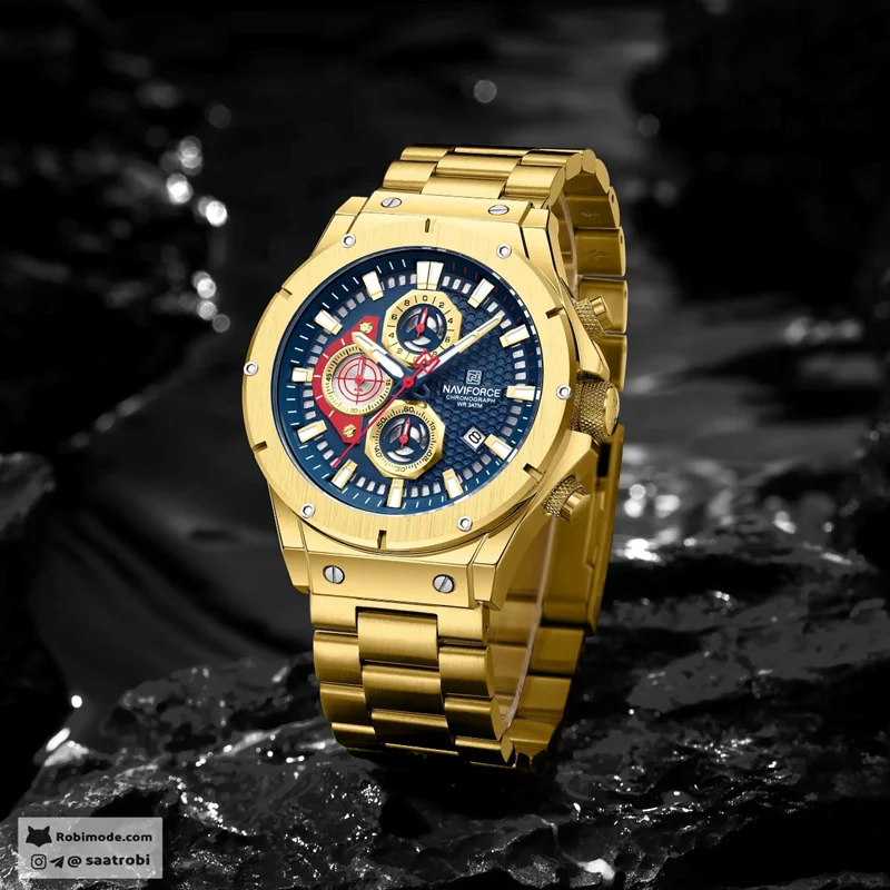 ساعت مچی مردانه ناویفورس با بند طلایی و صفحه آبی جذاب، ترکیبی از سبک کژوال، لوکس، فشن و خلبانی. دارای سه موتور فعال، کرنوگراف، تقویم، شبنما و موتور ژاپن کوارتز با دقت بالا. ساختهشده از فول استیل با رنگ ثابت، شیشه سافایر ضد خش و بند ضد حساسیت کلیپسی ضامندار. ضد آب، گارانتیدار و مناسب برای استایل خاص و حرفهای. خرید از فروشگاه روبی مد، انتخابی متمایز برای آقایان خوشسلیقه.