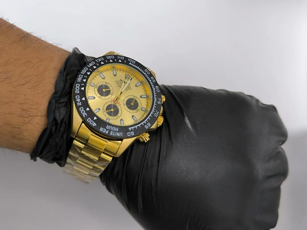 ساعت مردانه رولکس ROLEX رنگ طلایی با طراحی خاص و قاب کربنی انتخابی لوکس برای آقایانیست که به استایل و کیفیت اهمیت میدهند مجهز به کرنوگراف دقیق تاچیمتر حرفهای و روزشمار کاربردی است بند استیل مقاوم و قفل رولکسی دو قفله امنیت و راحتی را همزمان فراهم میکند شیشه کریستال ضدخش جلوهای شفاف و ماندگار به ساعت داده این مدل از طریق فروشگاه اینترنتی روبی مد عرضه میشود و یکی از محبوبترین انتخابها در دسته ساعتهای مردانه لوکس به شمار میرود.