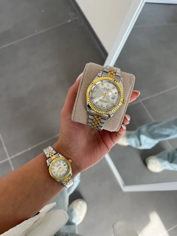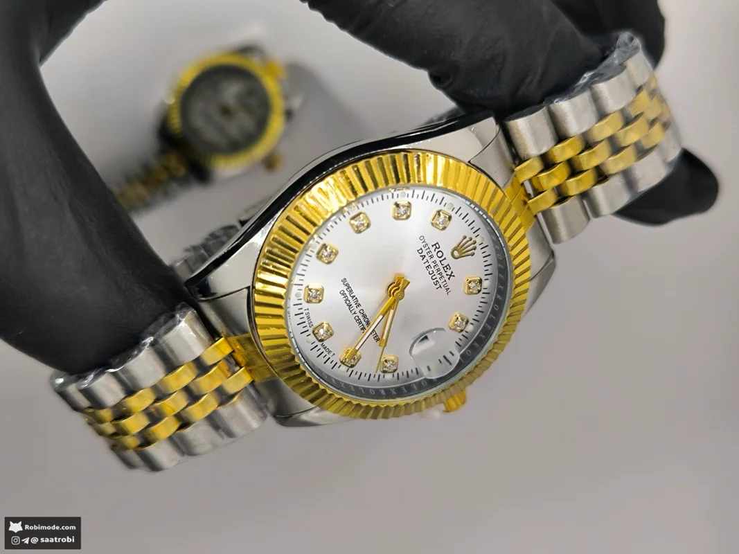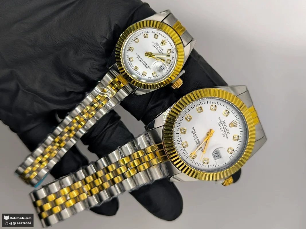ساعت ست رولکس دیت جاست با طراحی کلاسیک و صفحه برجسته نگیندار انتخابی لوکس و ماندگار برای زوجهاییست که به جزئیات اهمیت میدهند این مدل با پشت و سرکوک رولکسی واشر بندی دقیق و تقویم تلسکوپی عرضه شده و دارای روزشمار و رنگ ثابت است که در کنار کیفیت ساخت بالا جلوهای خاص به استایل شما میبخشد این محصول را از فروشگاه اینترنتی روبی مد تهیه کنید و با یک انتخاب شیک و هماهنگ بدرخشید.