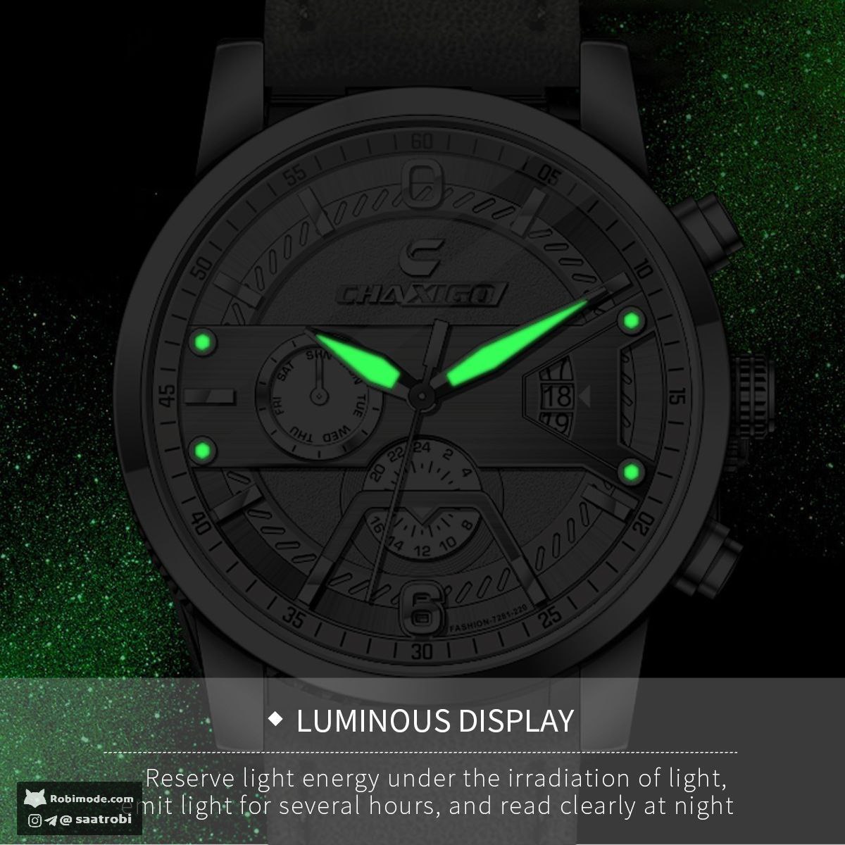 ساعت مچی مردانه چاکسیگو دژاوو CHAXIGO با طراحی کرنوگراف و برند شرکتی انتخابی خاص برای آقایان خوشسلیقه است این مدل با بند چرمی و قفل کمربندی راحتی و استحکام را همزمان ارائه میدهد دارای موتور کوارتز دقیق روز شمار و شیشه معدنی مقاوم در برابر ضربه و آب است قطر صفحه ۴۳ میلیمتر و ضخامت ۱۱ میلیمتر بوده و رنگ آن ثابت میماند همراه با کارت گارانتی معتبر از فروشگاه اینترنتی روبی مد عرضه میشود.