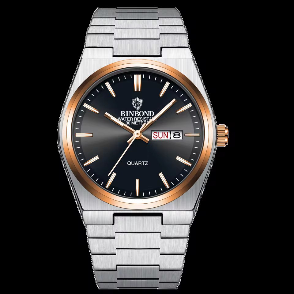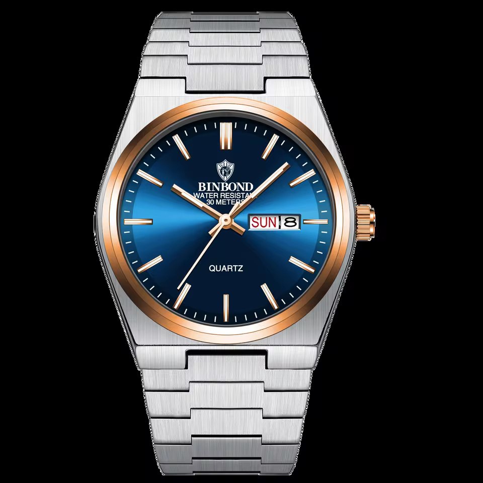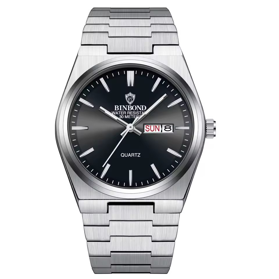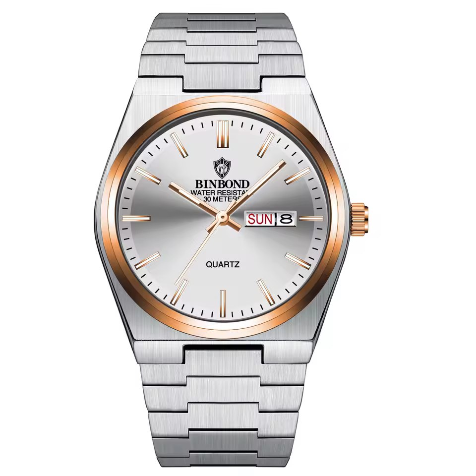 ساعت مچی عقربه ای مردانه بین باند BIN BOND ارجینال با طراحی شرکتی و عرضه در شش رنگ متنوع انتخابی خاص برای استایلهای روزمره و رسمی است این مدل با بند استیل فولاد قفل دو پروانه و موتور کوارتز دقیق عرضه شده و دارای قطر صفحه ۴۴ میلیمتر و ضخامت ۱۱ میلیمتر است شیشه سافایر ضدخش قابلیت شبنما نمایش ایام هفته و روز شمار از ویژگیهای کاربردی آن است همچنین مقاومت در برابر آب و کارت گارانتی معتبر خیال شما را از بابت کیفیت راحت میکند این محصول از طریق فروشگاه اینترنتی روبی مد قابل تهیه است.